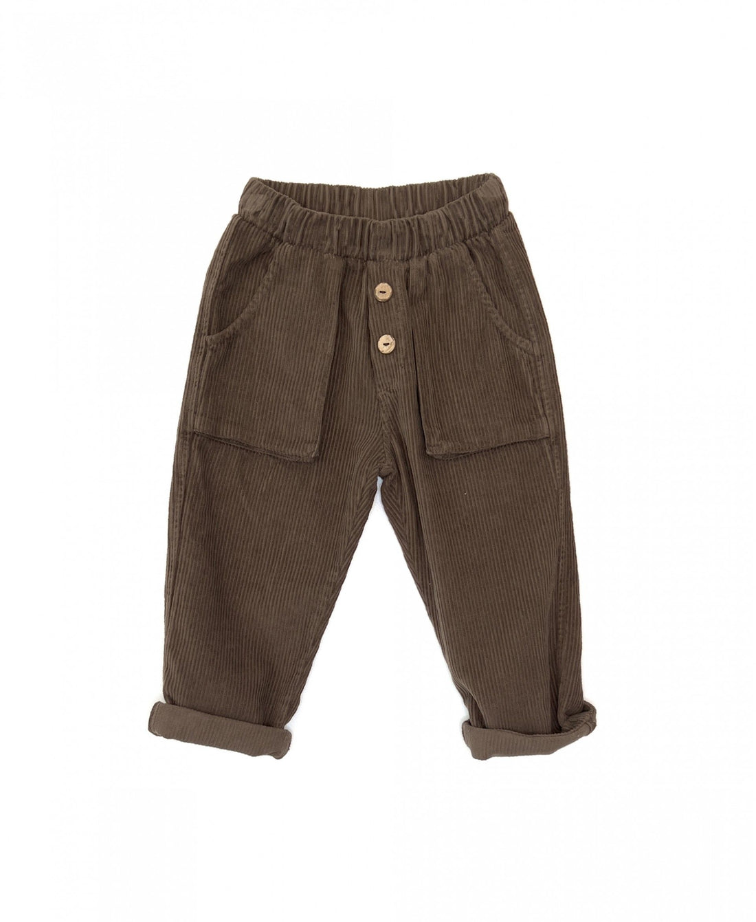 هذا البنطلون مصنوع من قماش القطن العضوي، لون الجذور. يتميز النموذج بخصر مرن وأزرار جوز...