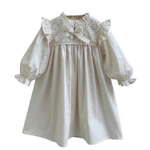 Romantic and charming, this ivory dress features a large, delicate bow at the front and...