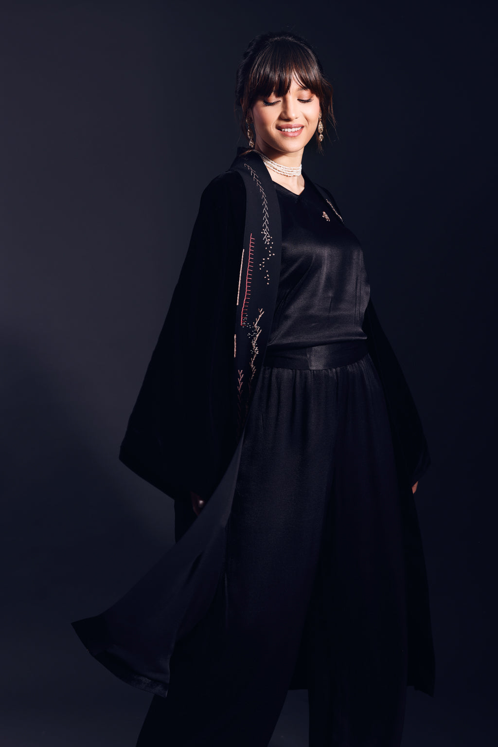 اكشفي عن أناقتك مع تنورتنا الرائعة من التول الأسود المزينة بتطريزات مغربية معقدة بخيوط ذهبية...