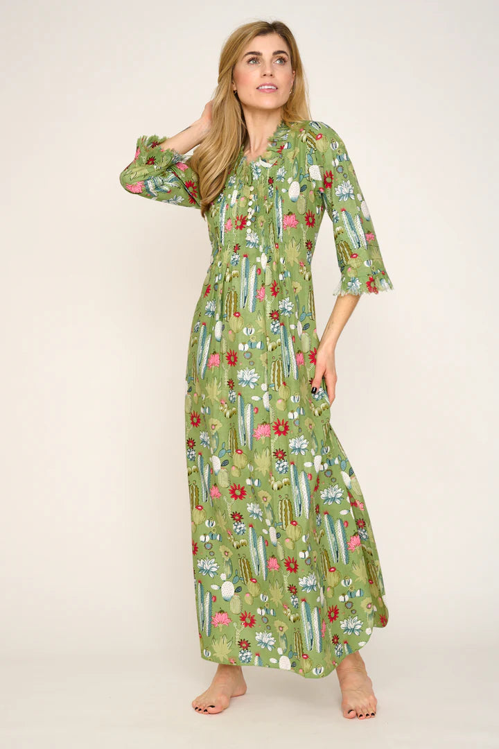 Cotton Annabel Maxi Dress in Green with White & Blue Flowe