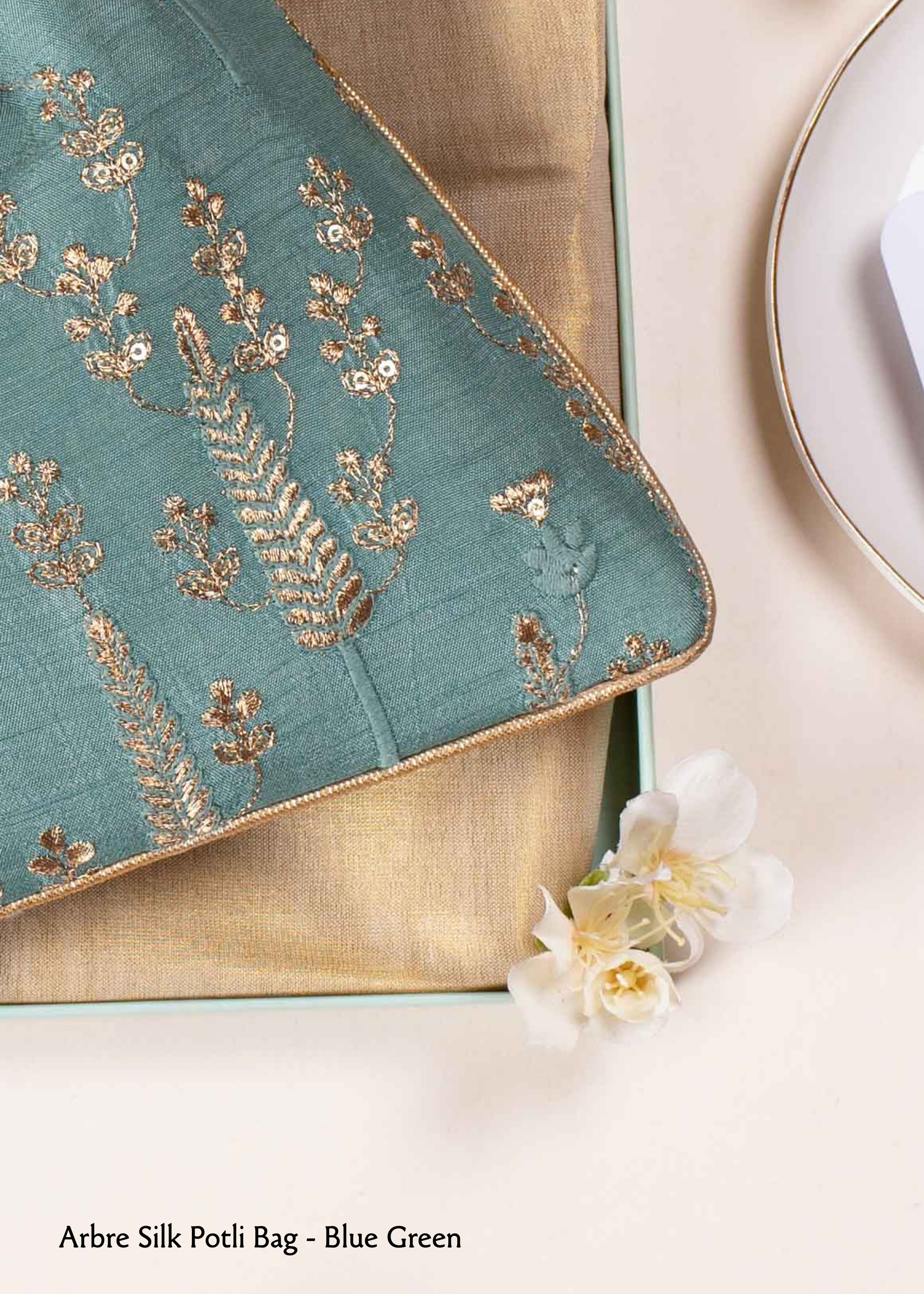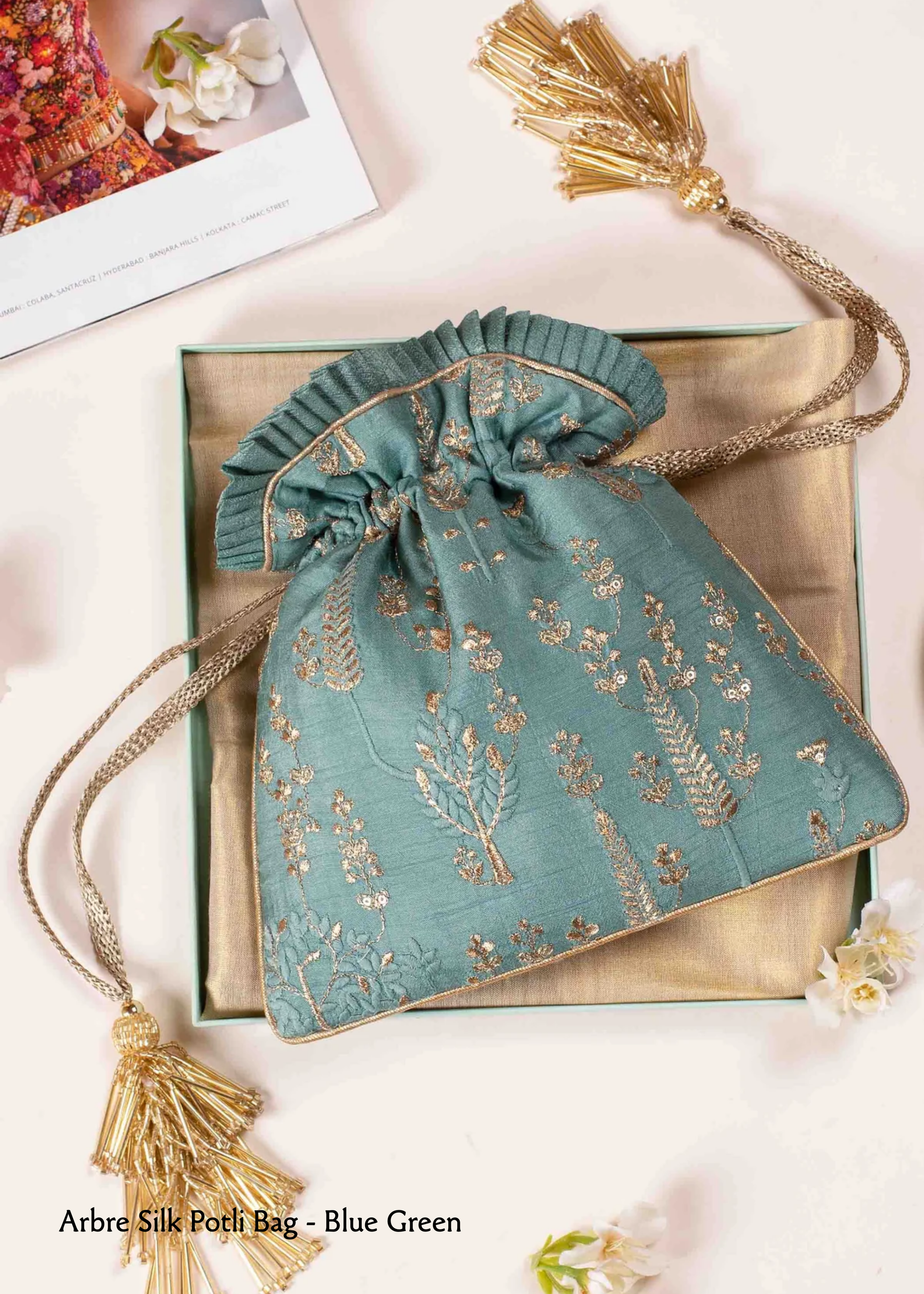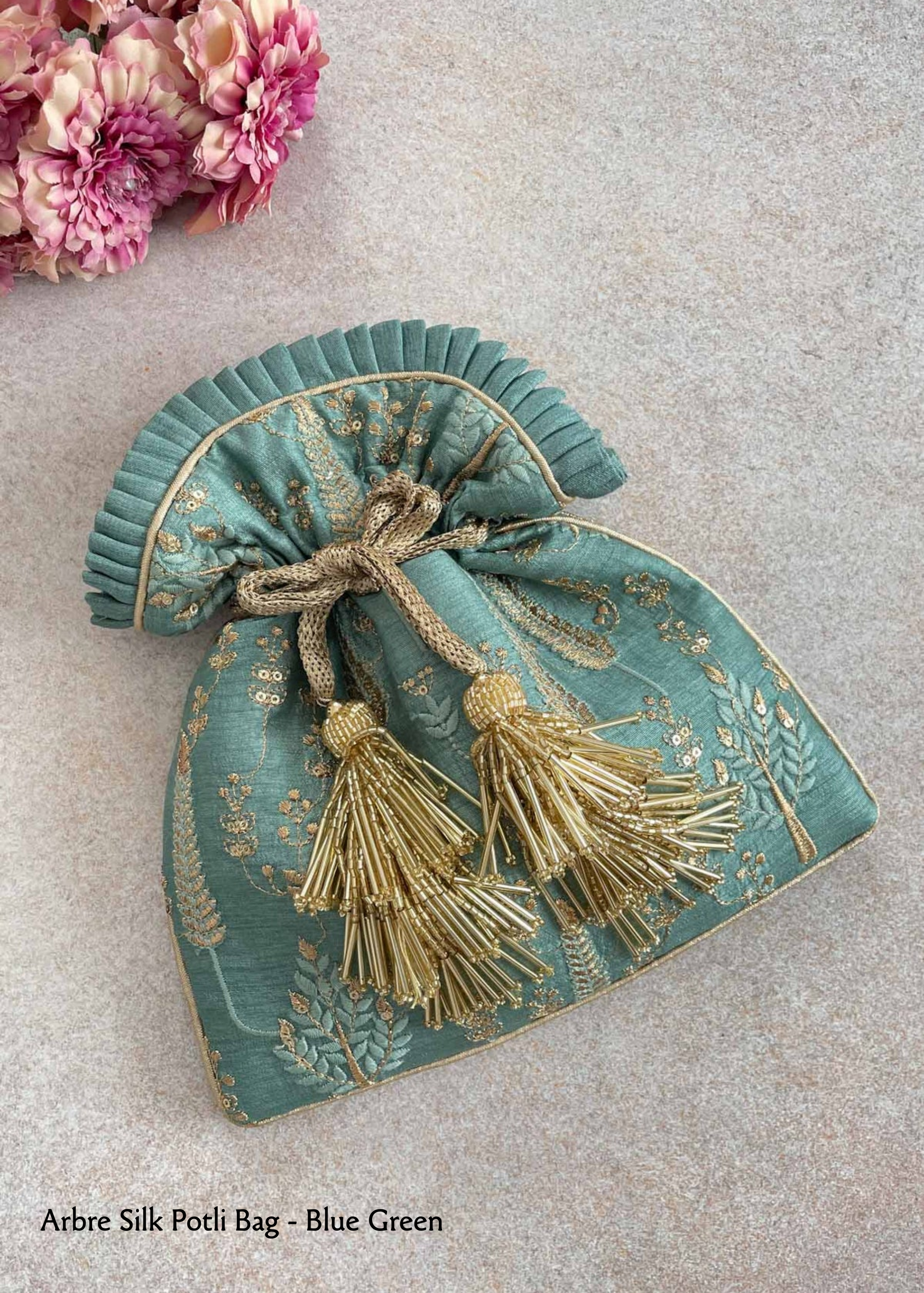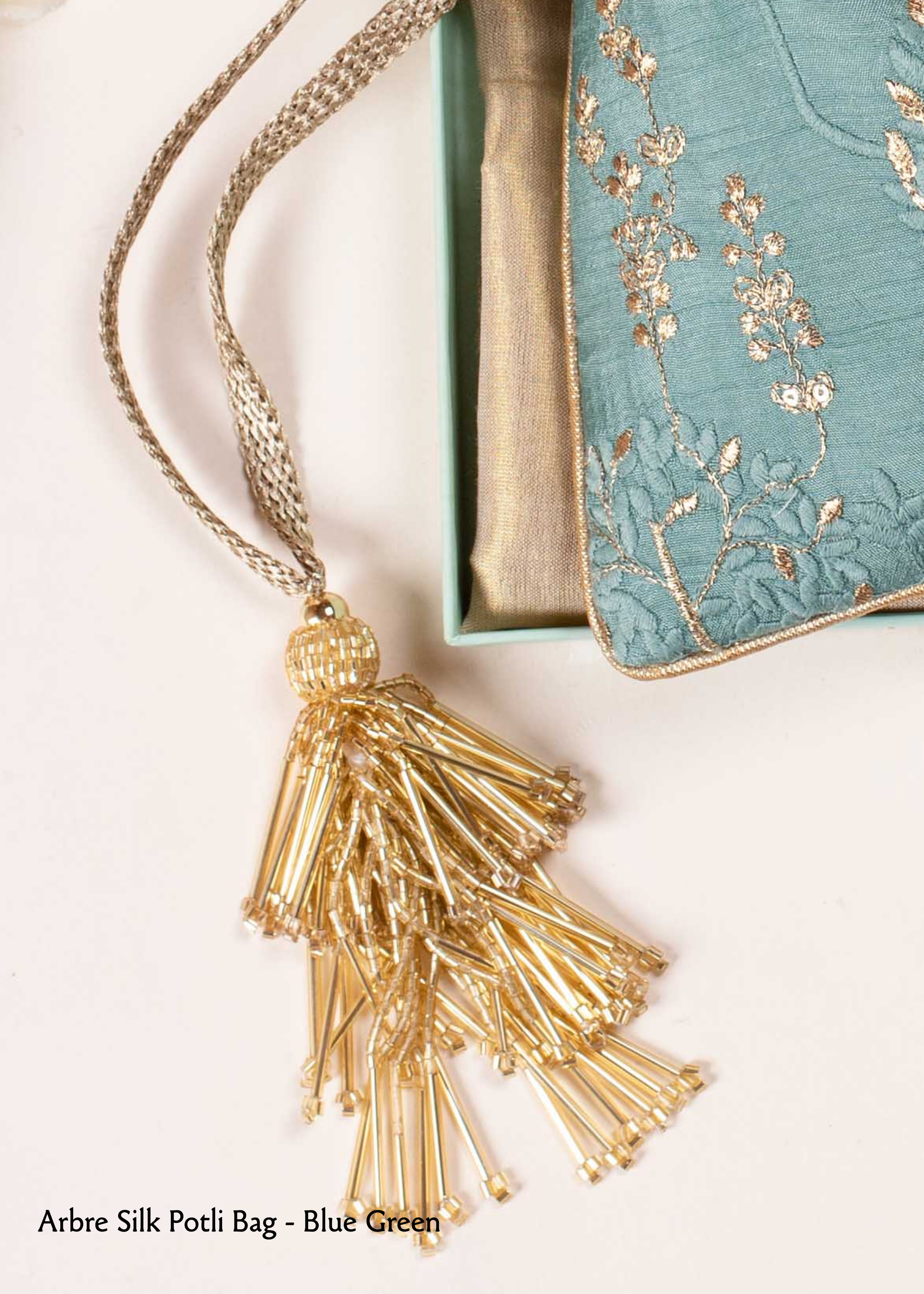 A luxurious blue-green potli crafted with intricate embroidery and finished with a delicate pleather fringe border. This handcrafted piece blends timeless elegance with a modern pastel charm. The shimmering cutdana tassels and woven golden drawstrings add a refined, sophisticated touch to any outfit.