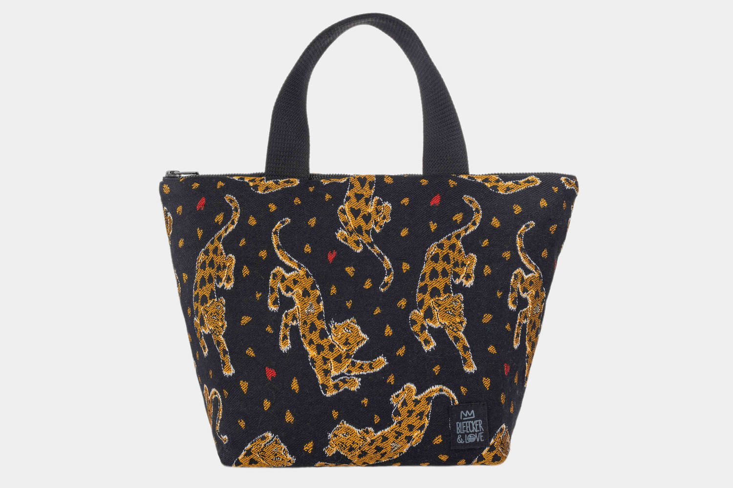 Our Bleecker & Love tote bag is made of textile woven material with waterproof lining, top handles, zipper closure and 2 interior pockets.