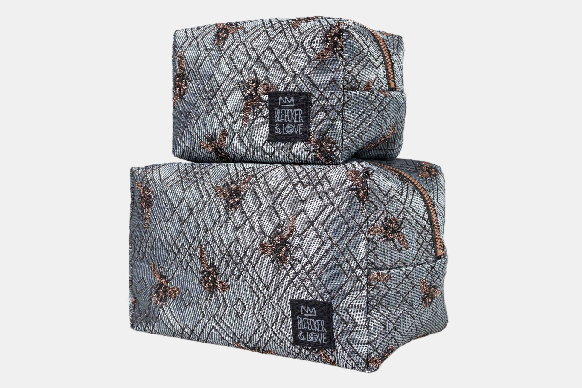The cosmetics pouch has interior waterproof lining and top zipper closure.