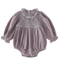 A breath of softness and poetry in this waffle cotton gauze romper, in a sublime smoky lavender tone. The embroidered bib and delicately scalloped tulle collar give it an irresistible old-world charm.