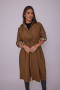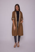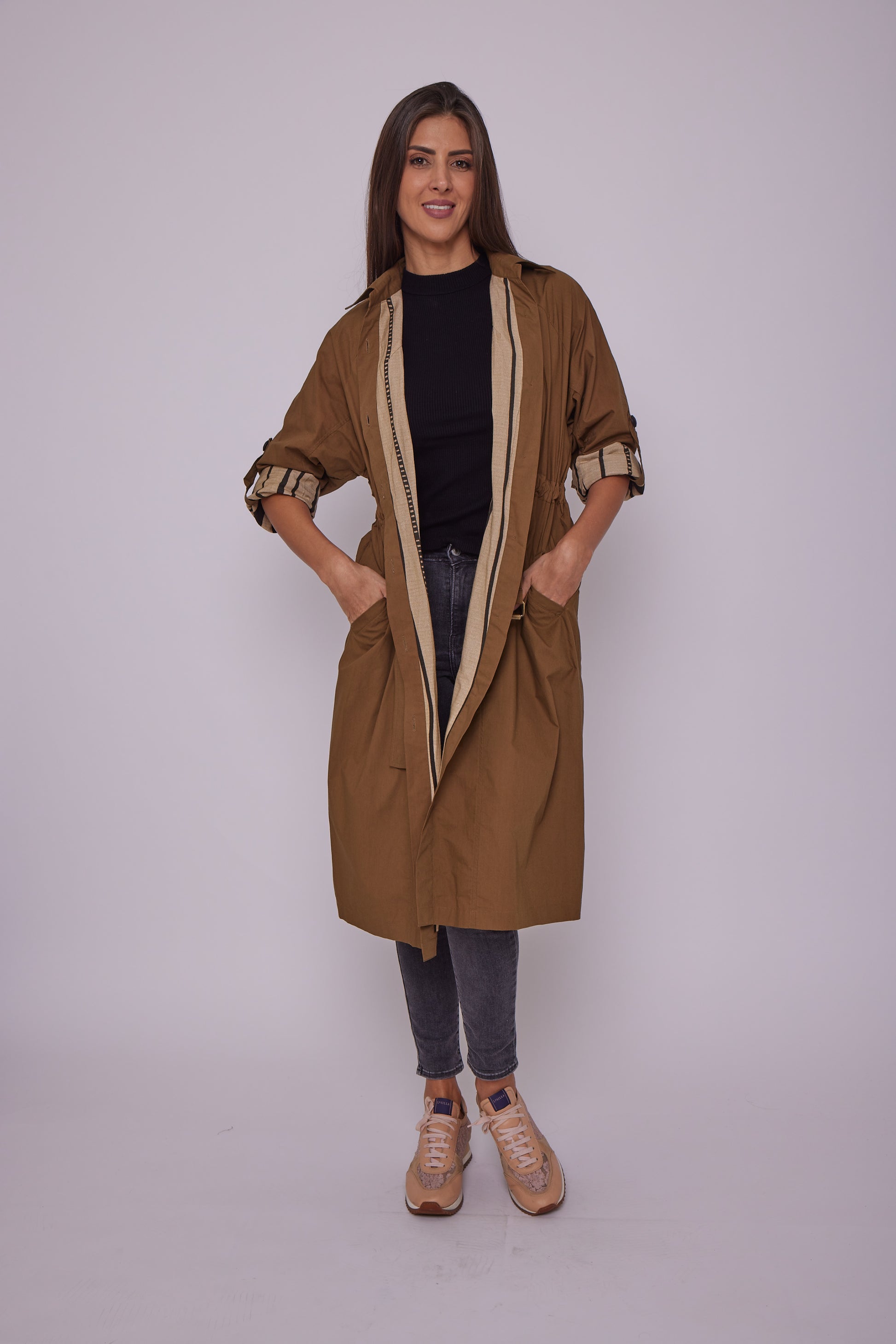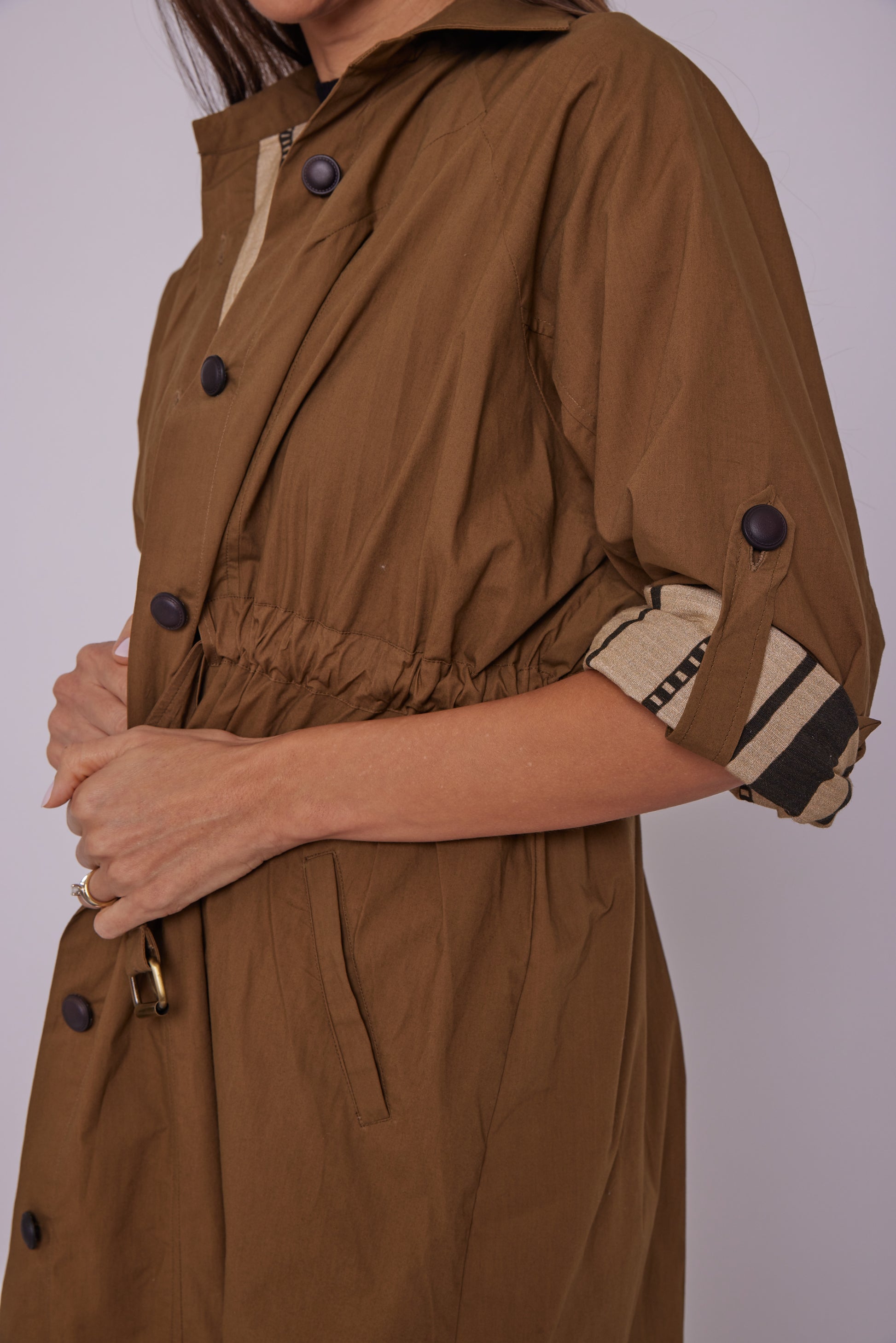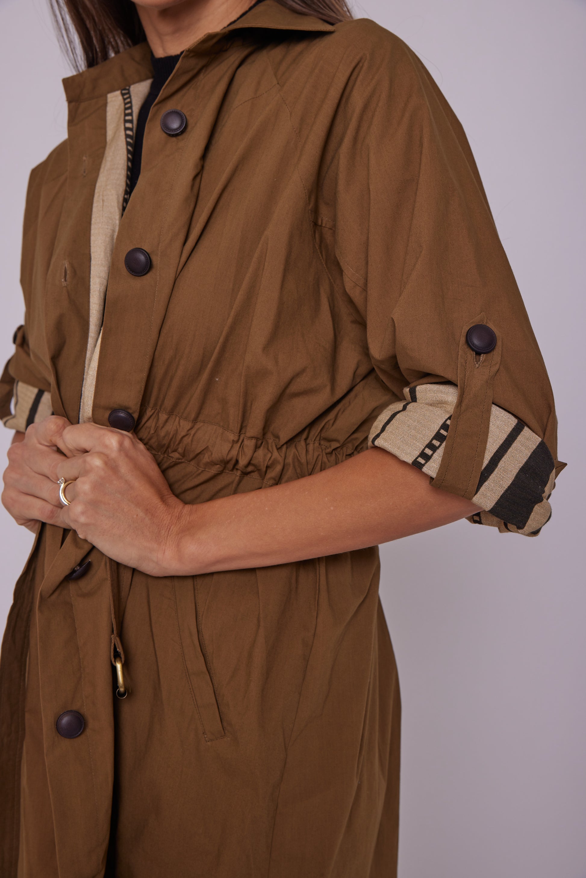 Brown long jacket with drawcord waist band and roll over sleeves.