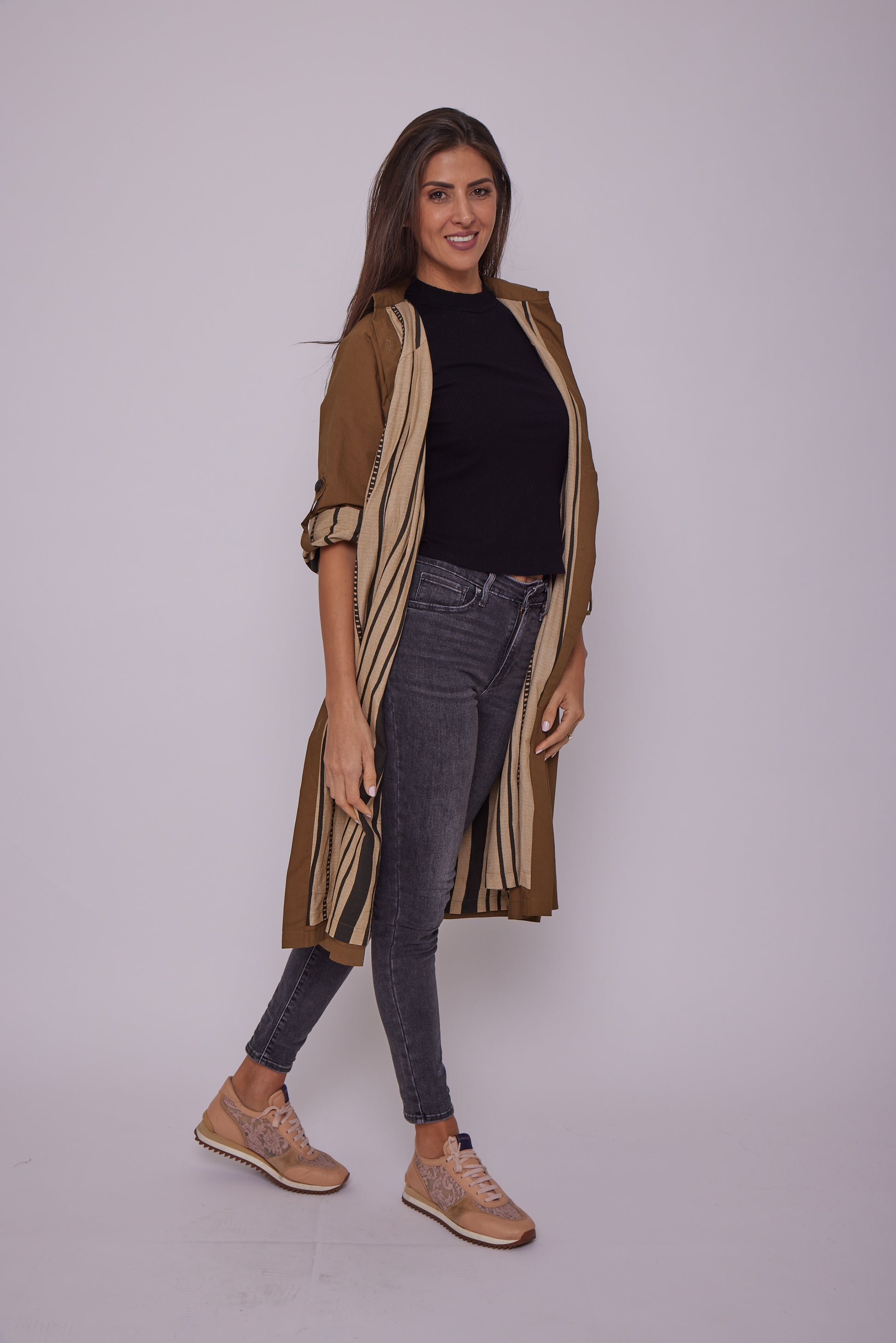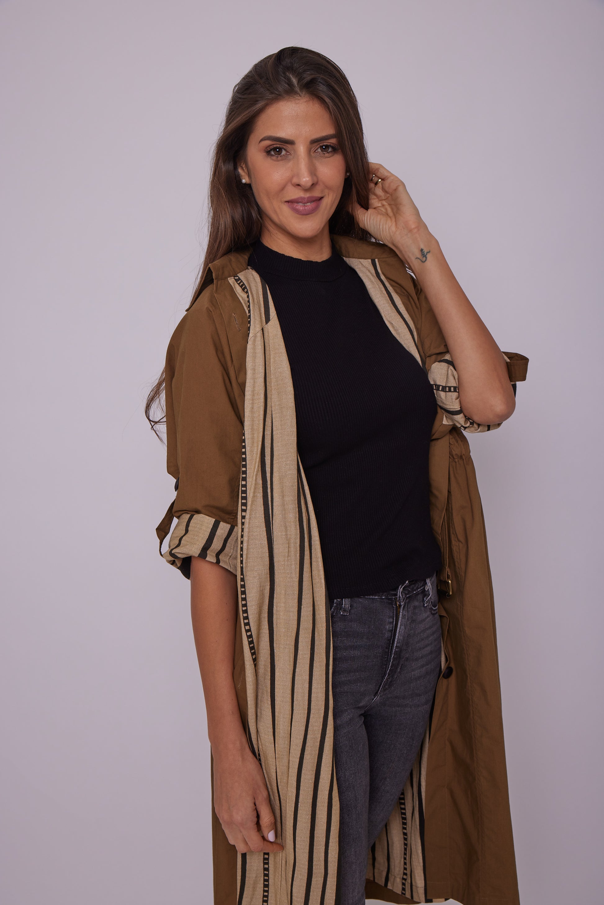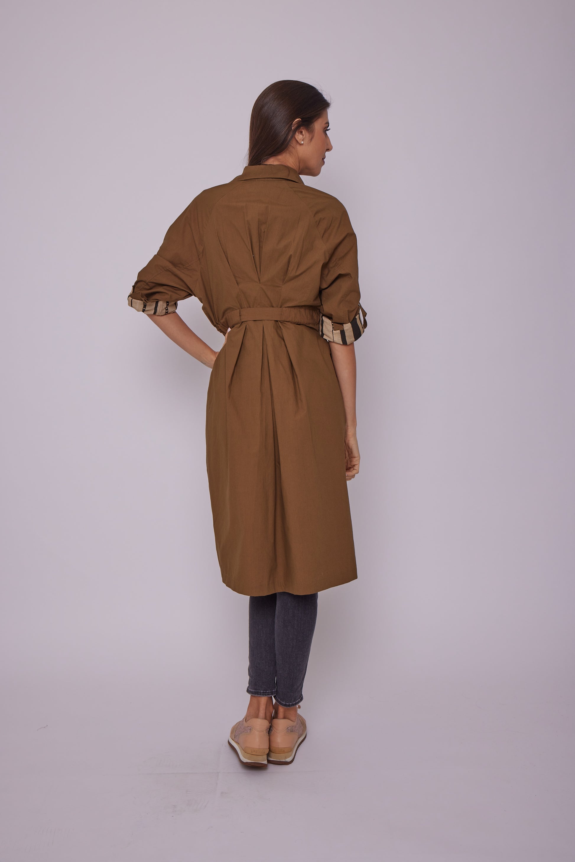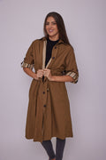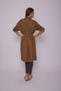 Brown long jacket with drawcord waist band and roll over sleeves.