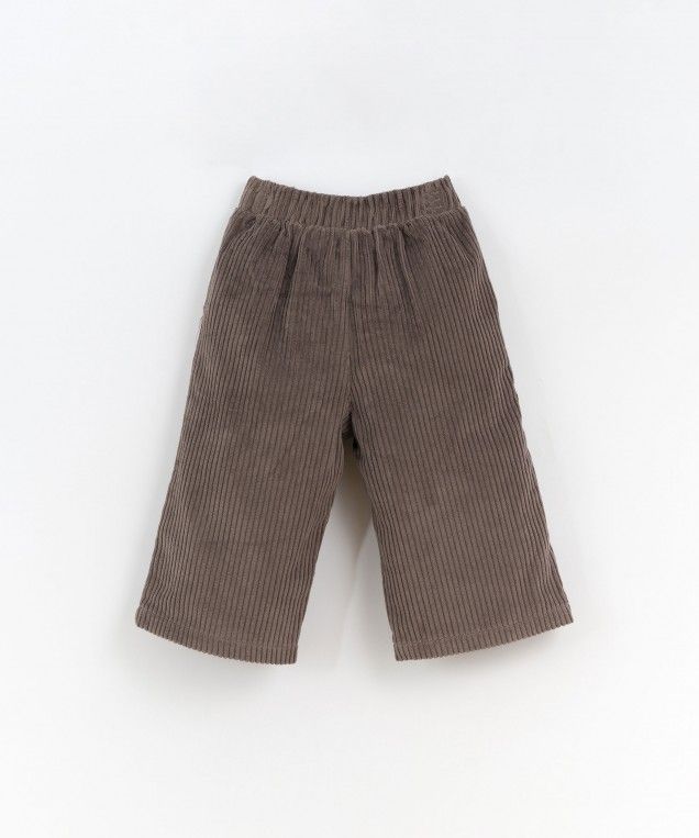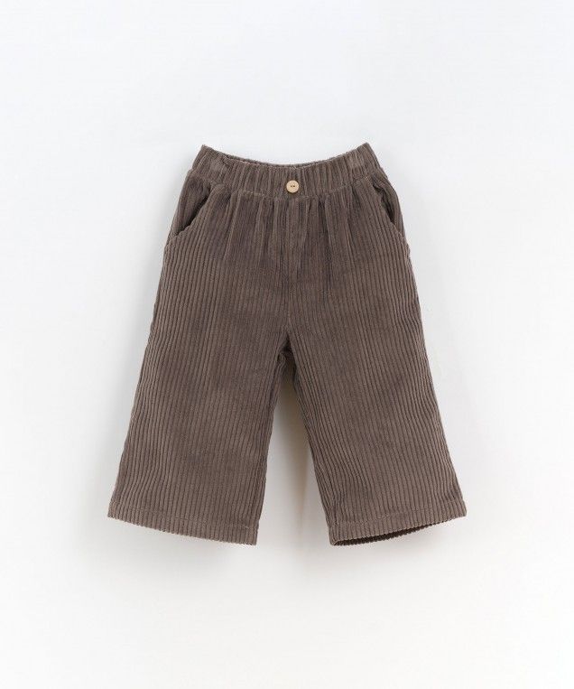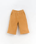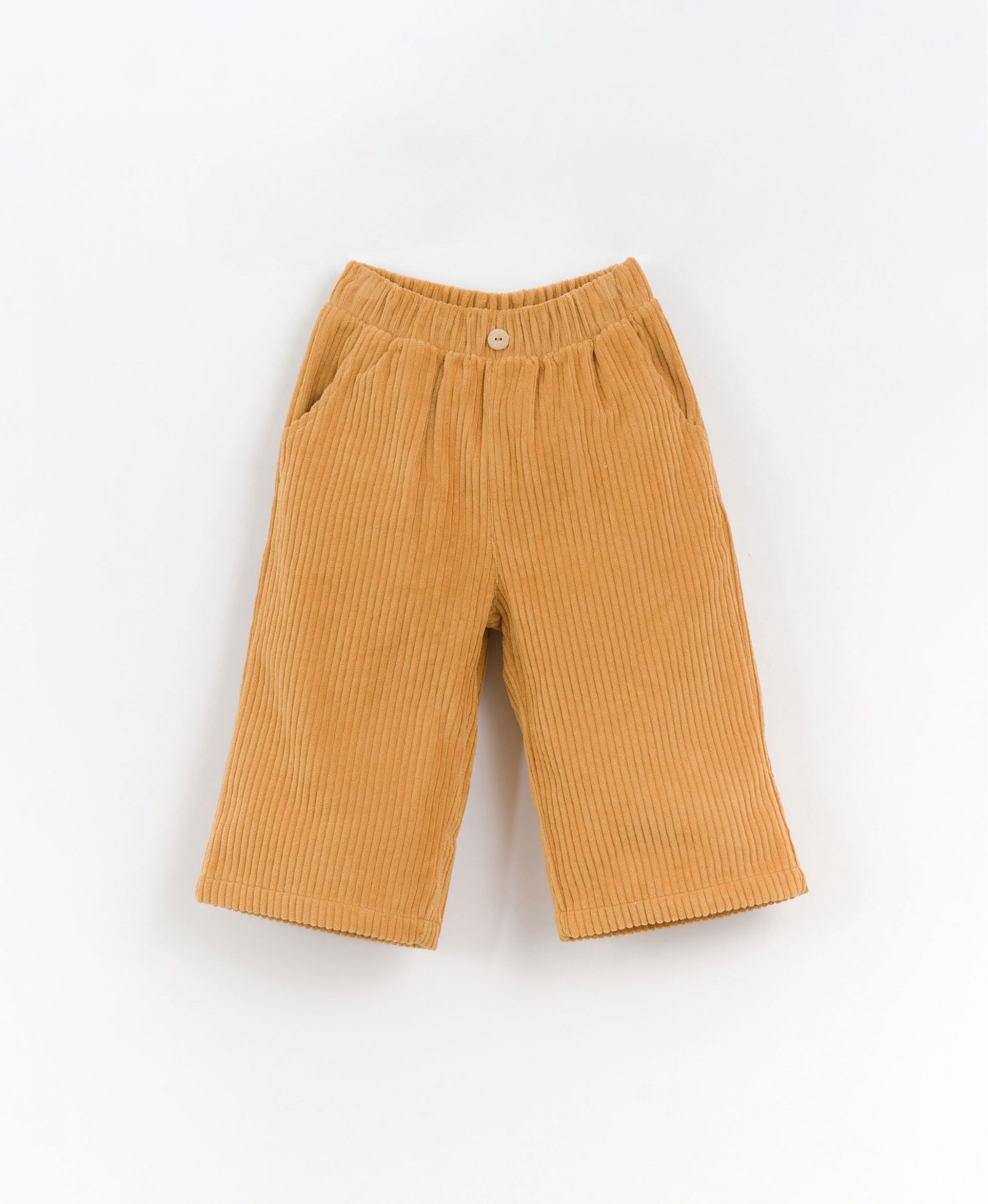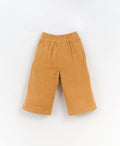 هذا البنطلون القماشي مصنوع من مزيج من القطن والقطن المعاد تدويره، بلون الشوفان. يتميز النموذج بخصر مرن وزر خشبي مزخرف وجيوب أمامية
