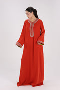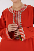 A timeless red Kandora crafted in soft-flowing georgette, designed to blend Emirati elegance with subtle traditional artistry. This piece features intricate Sfifa Maalam and Talli embellishments along the neckline, front panel, and cuffs—adding a refined touch of heritage craftsmanship to a clean, modern silhouette.