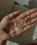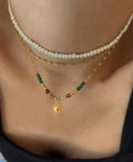 This beaded necklace features a dainty gold chain adorned with stunning green beads and multi-colored beads. The pendant itself resembles a radiant sun, with its vibrant hues and captivating design.