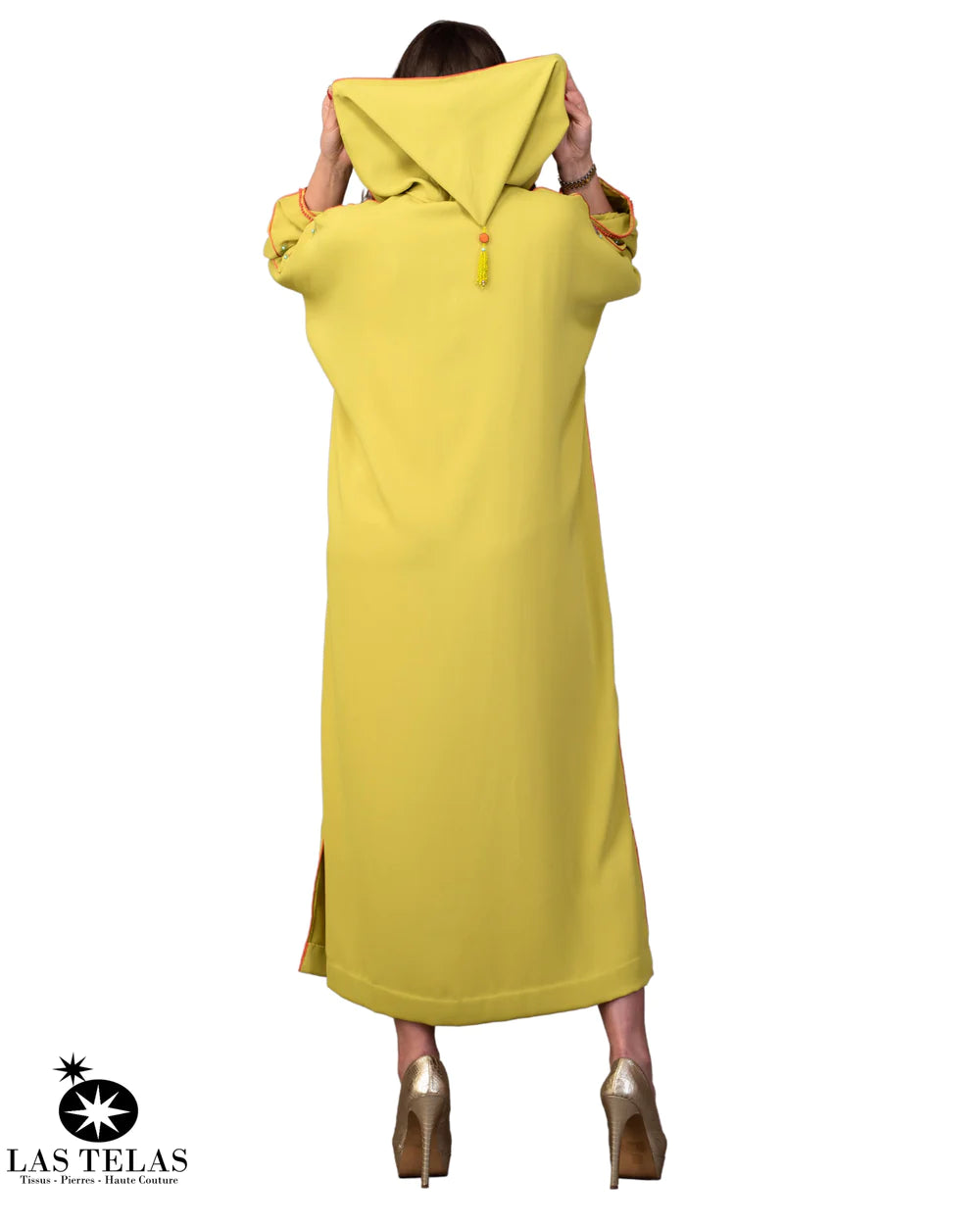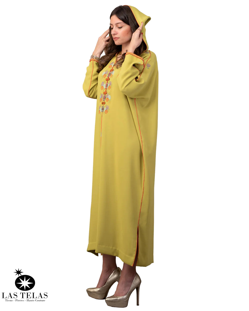 صممت مصممة شركتنا بشرى الفيلالي لحلو هذه الجلابة التقليدية بلمسة عصرية. هذا القفطان المغربي ذو اللون الأصفر النابض بالحياة ومثالي لأي مناسبة. كما أنها مطرزة يدوياً لإضفاء المزيد من الأناقة عليها.
