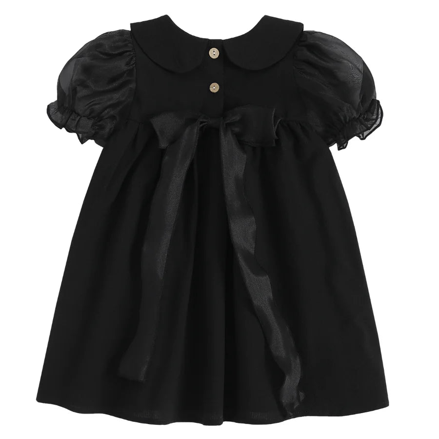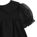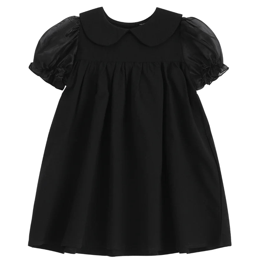 Elegant and bold, this black children's dress combines a classic Peter Pan collar with voile balloon sleeves for a chic and modern look. Its loose, flowing cut ensures optimal comfort while enhancing every movement.