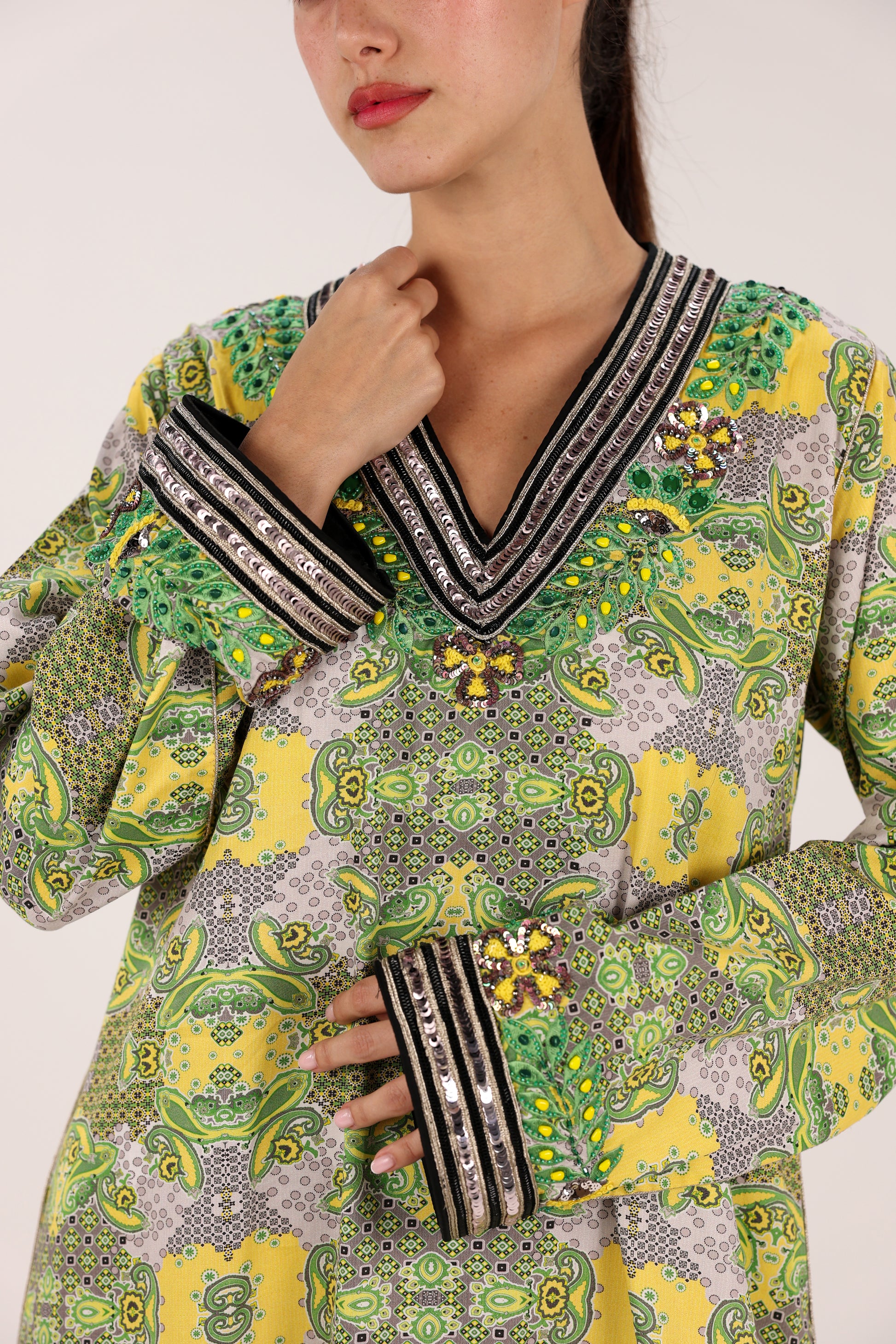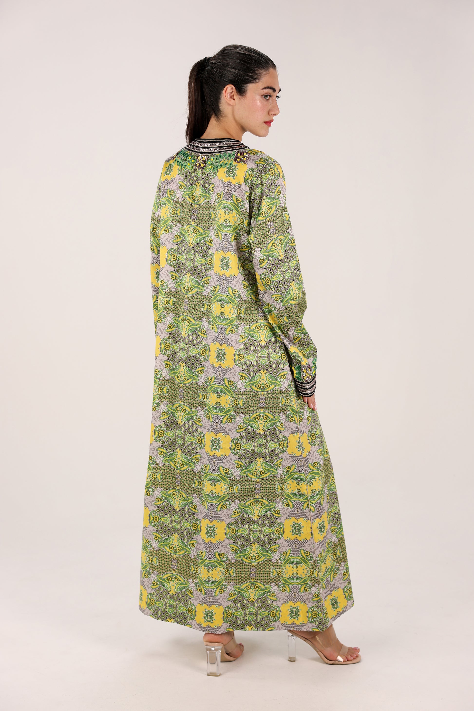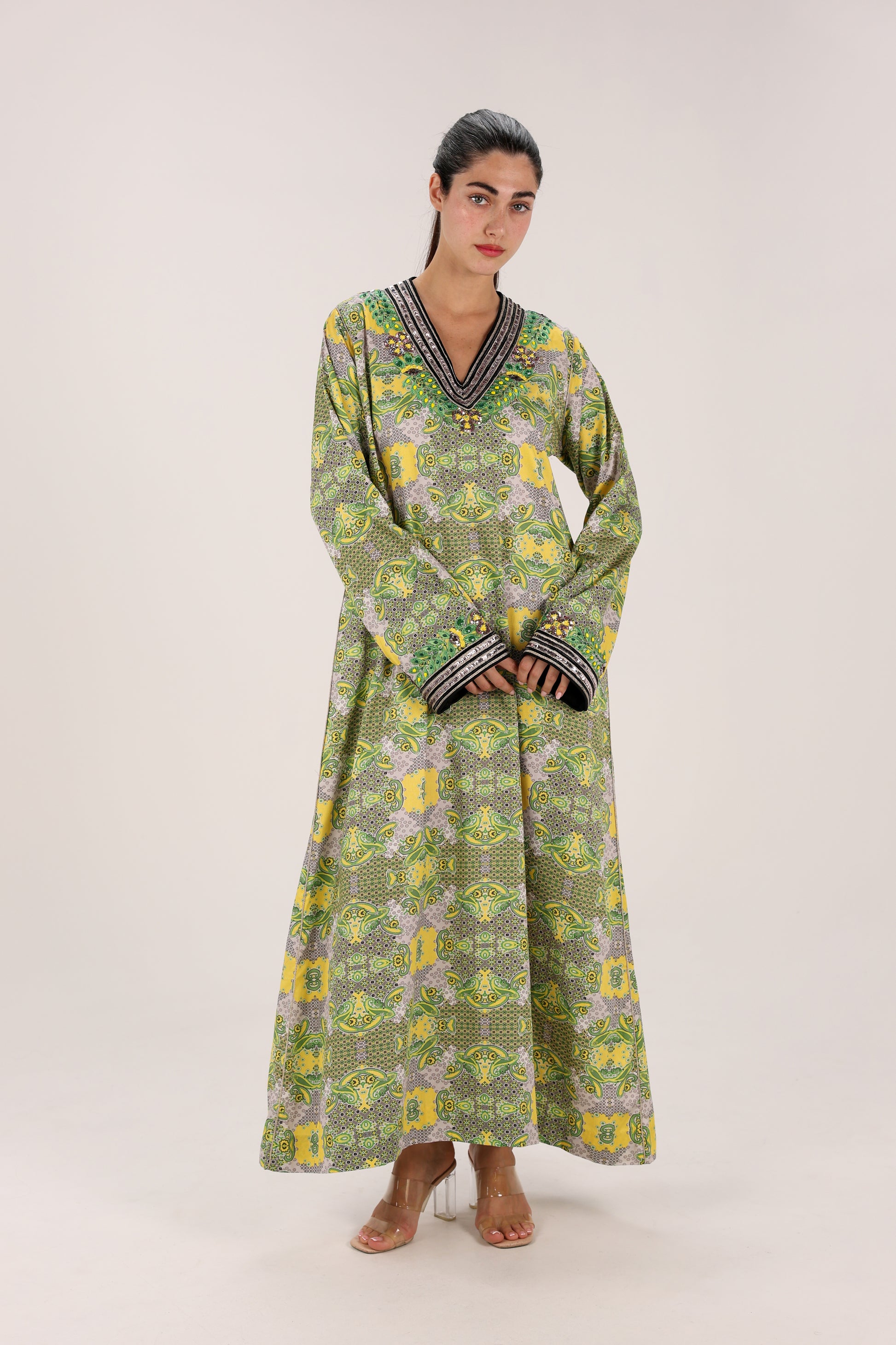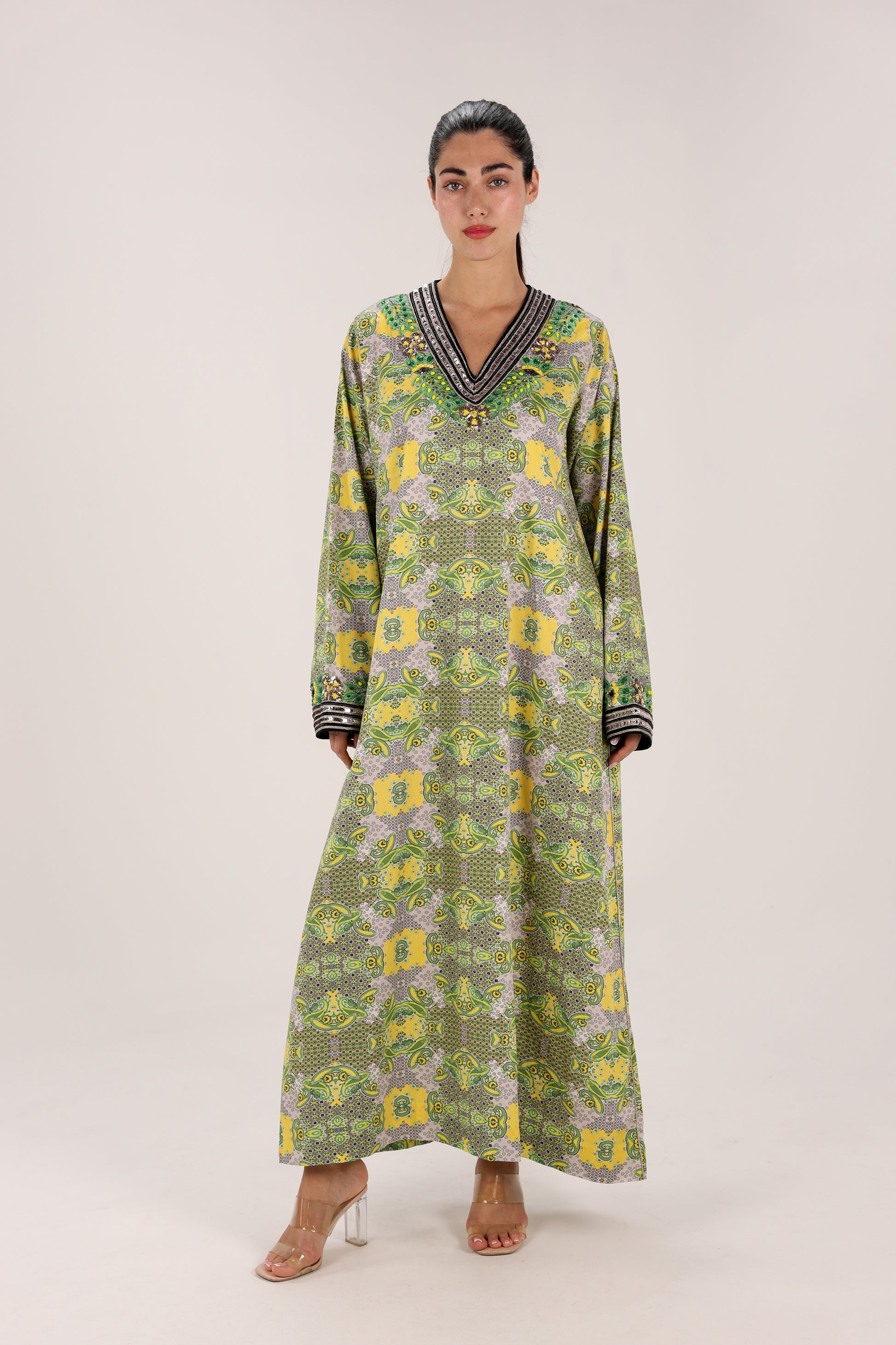 Designed with a flowing silhouette and statement neckline, this kaftan balances heritage artistry with elegant presence, making it ideal for special gatherings and elevated occasions.
