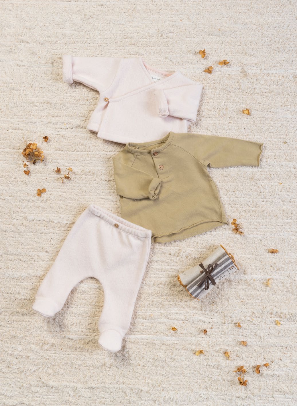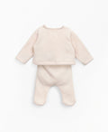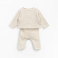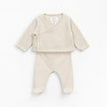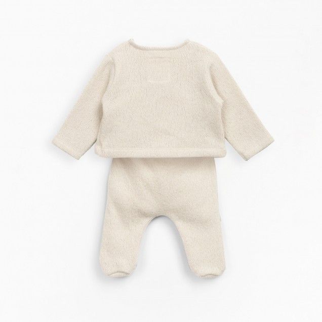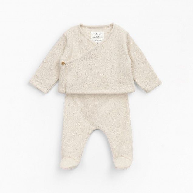 طقم الغرز الجيرسي هذا مصنوع من مزيج من القطن العضوي والبوليستر المعاد تدويره، لون الوعي. تتميز السترة بأكمام طويلة ورقبة على شكل حرف V وفتحة مزدوجة الصدر مع مشبك زنبركي معدني خالٍ من النيكل من الداخل وزر جوز الهند من الخارج. يتميز البنطلون بخصر مطاطي وأقدام وزر جوز الهند المزخرف. الزي مع تمشيط في الداخل.