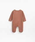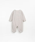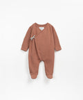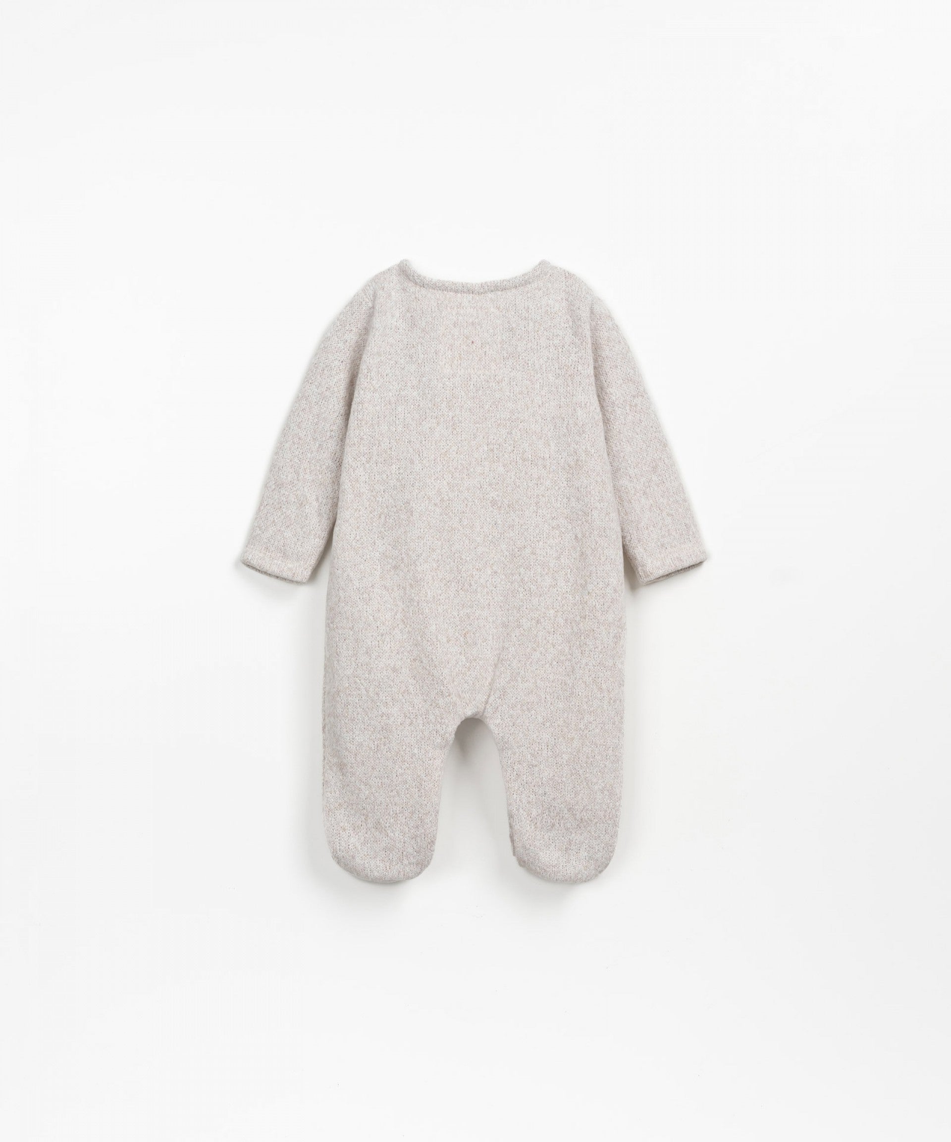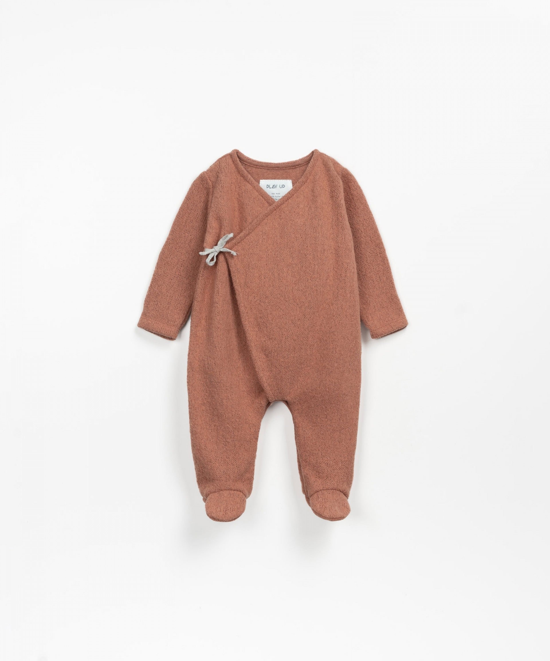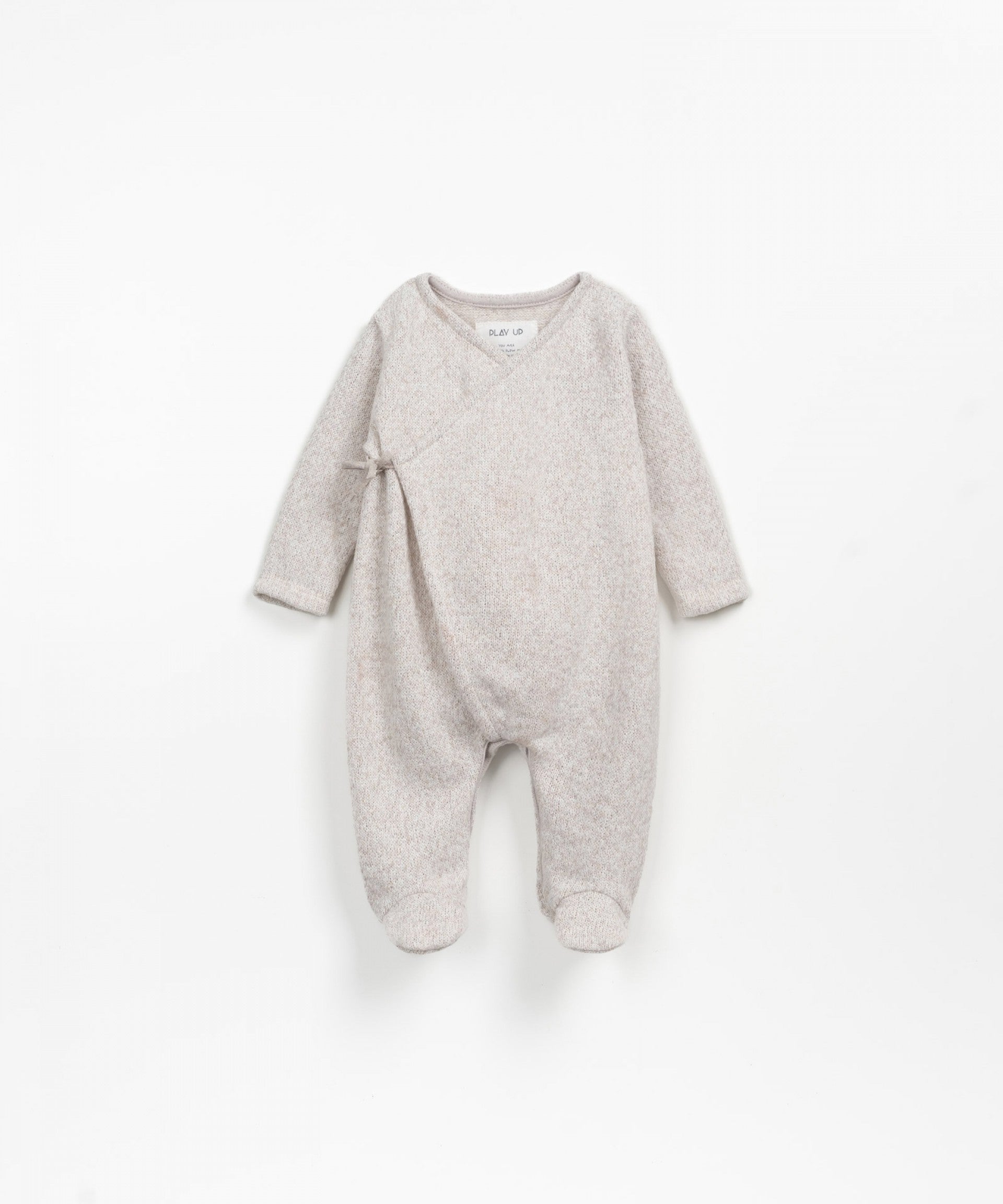 This jersey footed jumpsuit is made from a mixture of recycled fibers, contains 33% of our Re(Play) recycled yarn. The model has long sleeves, carding on the inside, a V-neck, double-breasted front opening with a snap button on the inside and a ribbon on the outside, and a crotch opening with nickel-free metal snap buttons.