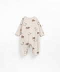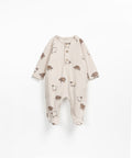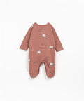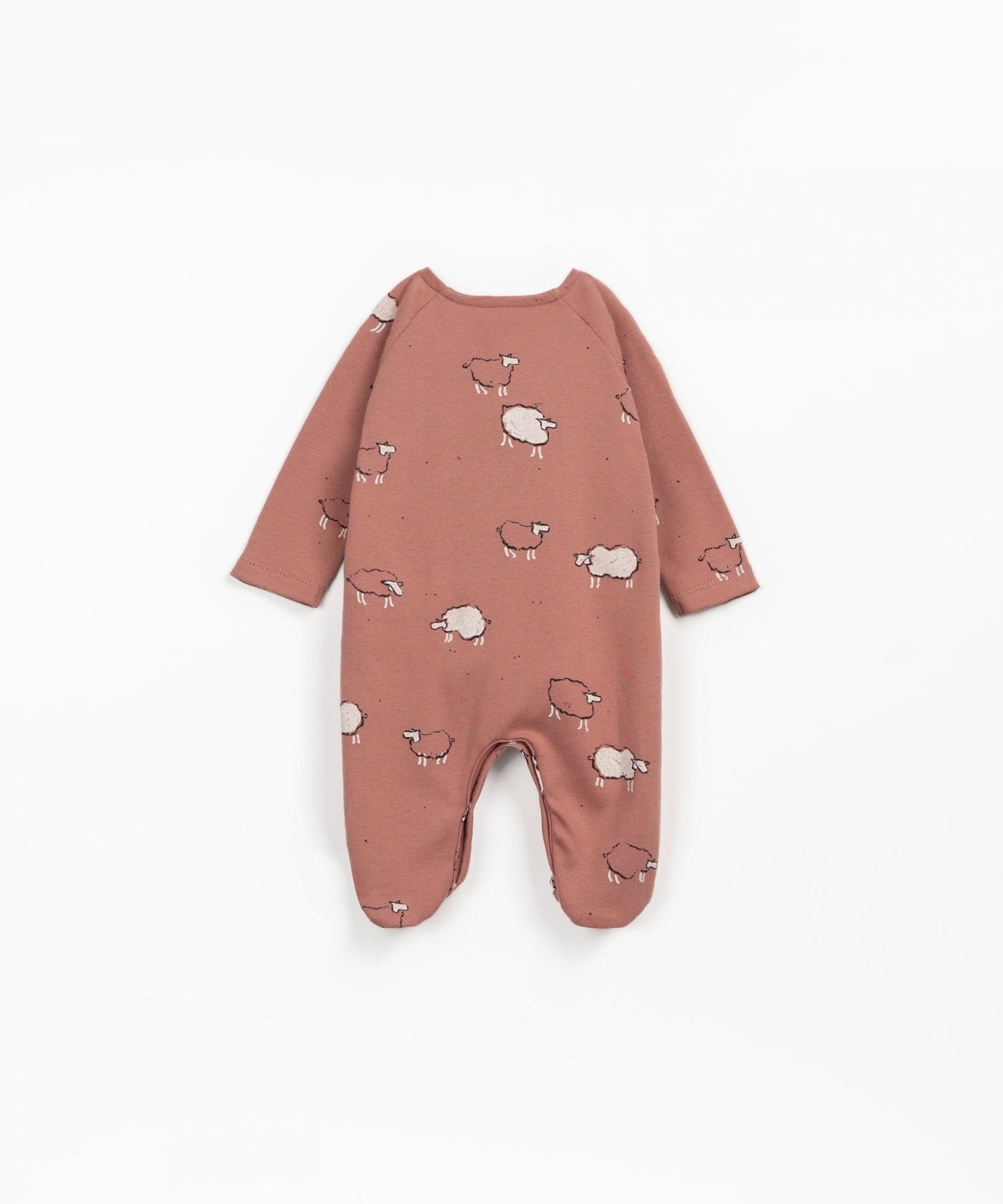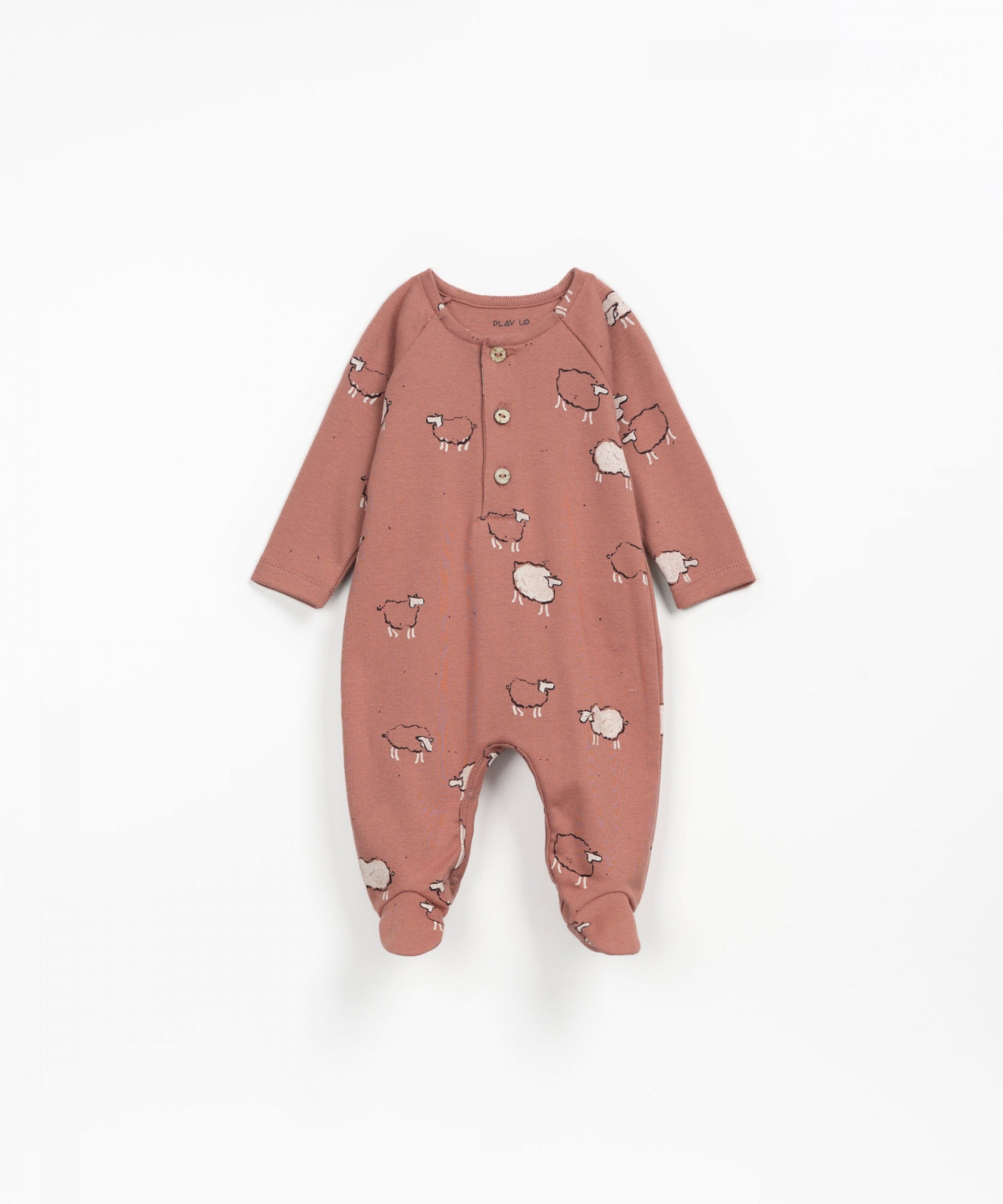 This footed jumpsuit is made from a mixture of organic cotton and recycled cotton, Maria color. The model has a round neckline, a front opening with coconut buttons, a crotch opening with nickel-free metal snap buttons and our sheep print.