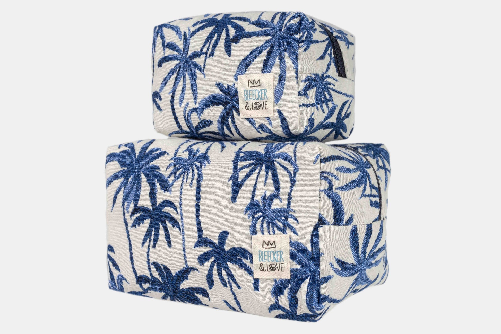 The cosmetics pouch has interior waterproof lining and top zipper closure.