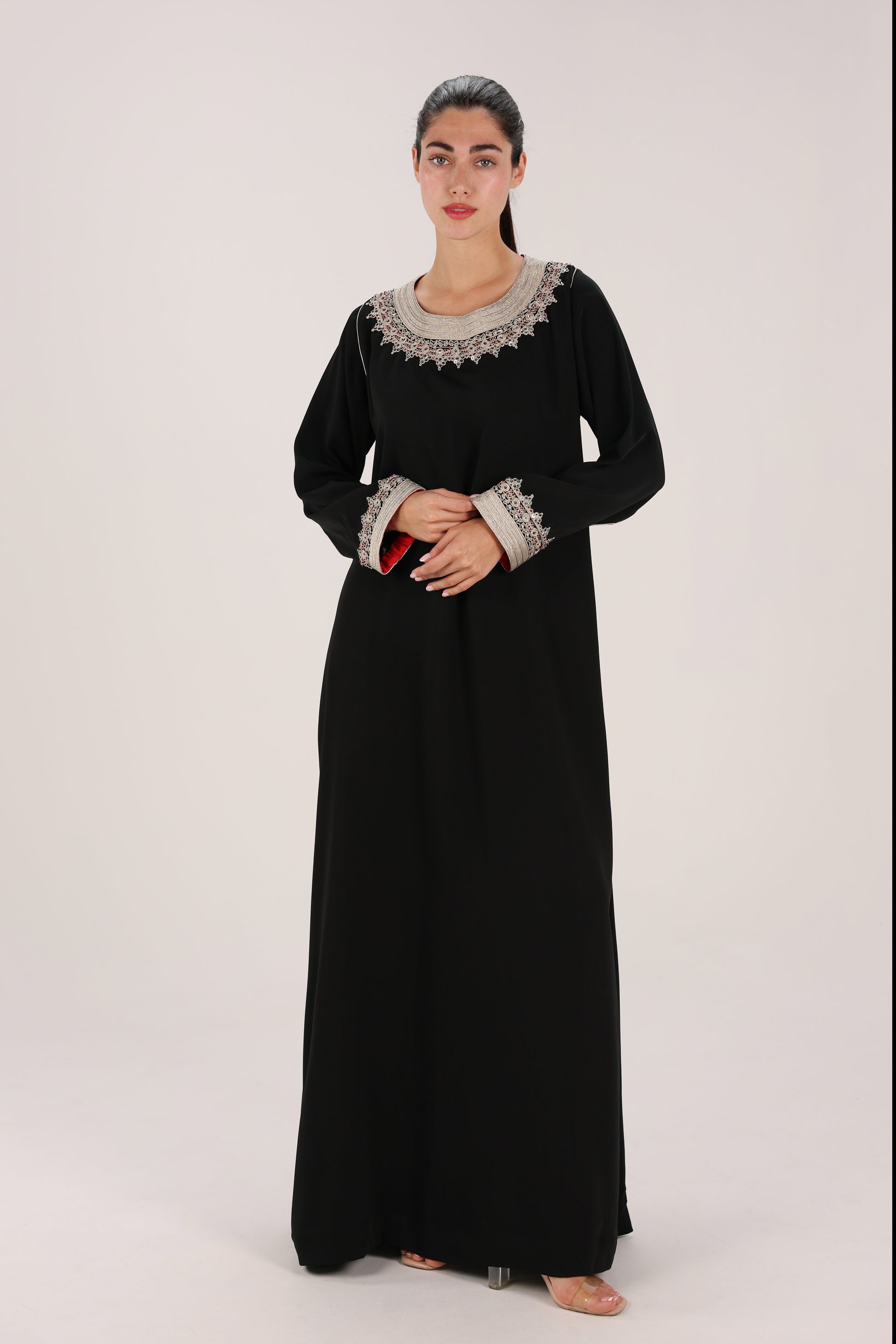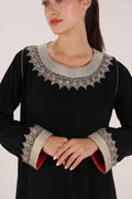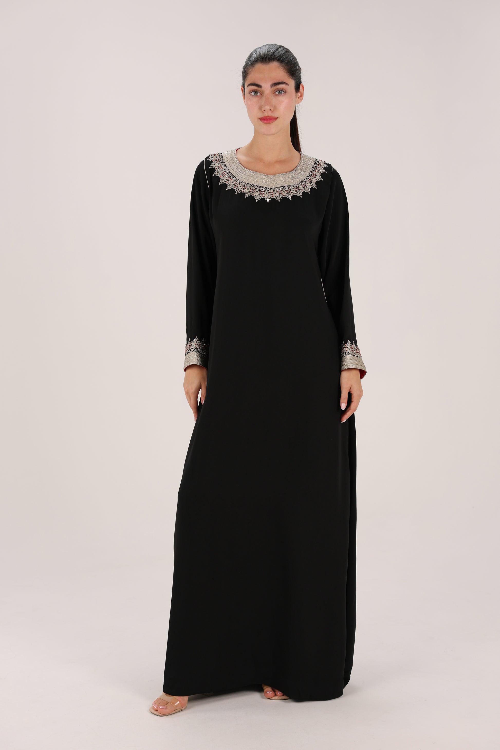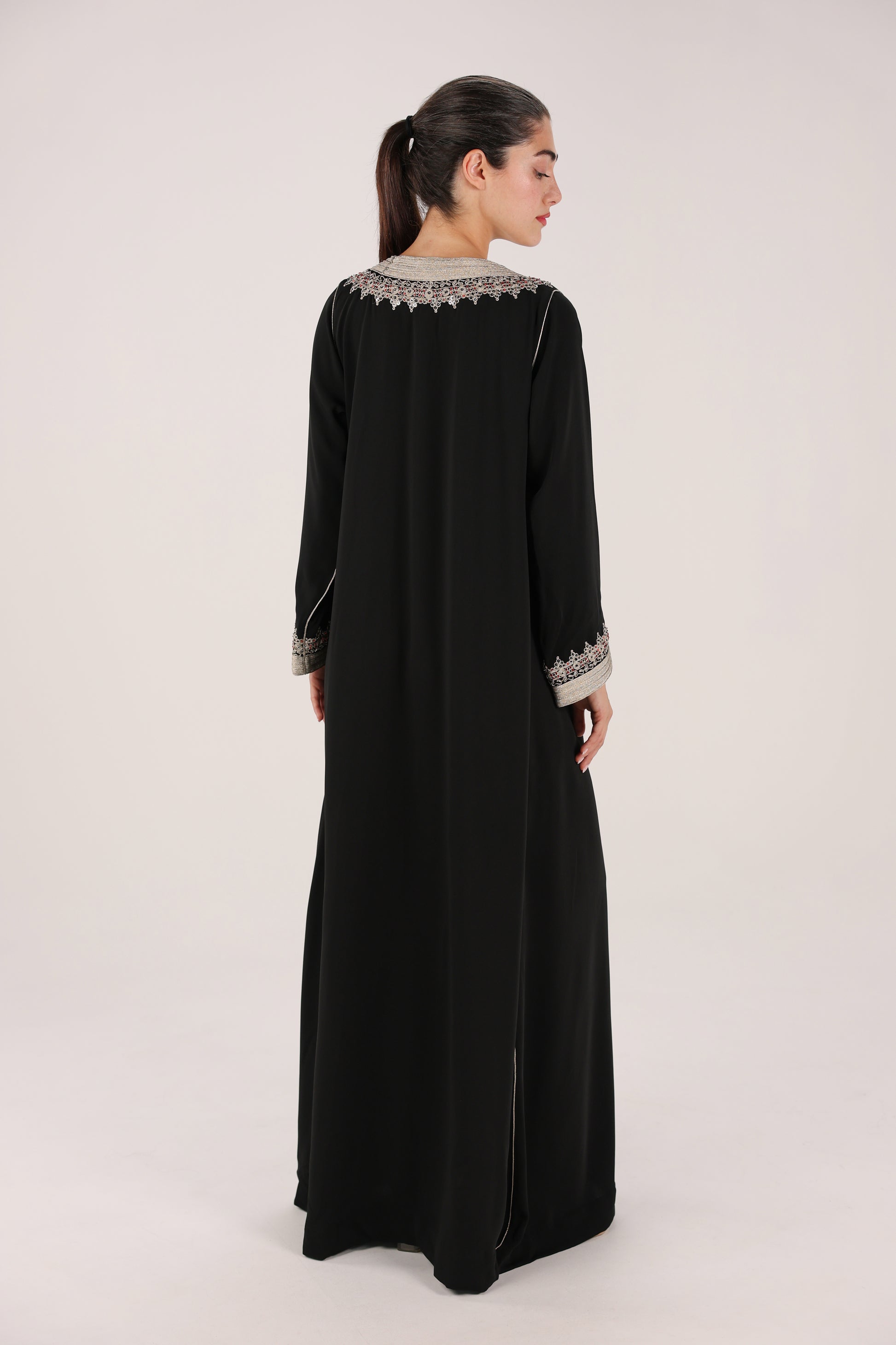 A timeless Moroccan gandoura crafted in deep black fabric, elevated with intricate Maalam embroidery around the neckline and cuffs. Designed with a clean, flowing silhouette, this piece balances traditional craftsmanship with understated elegance, making it ideal for both formal evenings and refined everyday wear.