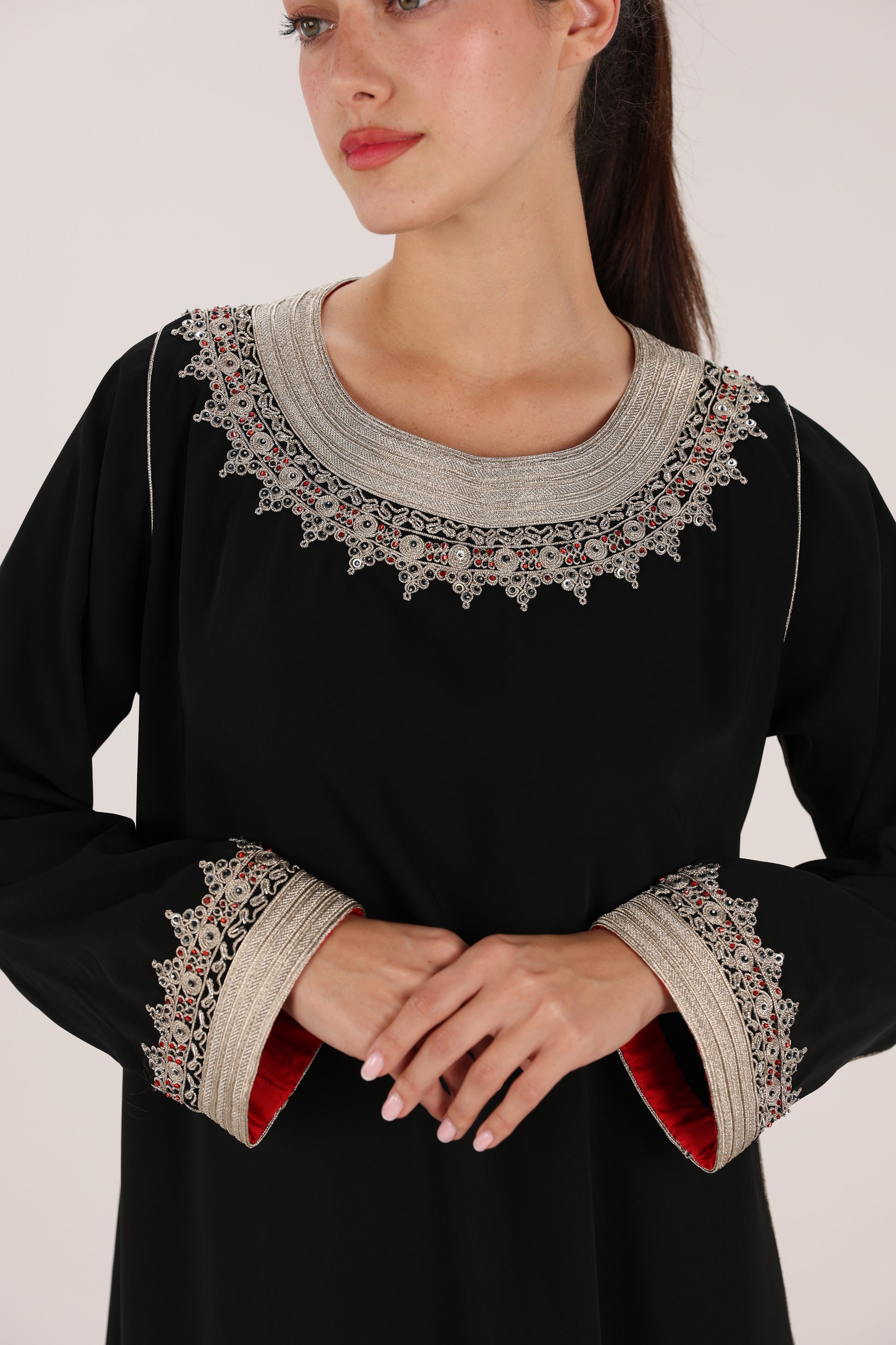 Sleeves: Long sleeves with embroidered cuffs