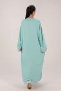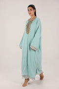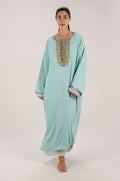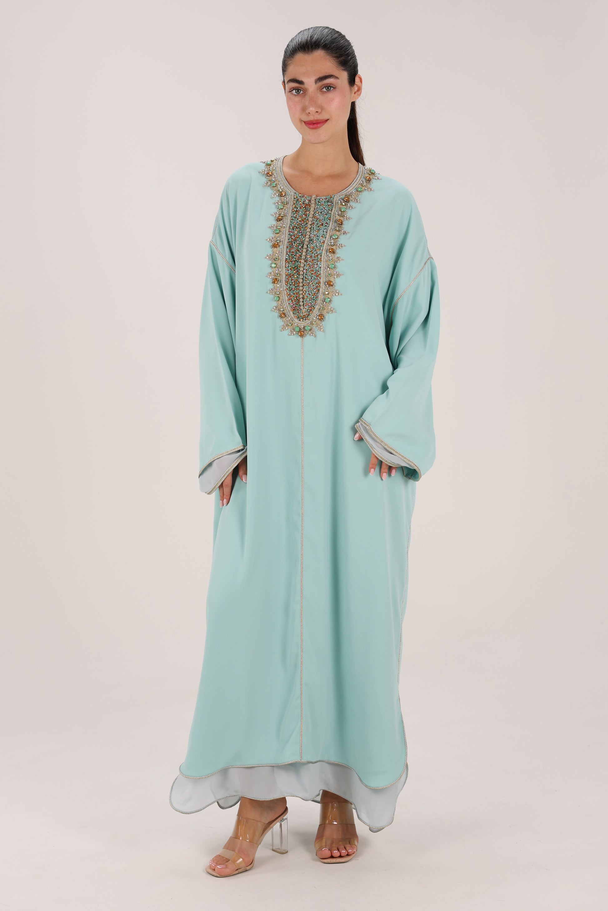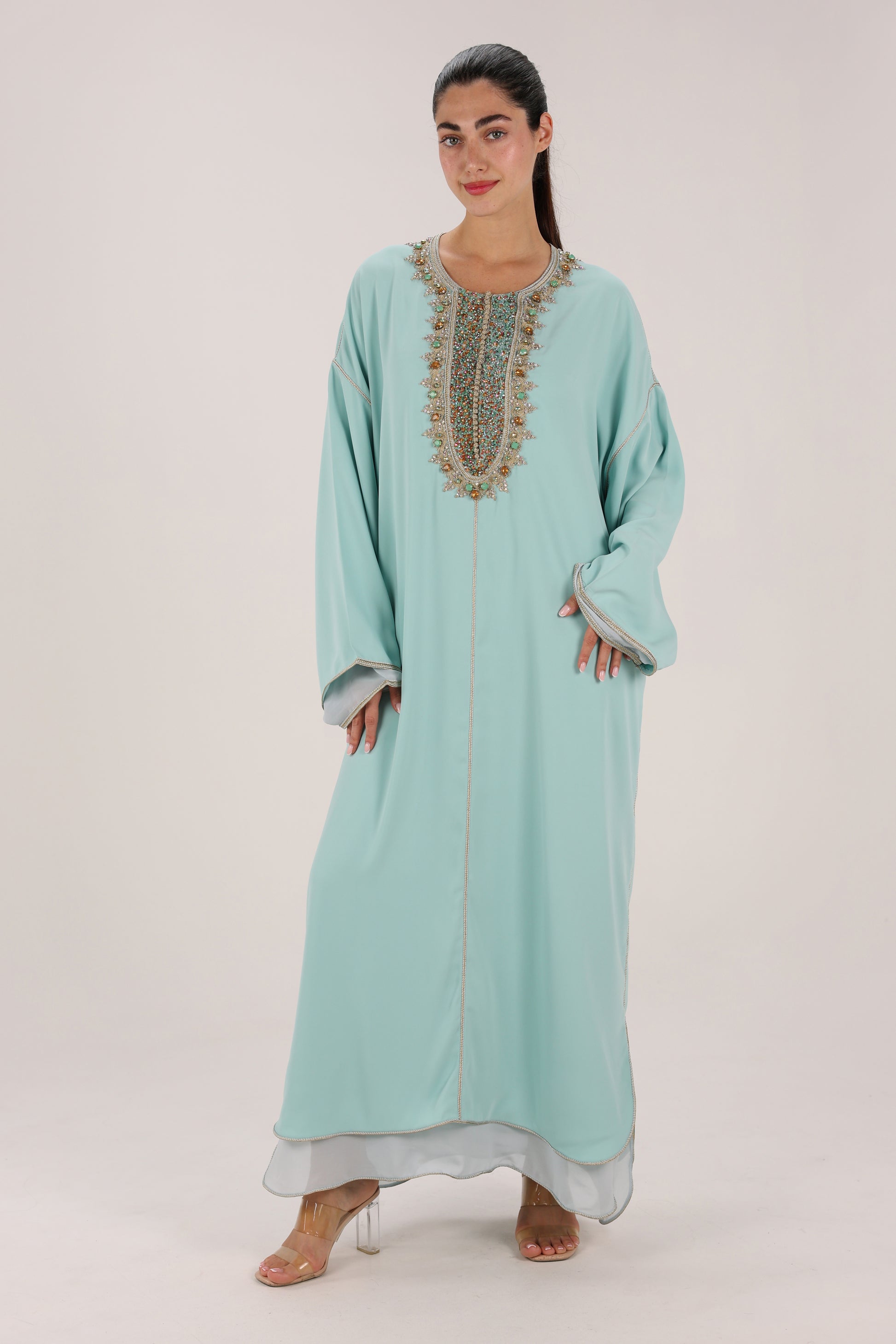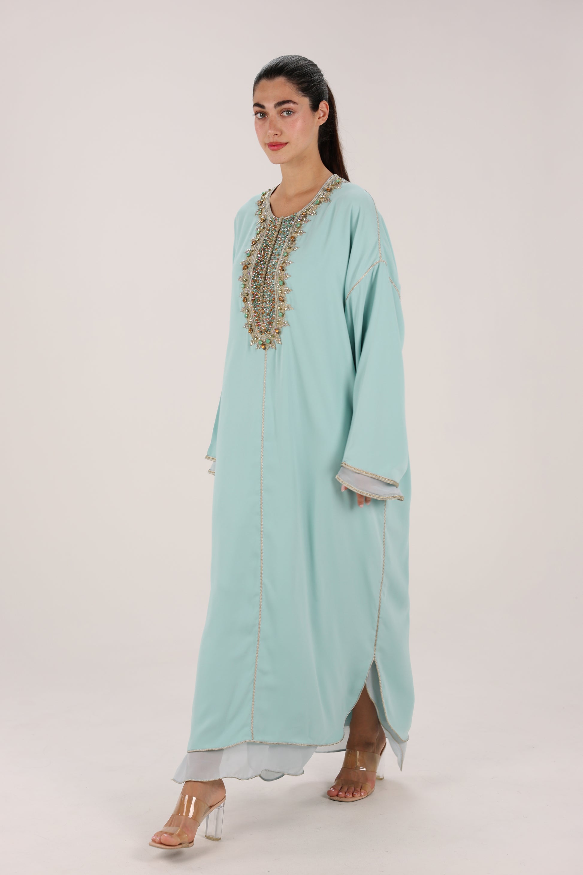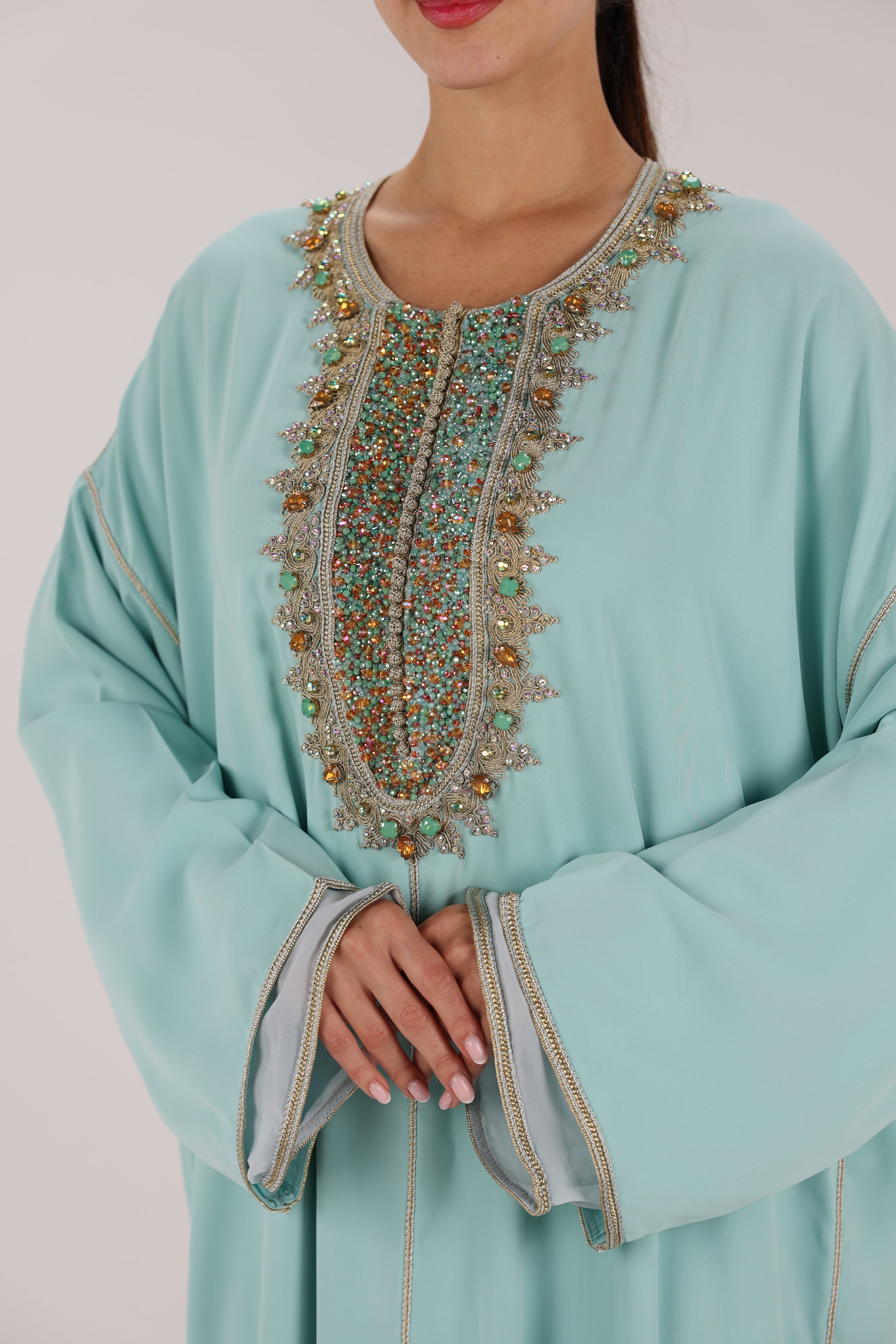 An elegantly crafted Moroccan kaftan designed for refined occasions, combining traditional hand embellishment with a soft, flowing silhouette.