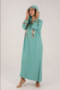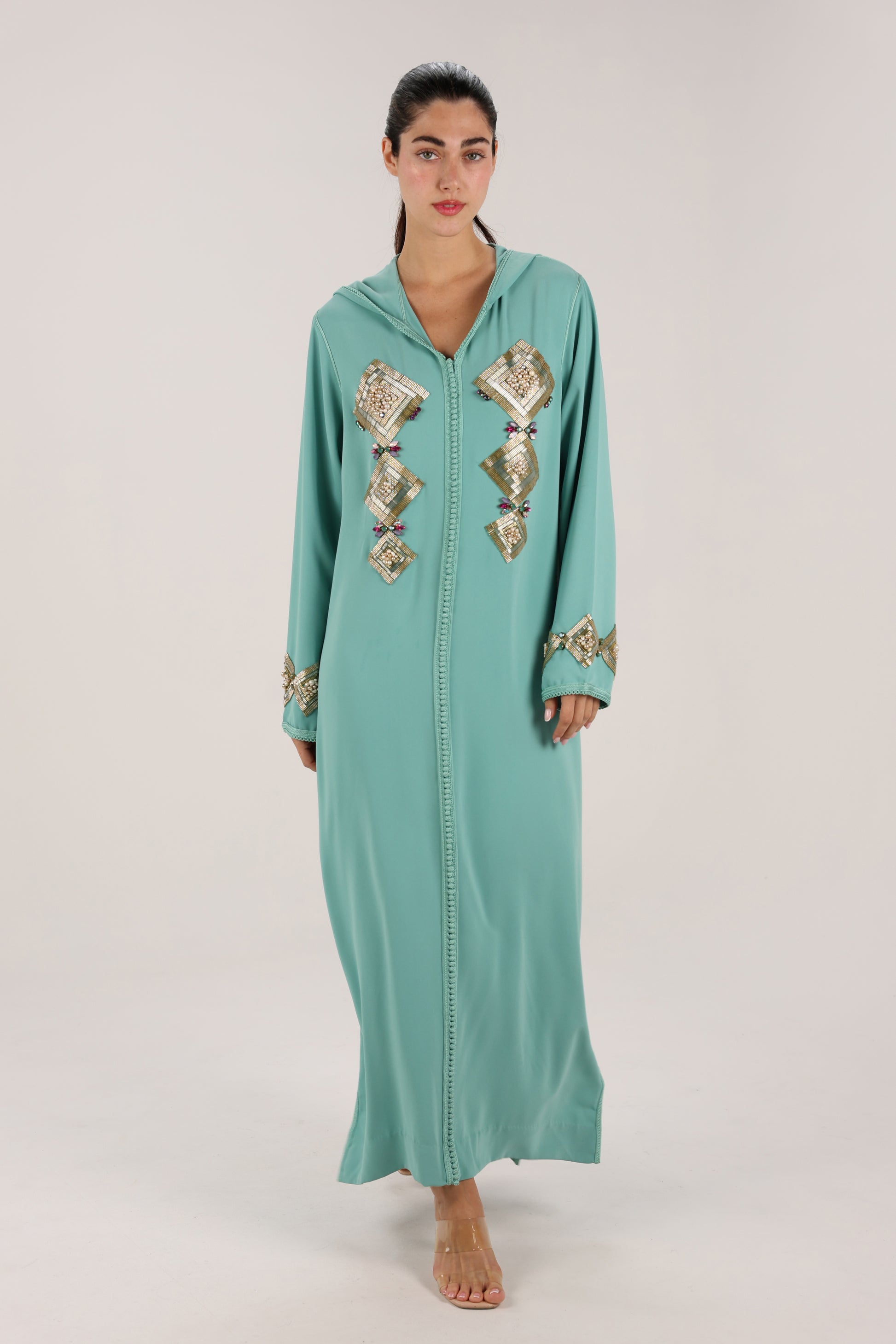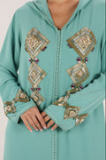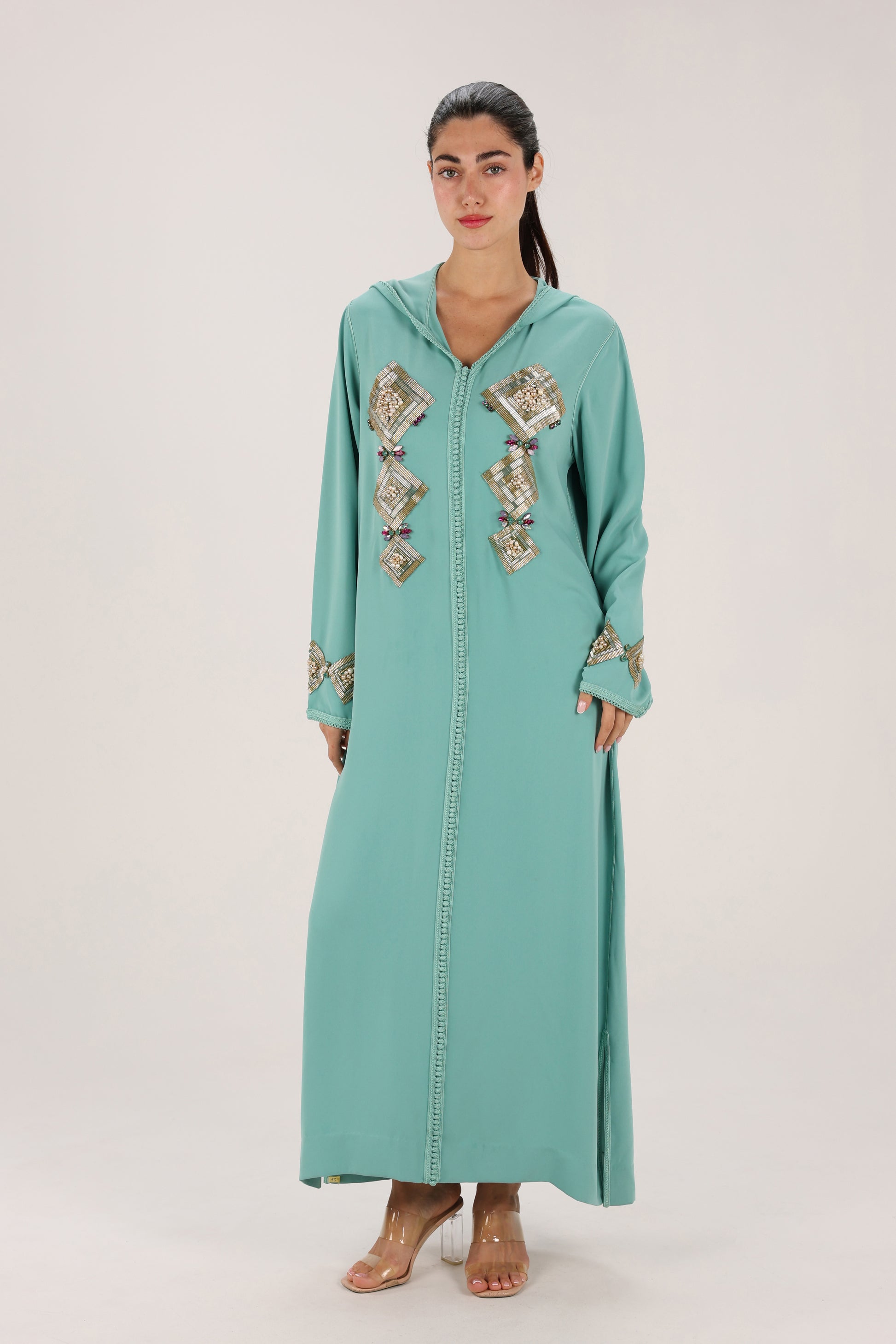 A refined Moroccan kaftan designed to showcase traditional geometric embroidery with a modern silhouette, balancing heritage craftsmanship and effortless elegance.