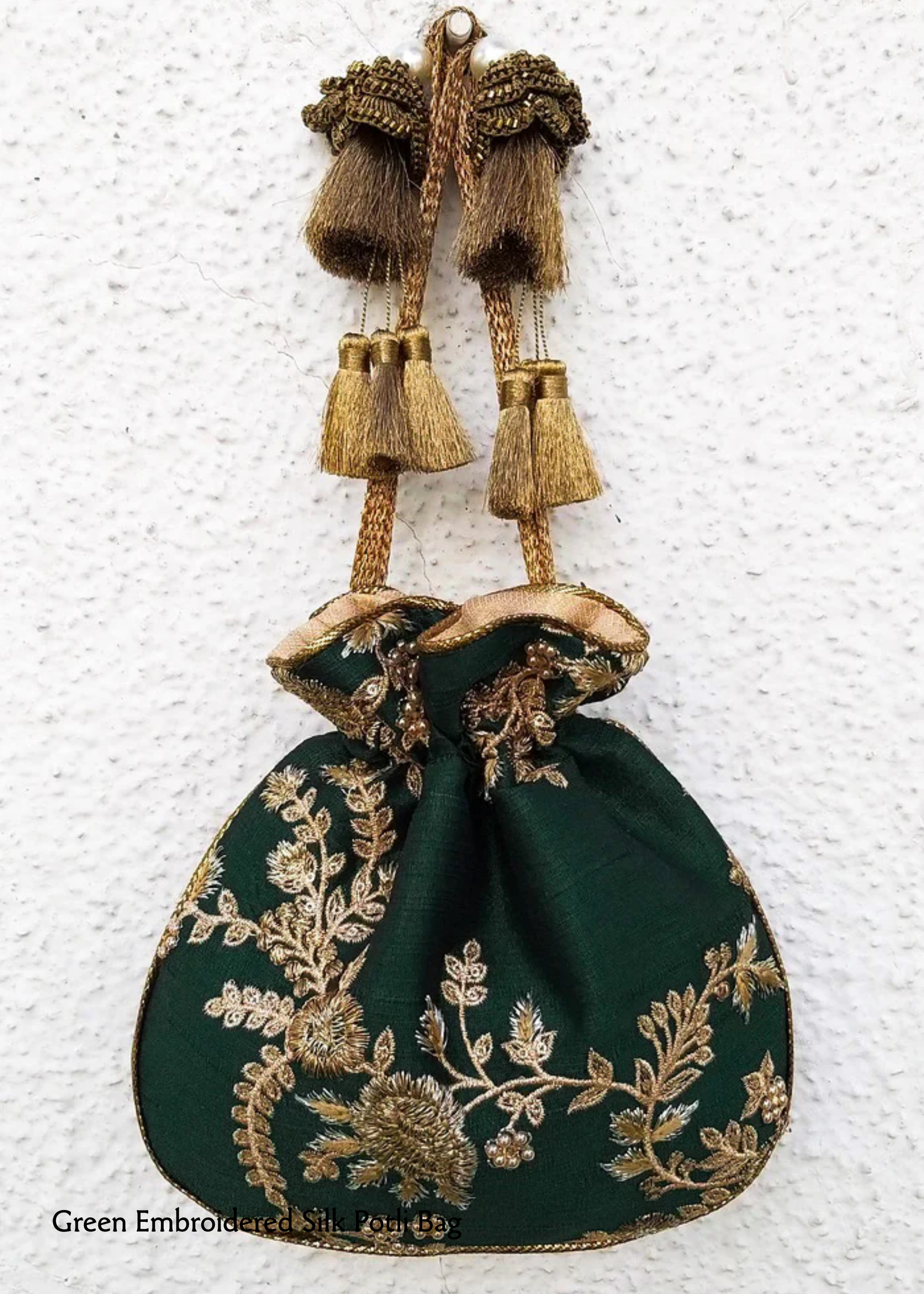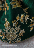 A classic green silk potli beautifully detailed with rich golden embroidery. The timeless green-and-gold combination gives this piece a traditional yet elegant charm. Finished with crochet tassels and a woven golden handle, it’s a graceful addition to any festive or special occasion outfit.