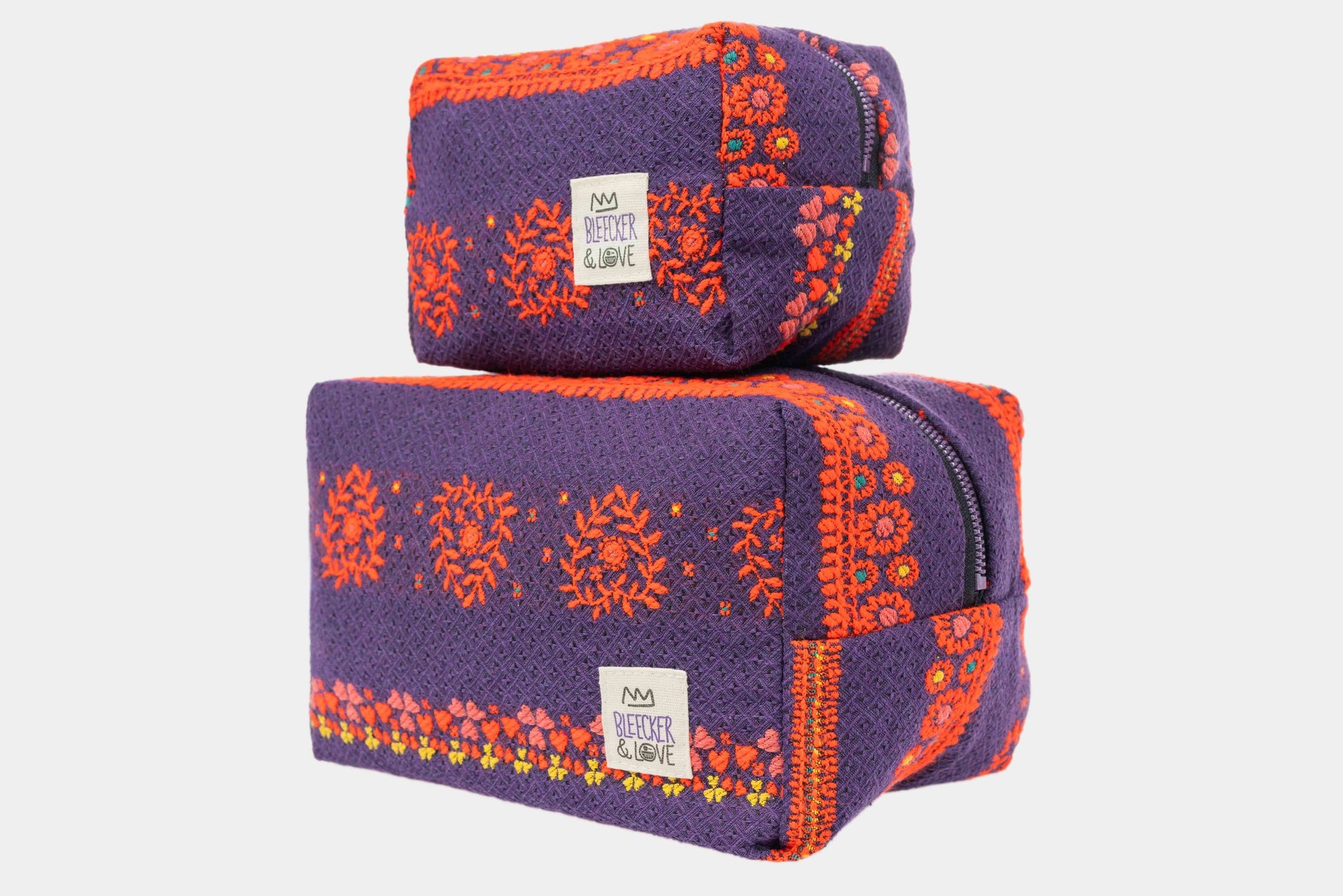 The cosmetics pouch has interior waterproof lining and top zipper closure.