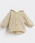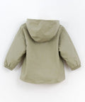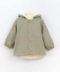 This cloth jacket is made of a mixture of organic cotton and recycled cotton, Louro colour. This model has a hood and fur lining in organic cotton, it has a front opening with coconut buttons, front pockets, and a waterproof finish.
