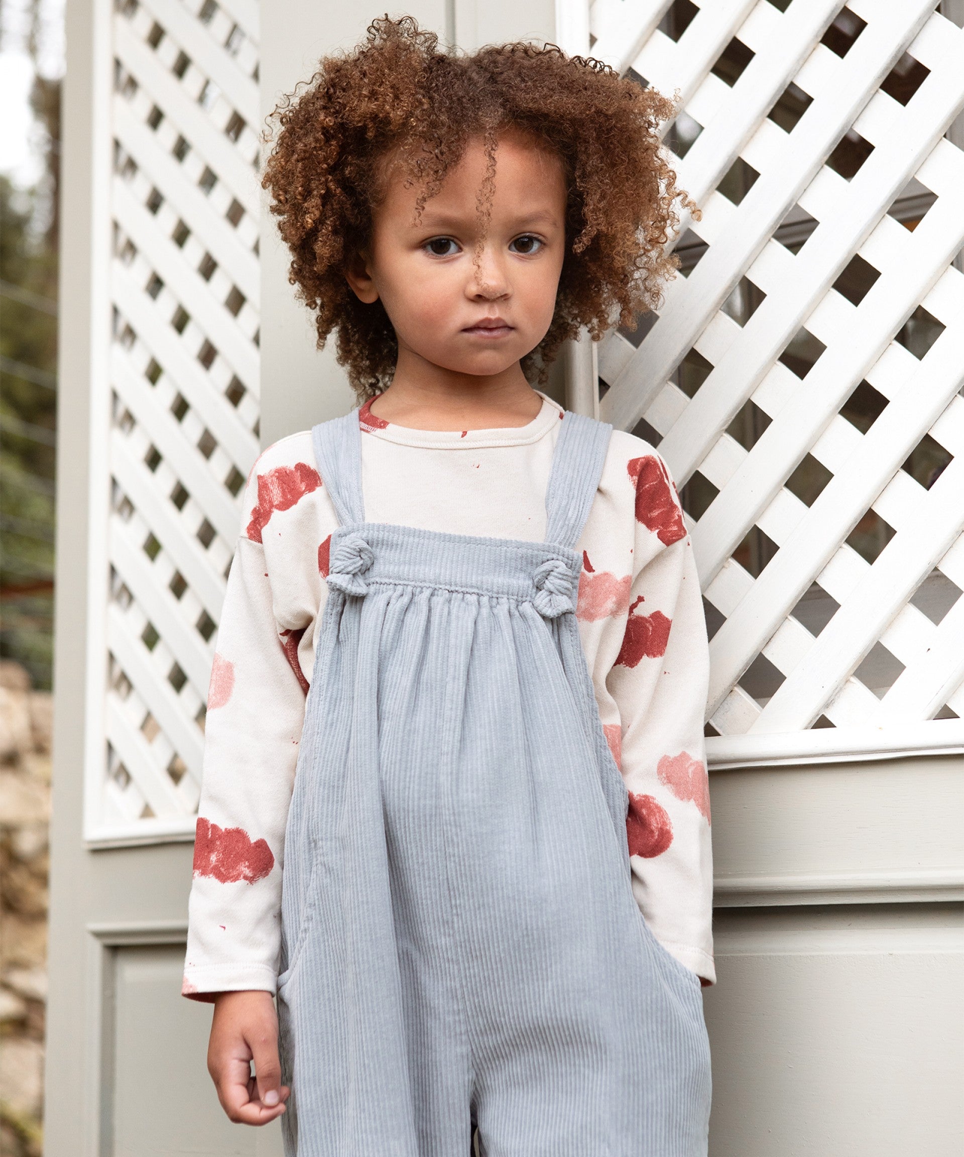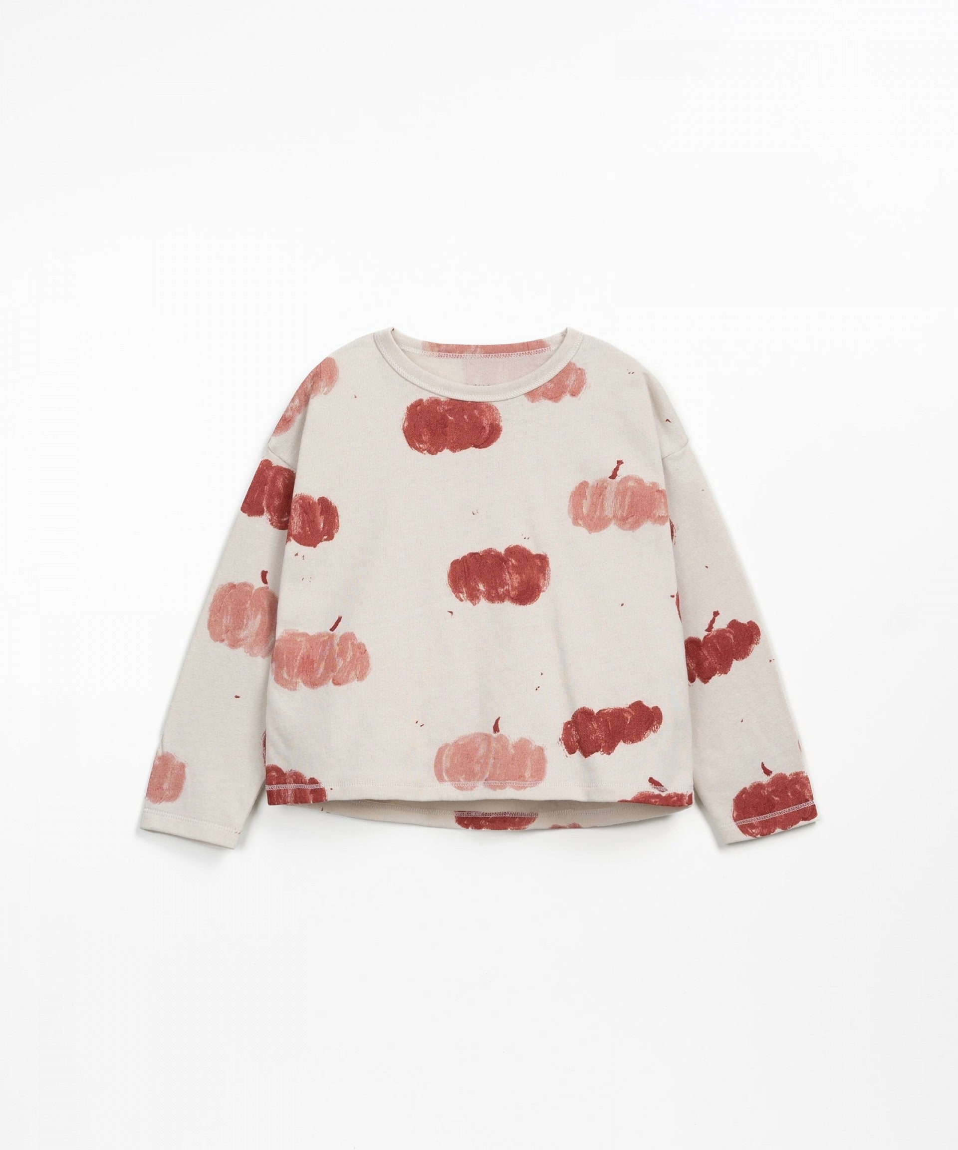 This jersey t-shirt is made from organic cotton and recycled cotton, So-So color. The model has long sleeves, a round neckline, and our cloud print.