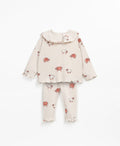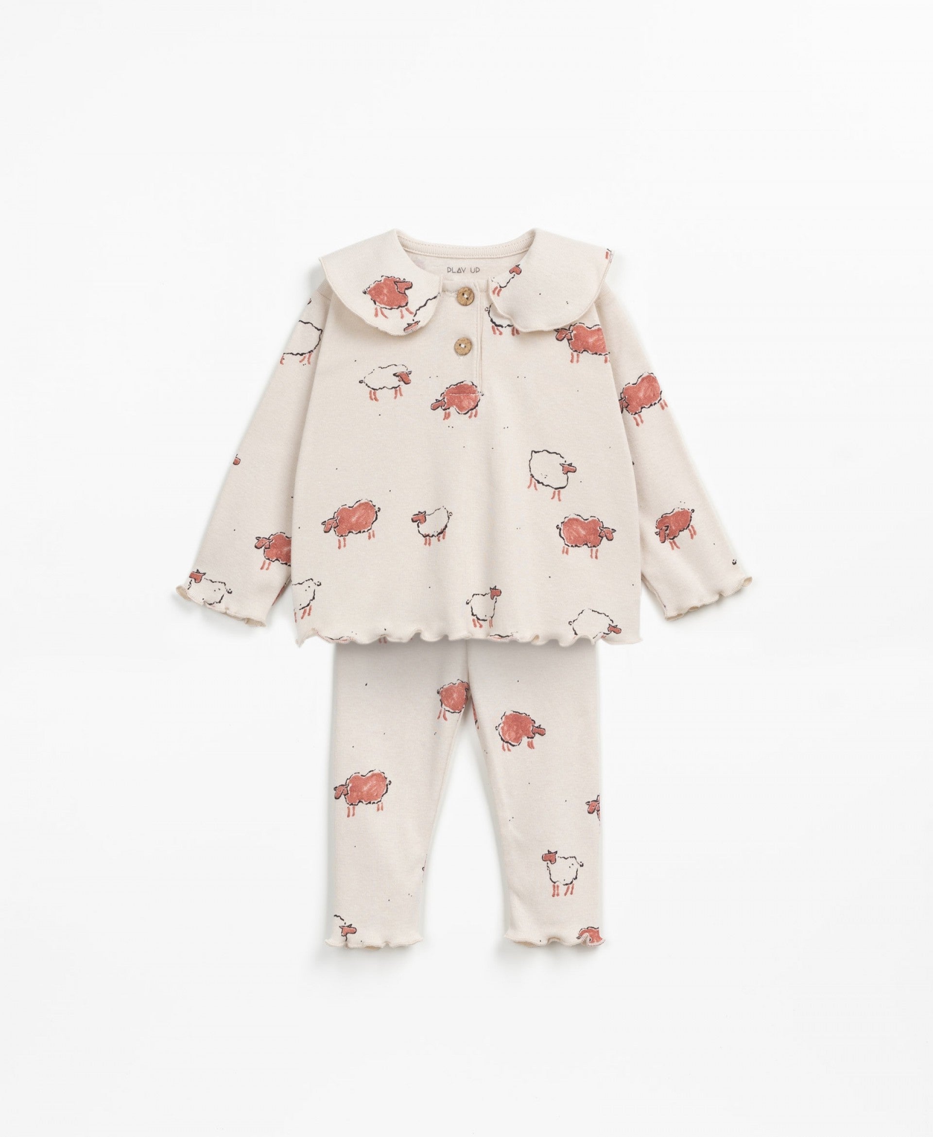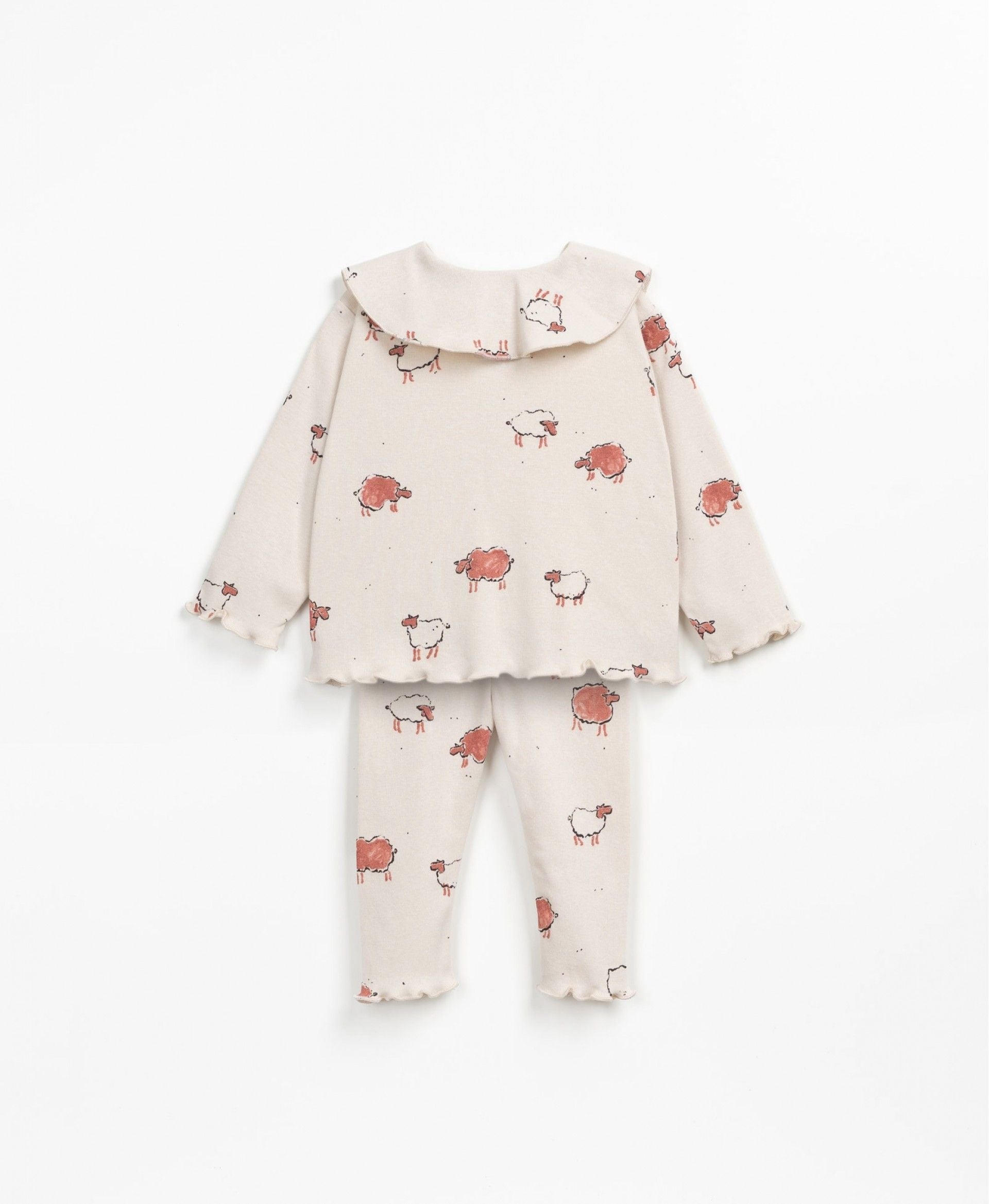 These jersey pajamas are made from a mixture of organic cotton and recycled cotton, So-So color, with our sheep print. The t-shirt is a long-sleeve model with a round neckline, has a front opening with coconut buttons and a collar. The pants have an elastic waist and rolled finish.