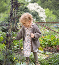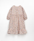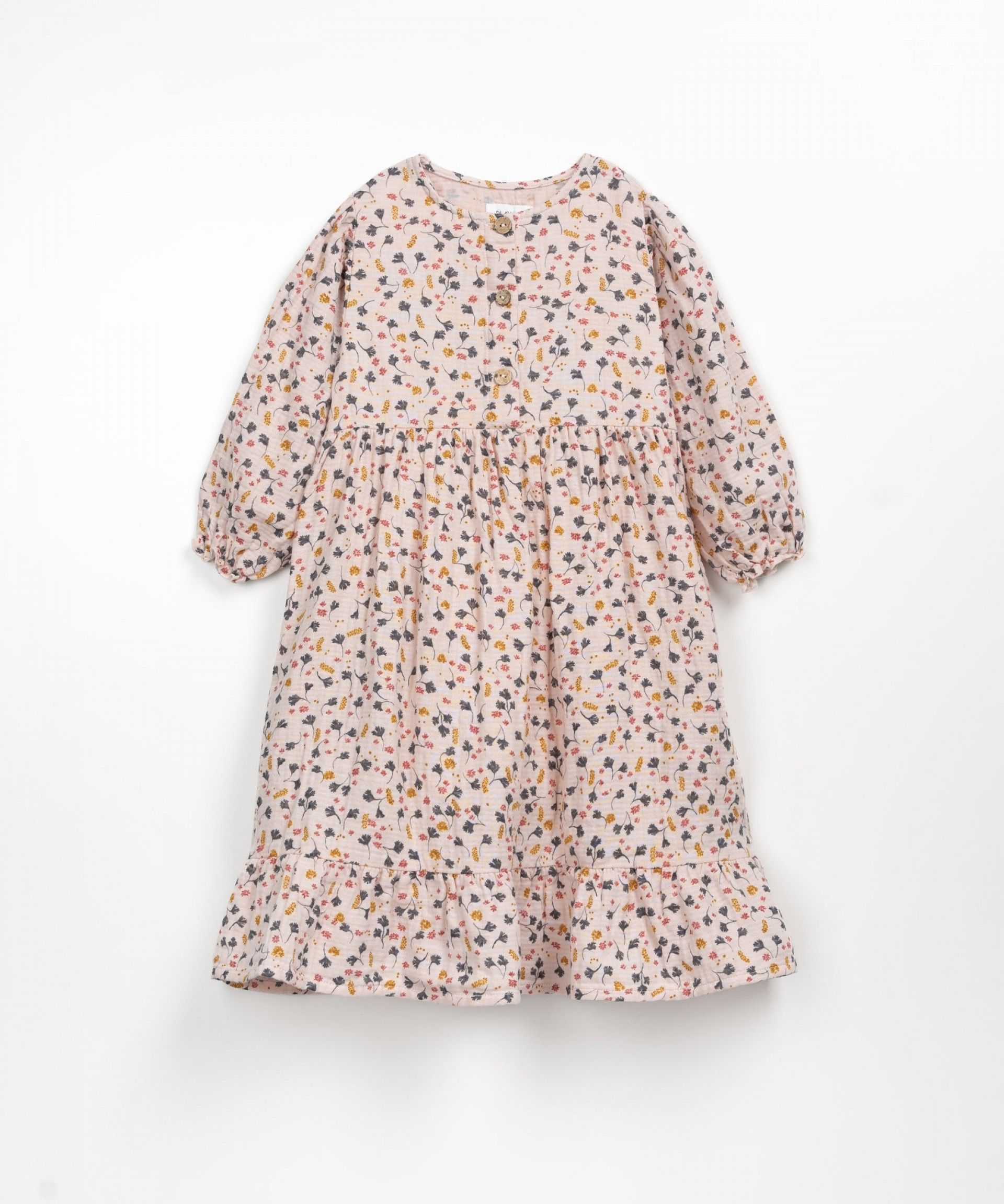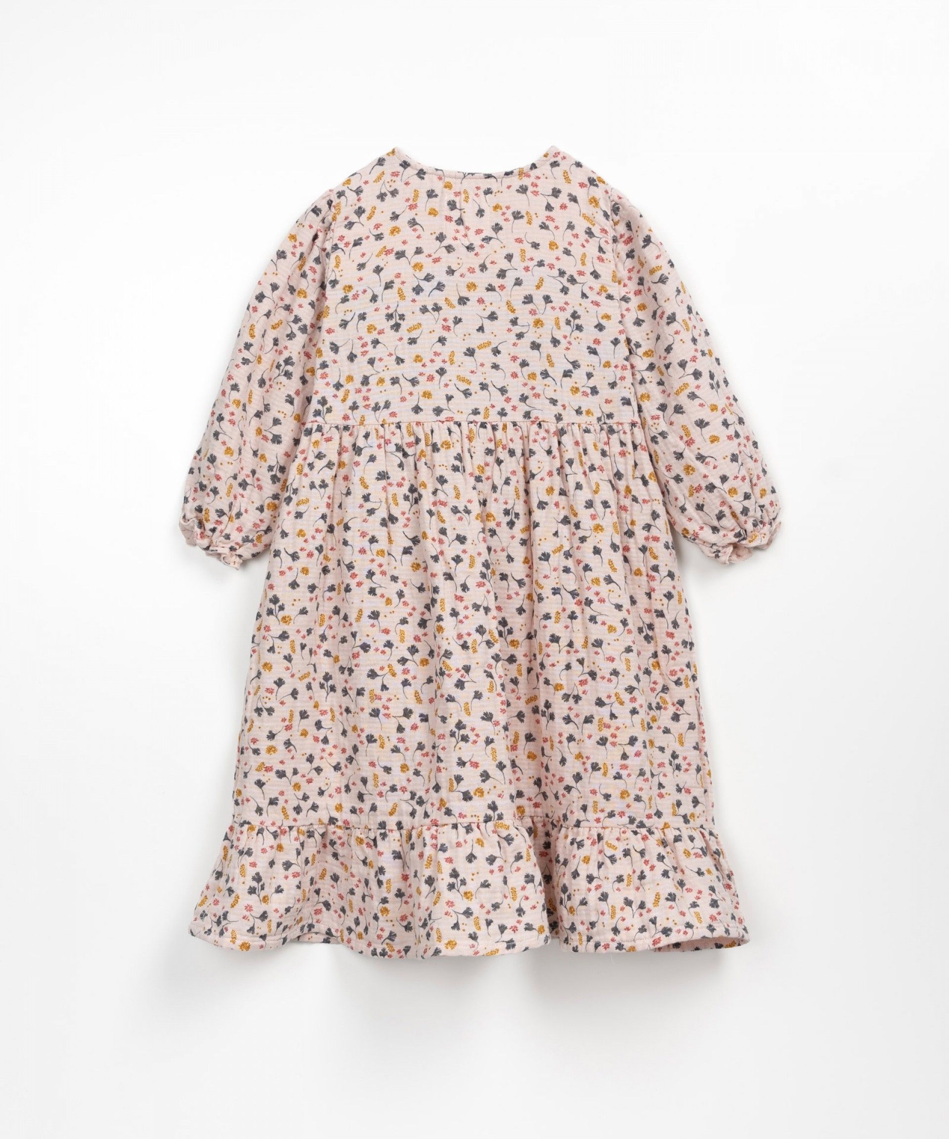 This woven dress is made from organic cotton, Memories color. It is a long-sleeve model with a round neckline, it has a front opening with coconut buttons, a frill at the bottom, elastic cuffs and our flower print