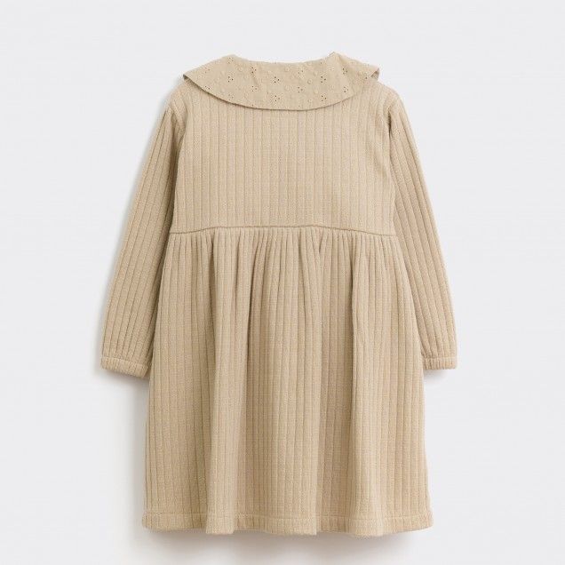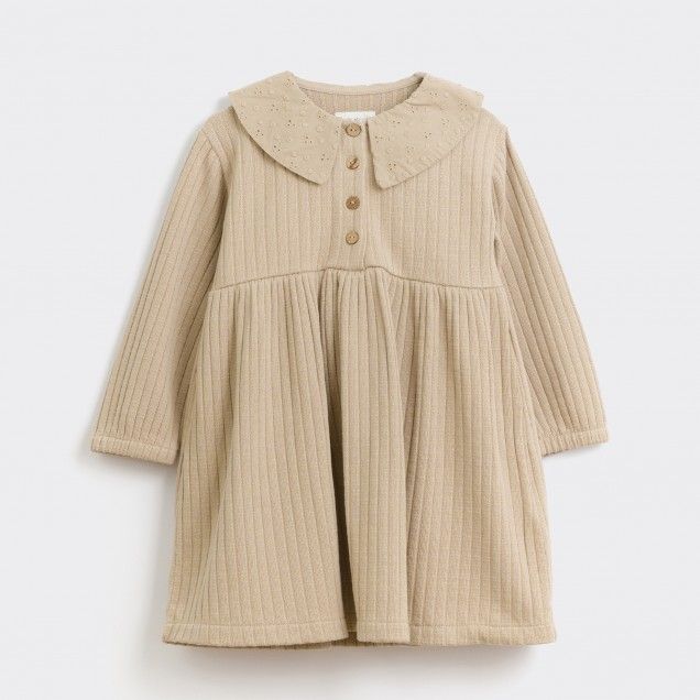 هذا الفستان بخياطة الجيرسيه مصنوع من مزيج من البوليستر المعاد تدويره والقطن العضوي والإيلاستين، بلون الفلفل. يتميز الموديل برقبة مستديرة وياقة مطرزة باللغة الإنجليزية وفتحة أمامية بأزرار جوز الهند وأصفاد مرنة.