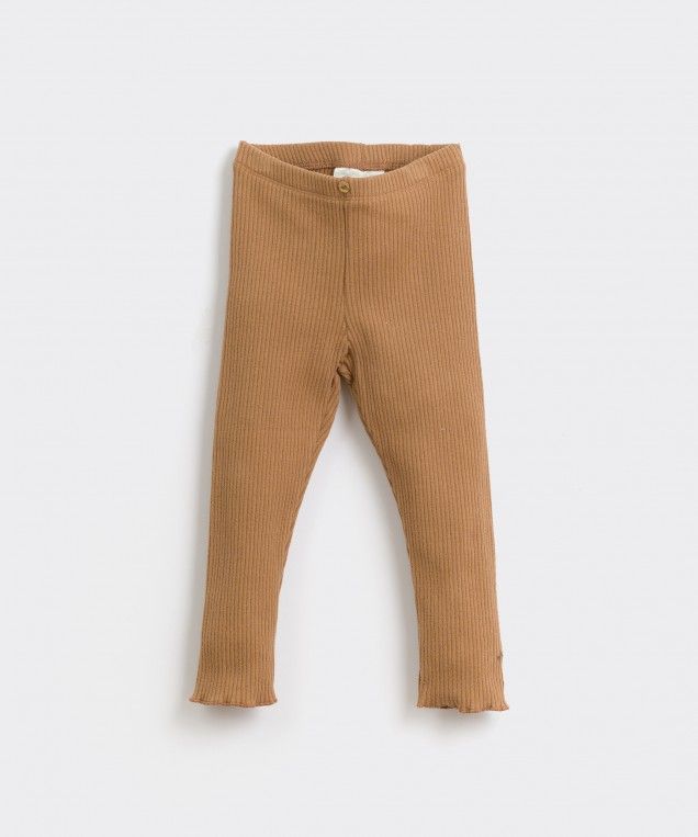 These jersey-stitch leggings are made of a mixture of organic cotton and elastane, Cocoa colour. The model has an elastic waist,a decorative coconut button and embroidered carrots at the hem.