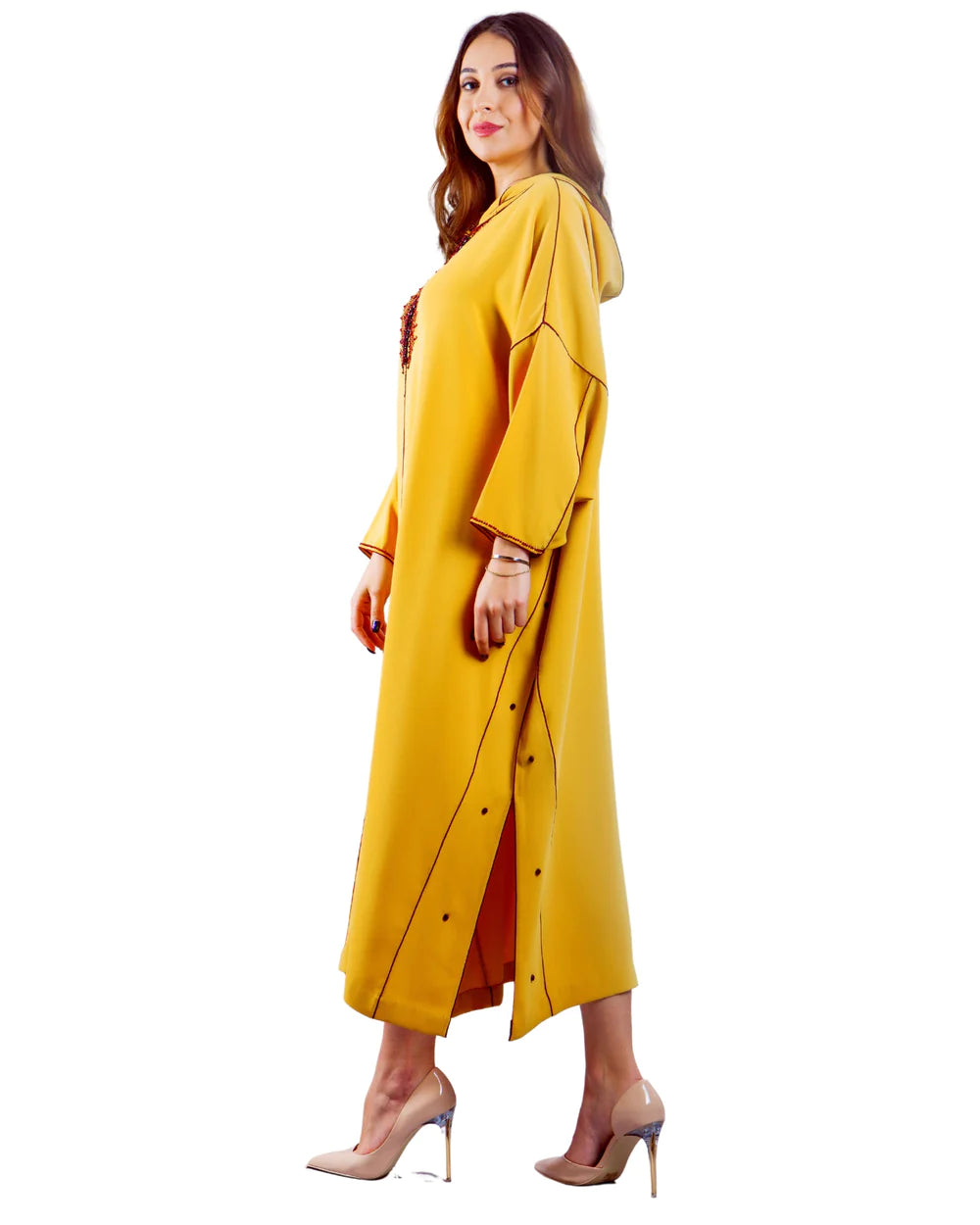 أضف لمسة من الغرابة مع هذه الجلابة المغربية. هذا اللباس المغربي التقليدي مصنوع من كريب الحرير الفاخر. يعد اللون الأصفر الخردلي الغني مثاليًا لإضافة لمسة من الألوان. قطعة متعددة الاستخدامات، يمكن ارتداء هذه الجلابة لأعلى أو لأسفل لتناسب أي مناسبة. اشعري وكأنك ملكة عندما ترتديه في مناسبتك الخاصة القادمة. (صنع يدوي)