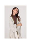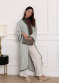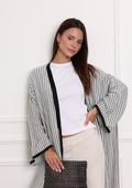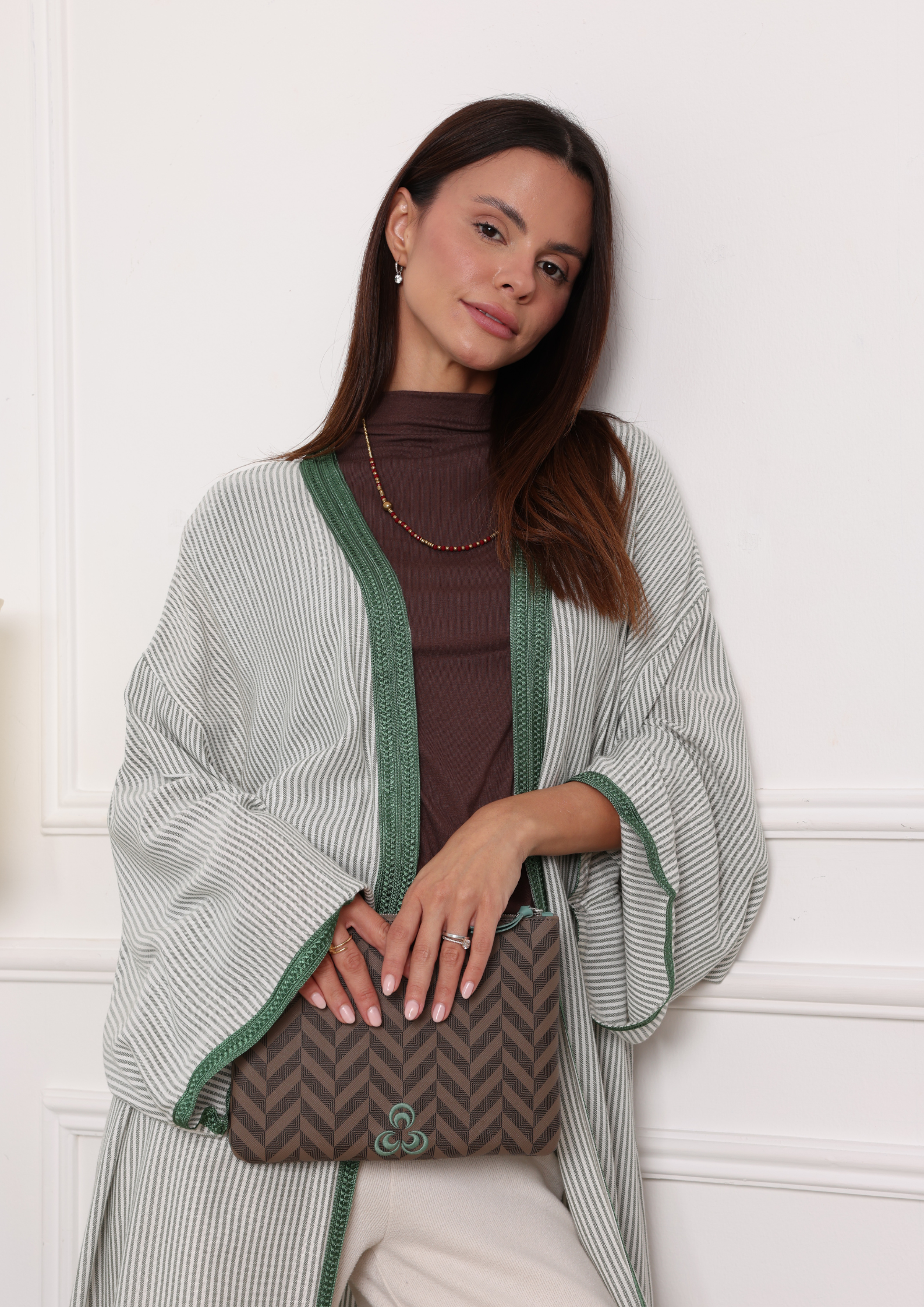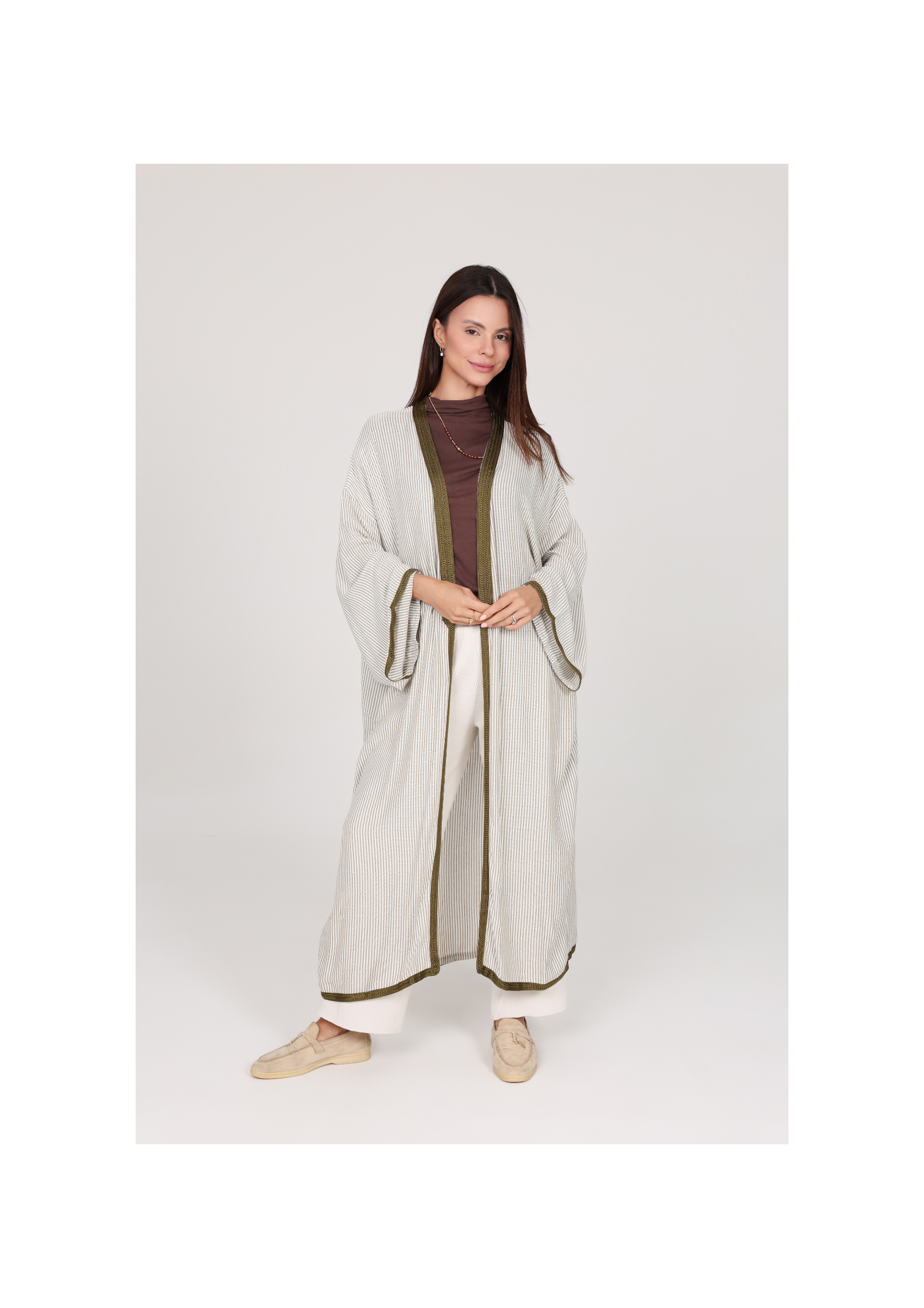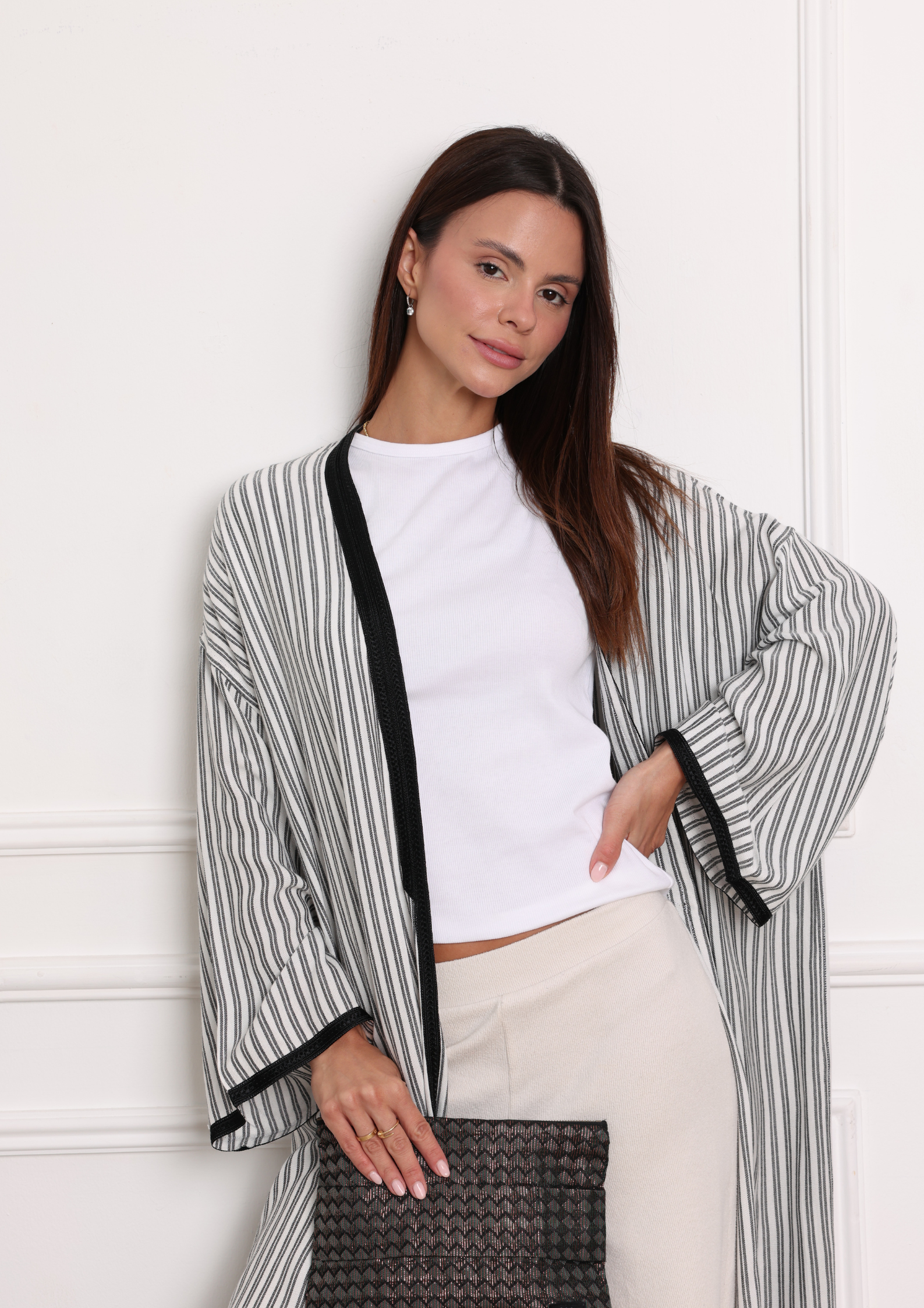 Elevate your everyday style with this effortlessly chic striped kimono jacket, handcrafted in Morocco. Designed with a relaxed silhouette, it features clean black piping that frames the flowing vertical stripes, creating a modern yet timeless look. Made from breathable fabric, it’s the perfect layering piece—pair it with casual essentials for a laid-back day or dress it up for a sophisticated evening. A versatile wardrobe staple that blends Moroccan craftsmanship with contemporary elegance.