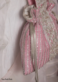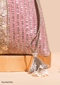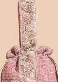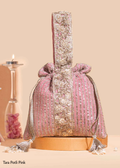 A timeless pink potli designed to add effortless elegance to any look. Crafted from embroidered georgette and embellished with soft pearls, this luxurious accessory glows beautifully in both day and evening settings. Finished with a hand-embroidered zardosi handle and shimmering zari tassels.