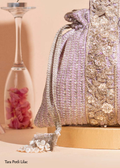 A soft, elegant lilac potli that brings a touch of luxury to every outfit. Crafted from embroidered georgette and adorned with delicate pearl embellishments, this piece adds a refined glow to both daytime and evening looks. Finished with a hand-embroidered zardosi handle and shimmering zari tassels.