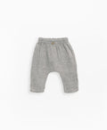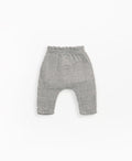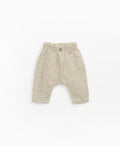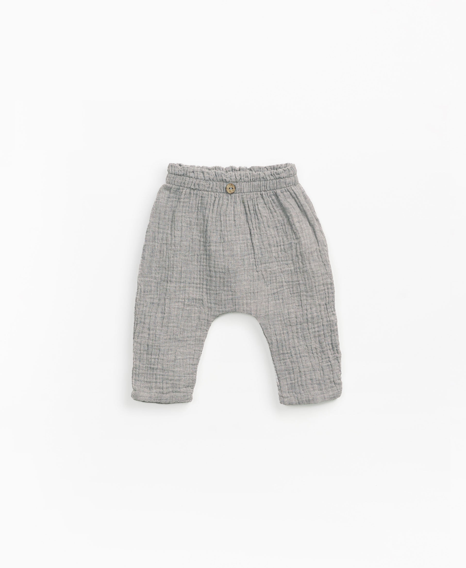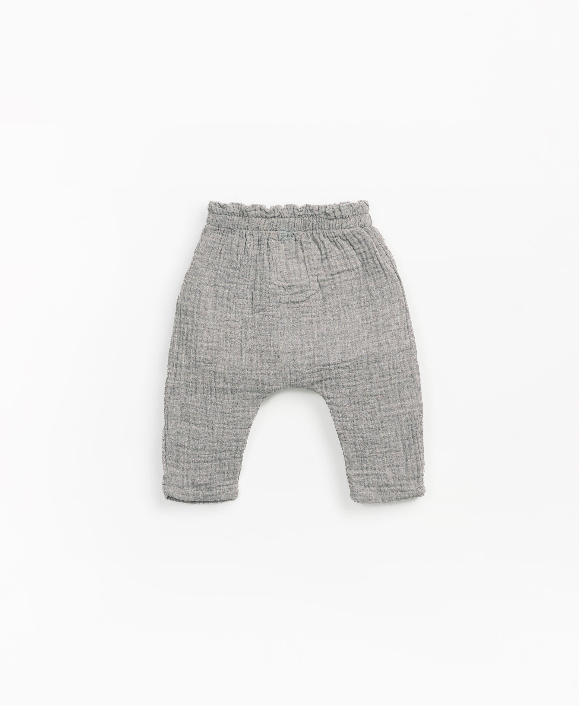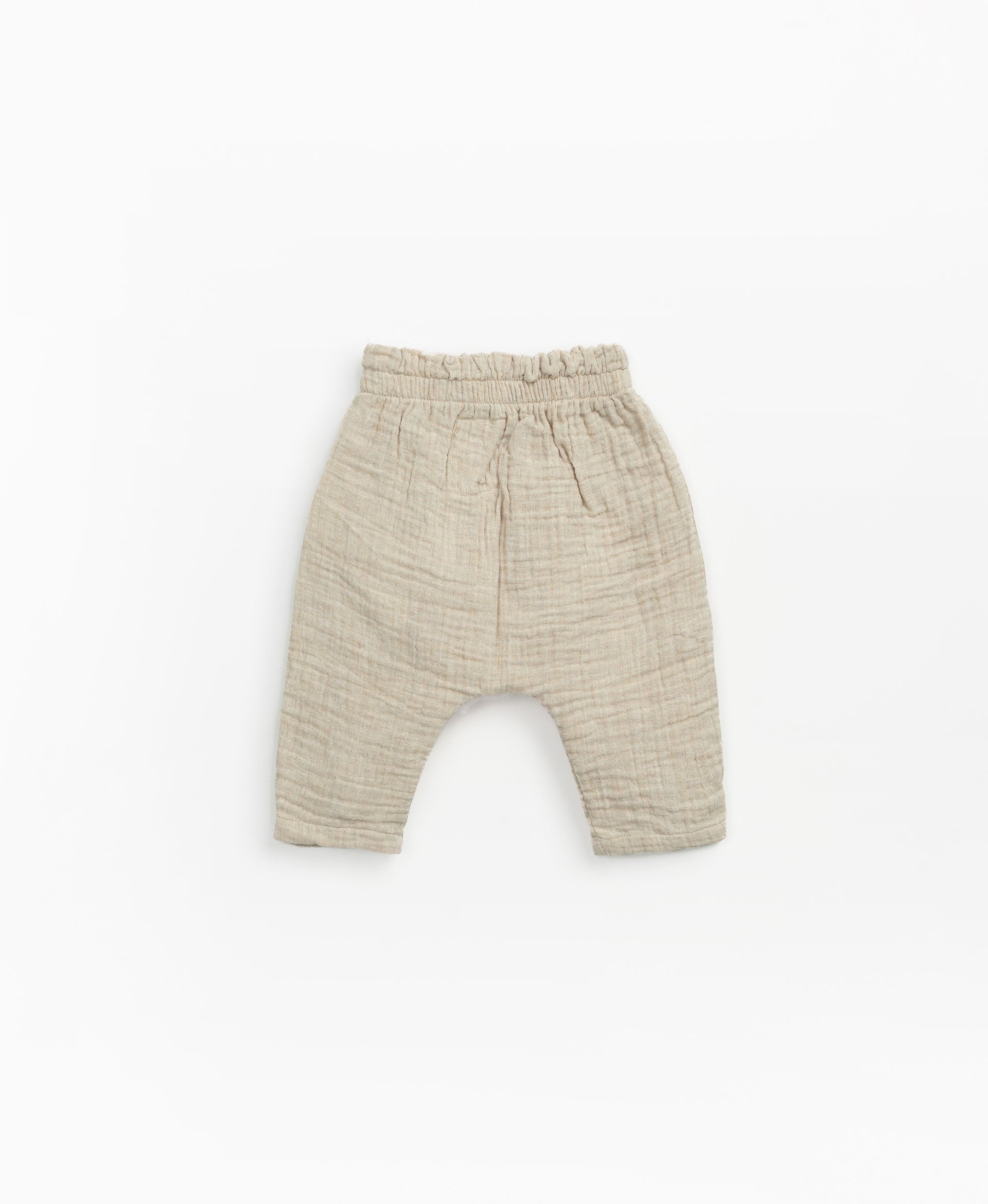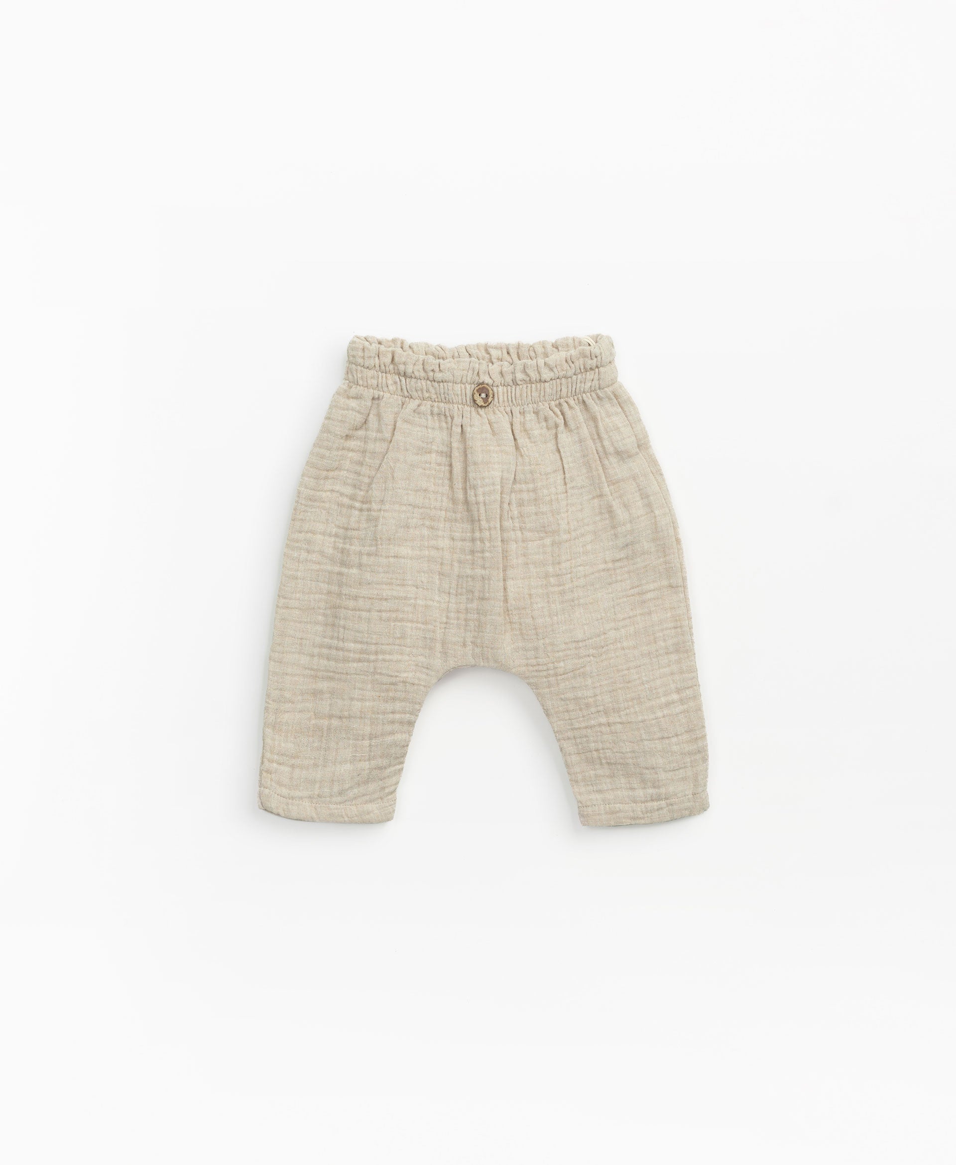 هذا البنطلون مصنوع من قماش القطن العضوي، لون عائلي. يتميز النموذج بمرونة وكشكشة عند الخصر وزر جوز الهند المزخرف.