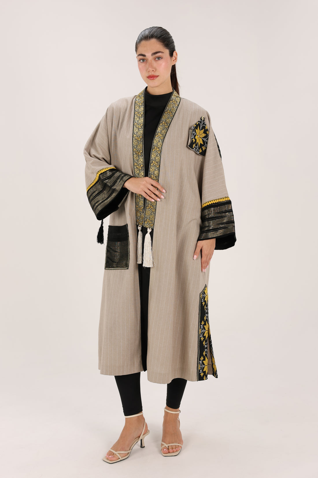 A handcrafted statement cardigan by May Khoury, blending contemporary silhouettes with traditional Arabian and Palestinian...