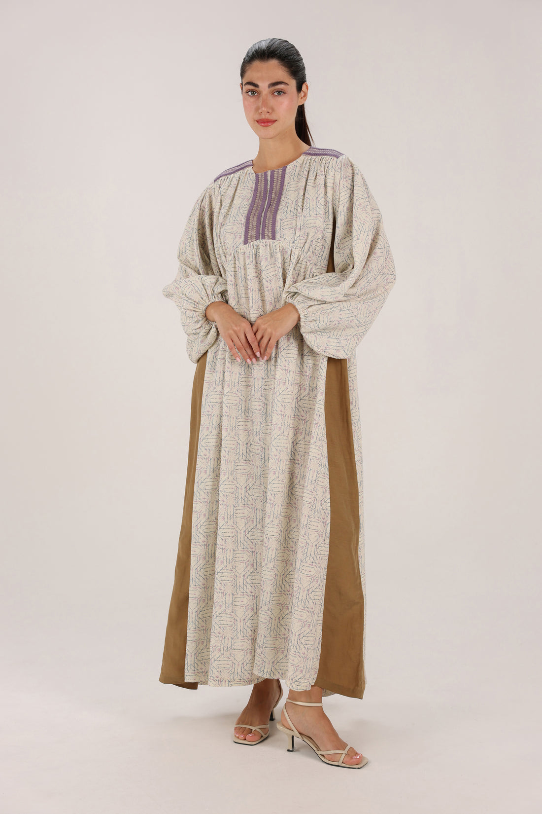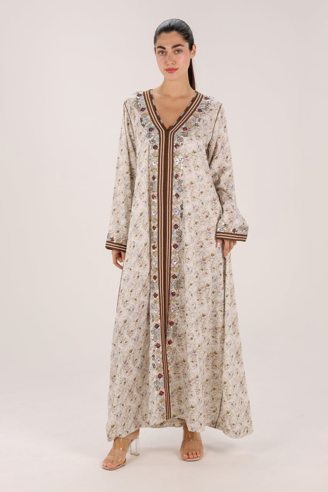 A light floral-printed cotton kaftan, handcrafted in Morocco. Finished with delicate Maalam embroidery, fine beading,...