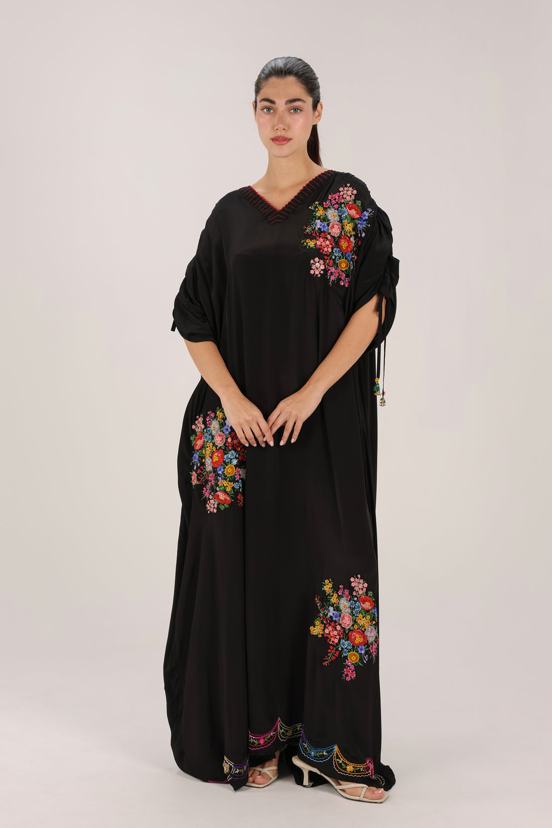 Handmade in India, this flowing black dress features delicate floral embroidery placed thoughtfully across the...