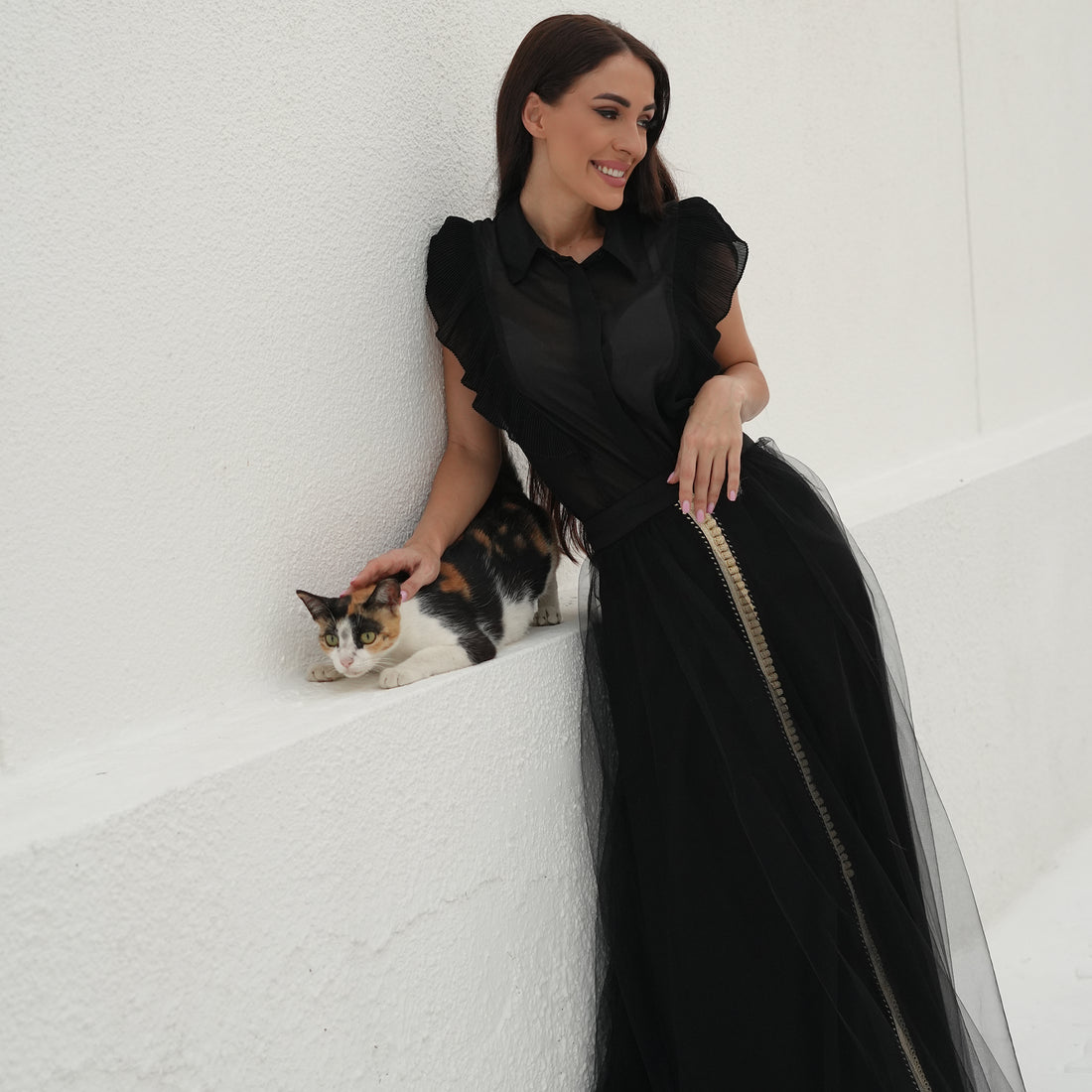 Unveil your elegance with our exquisite black tulle skirt adorned with intricate Moroccan gold-thread embroidery...