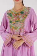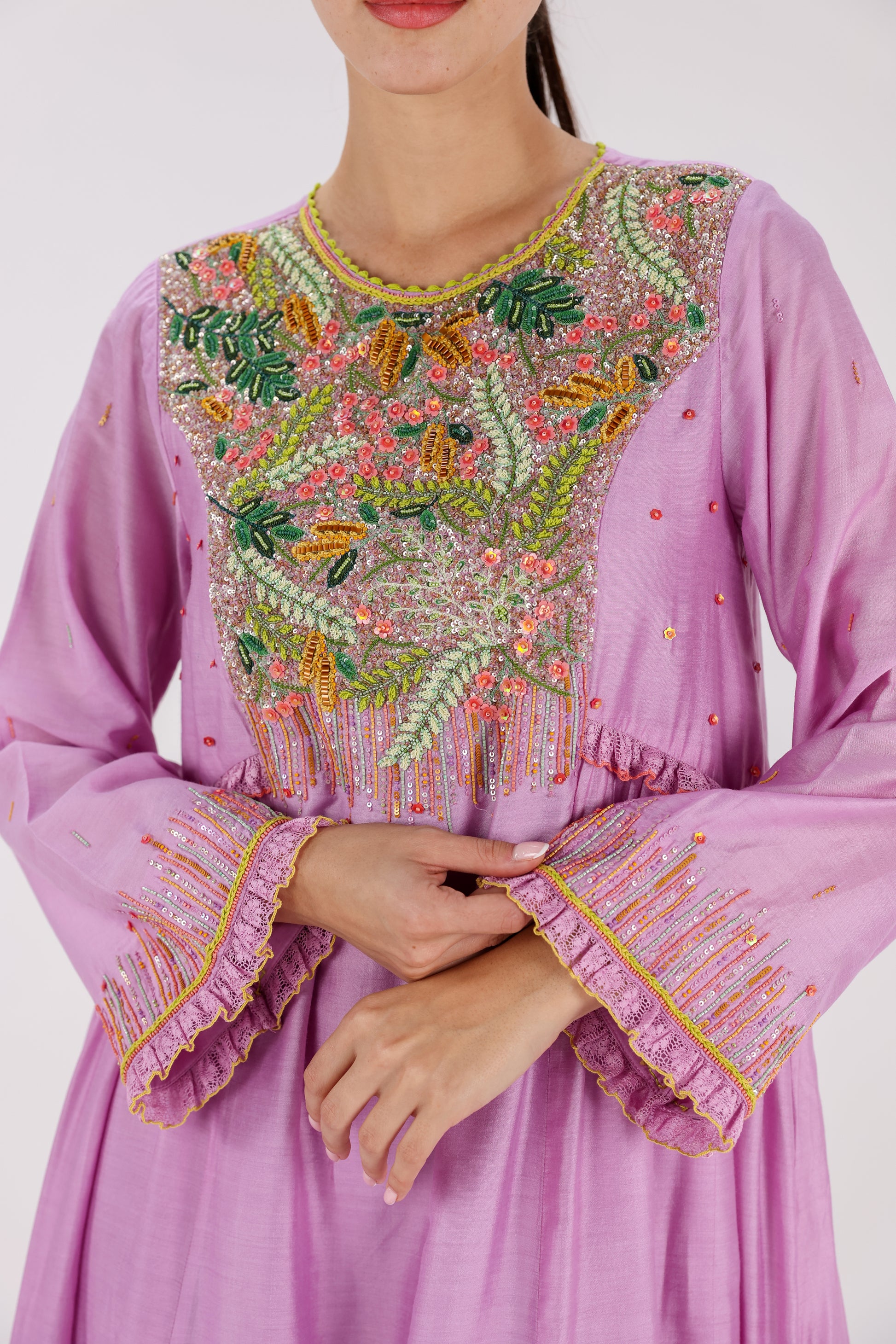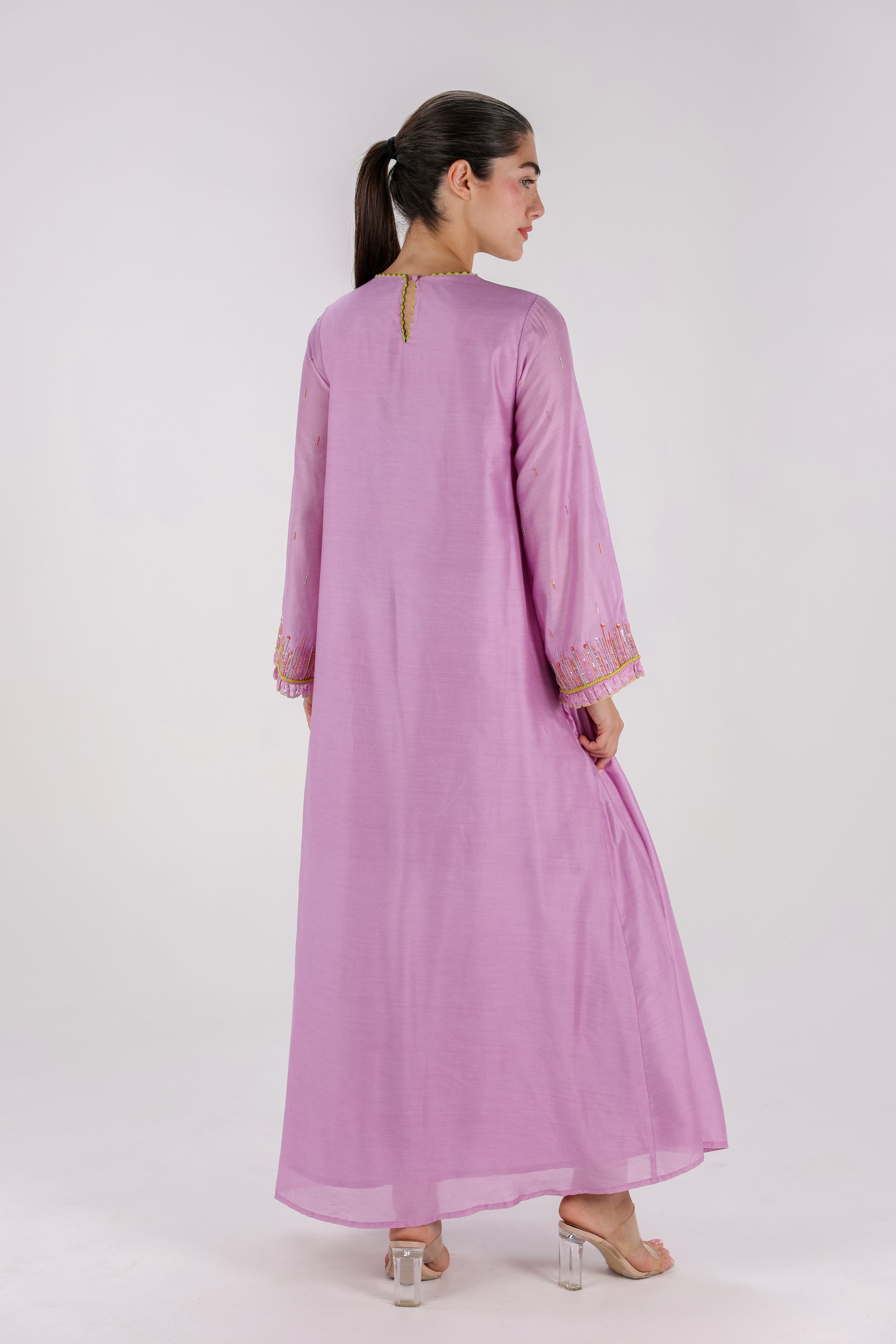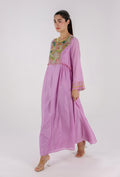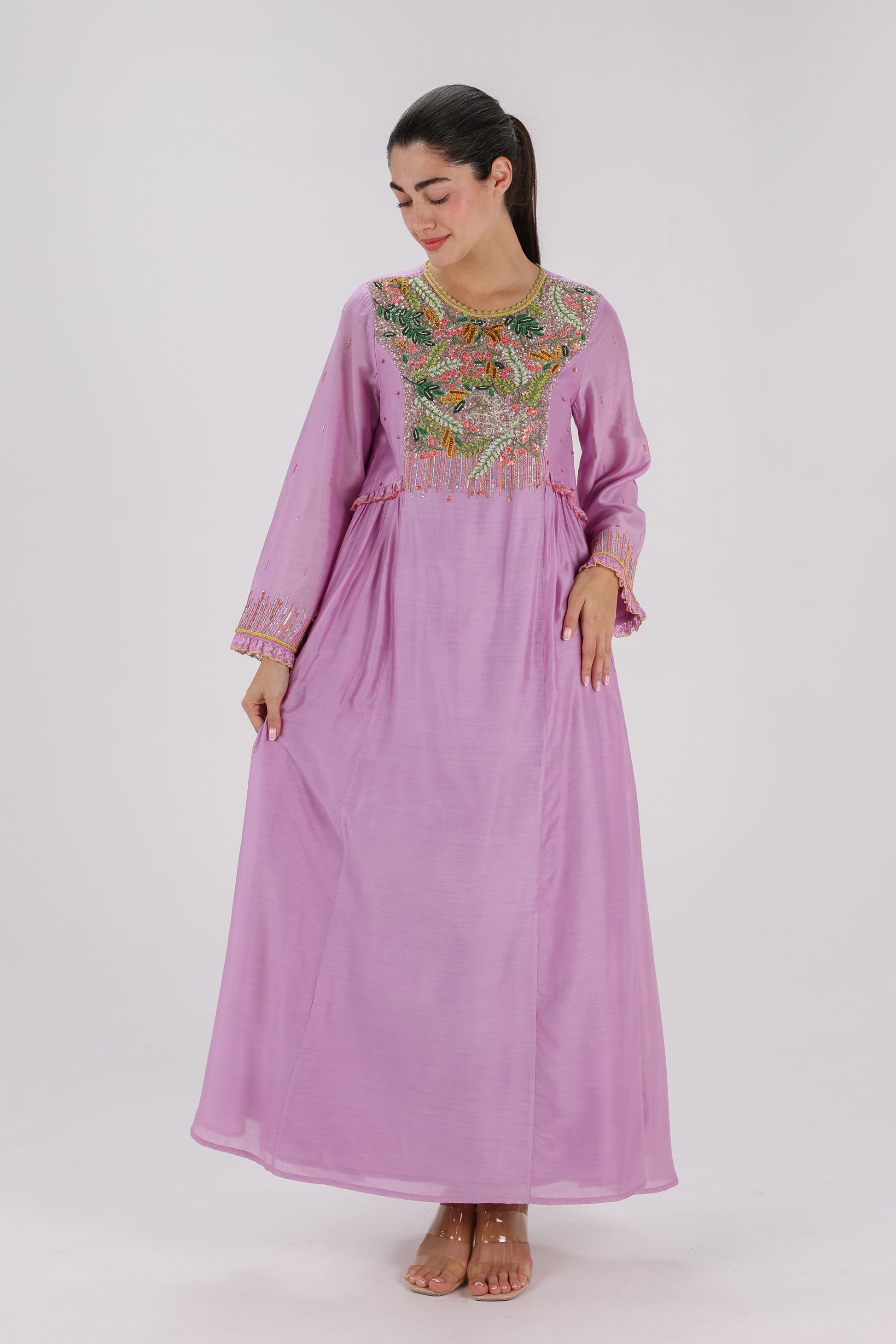 Inspired by the Ghaf tree — a symbol of resilience, generosity, and life in the desert — this handcrafted dress celebrates nature through intricate artisan embroidery. Made in India, the dress features a soft lilac base adorned with detailed hand embroidery across the bodice, echoing organic leaf and branch motifs in rich, earthy tones.