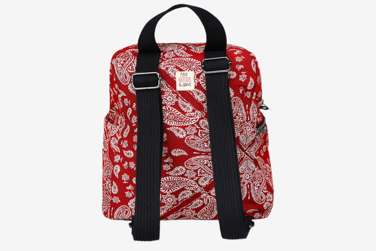 Our statement woven backpack includes waterproof lining, outer pockets on both sides, zipper closure, 2 interior pockets, 1 top handle and adjustable straps in the back.