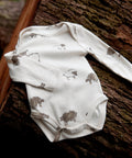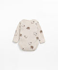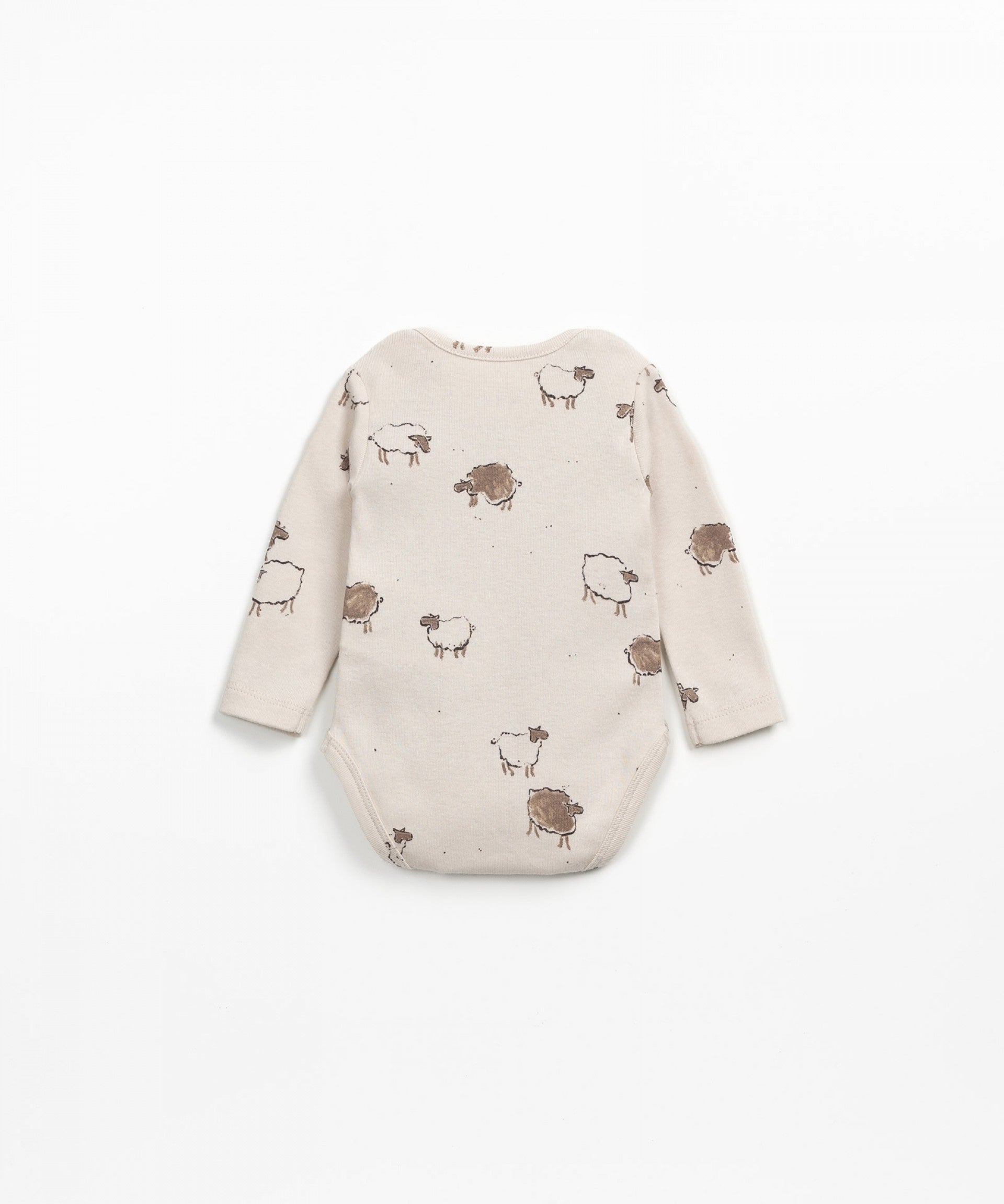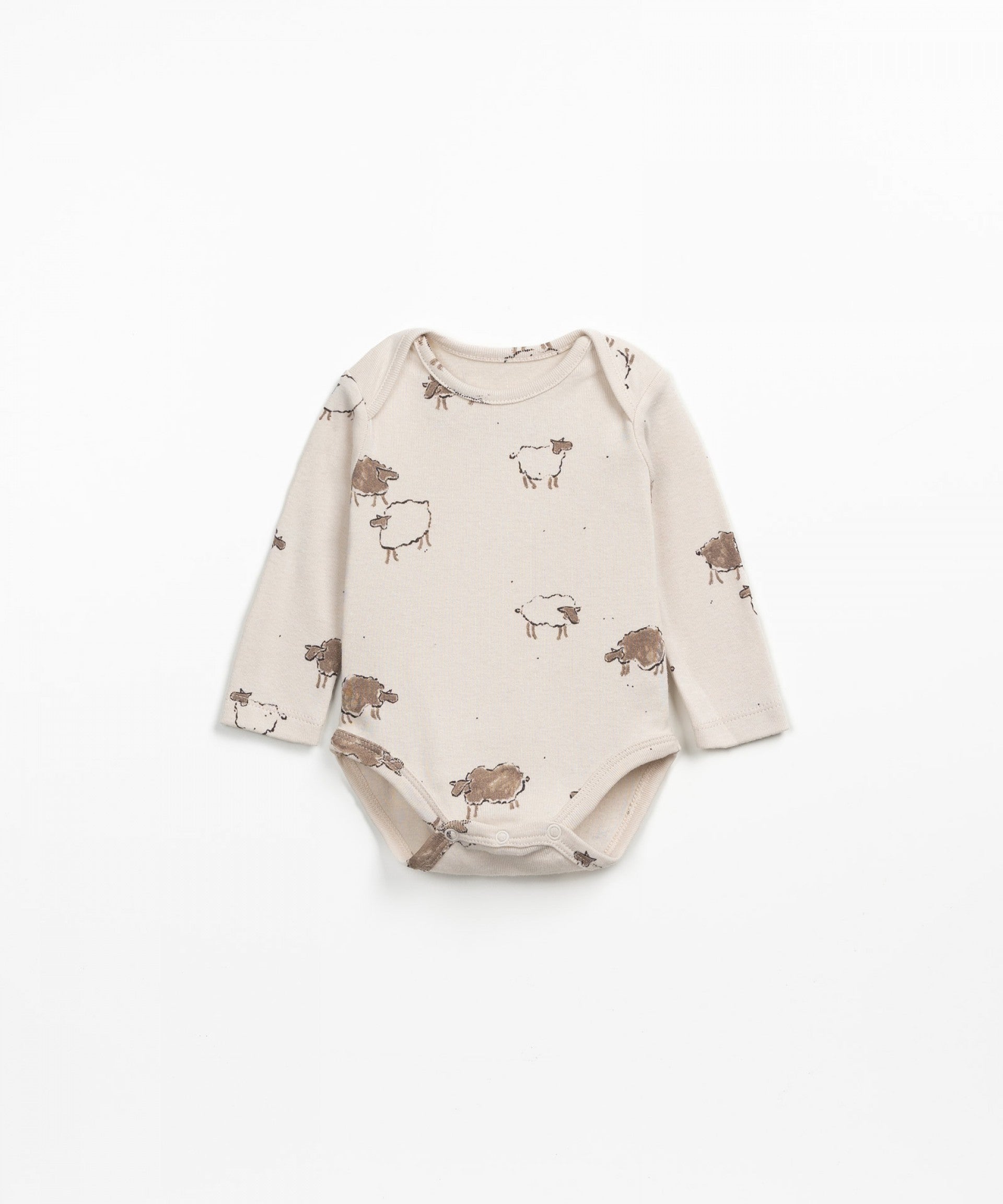 This jersey bodysuit is made from a mixture of organic cotton and recycled cotton, So-So color. The model has an elastic neckline, a crotch opening with nickel-free metal snaps and our sheep print