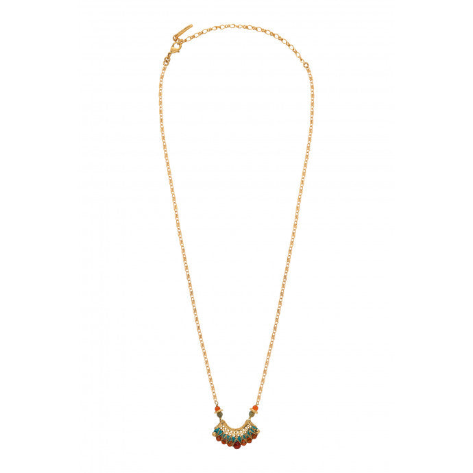 Are you looking for a necklace with character in an-trend, festive style? Opt for this elegant pendant necklace crafted in fine gold-plated metal and coloured gemstones. Carnelian, citrine and chrysocolla beads impart the ethnic style that has characterises Satellite in this necklace.