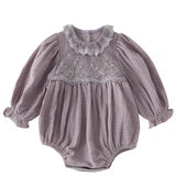 A delicate charm blows across this waffle cotton gauze dress, enhanced by an embroidered bib and a scalloped tulle collar. Its soft and enveloping grayish lavender hue makes it an ideal piece for precious moments.