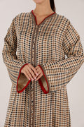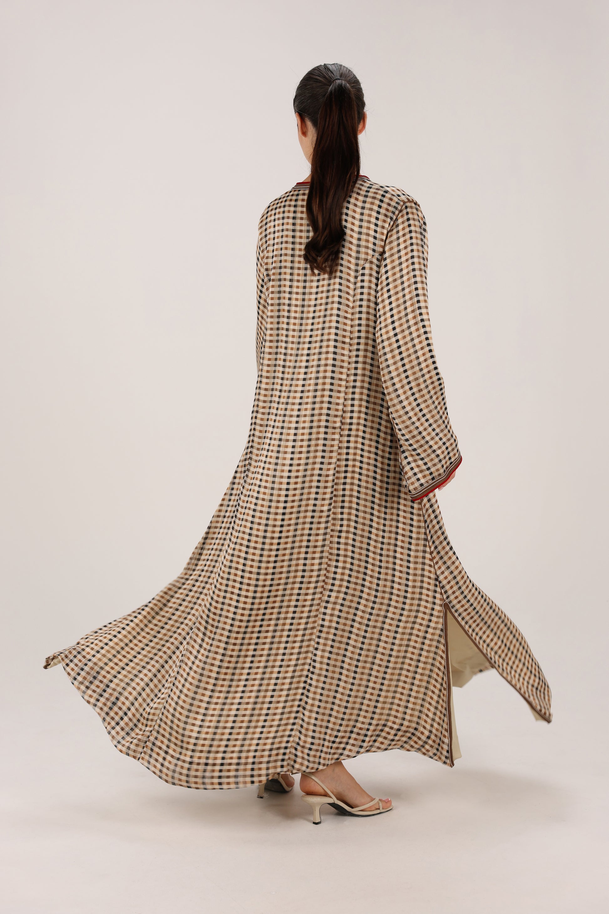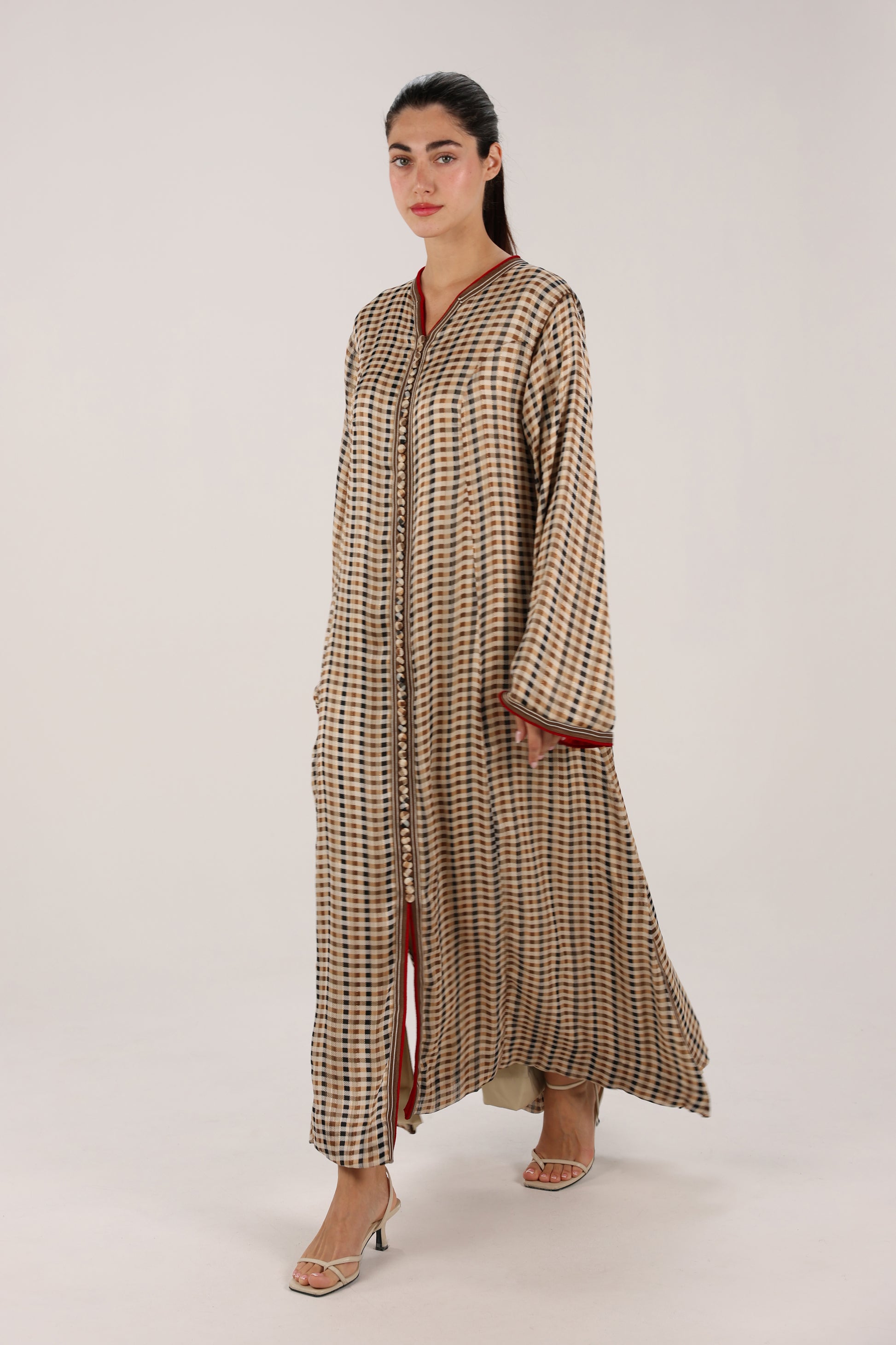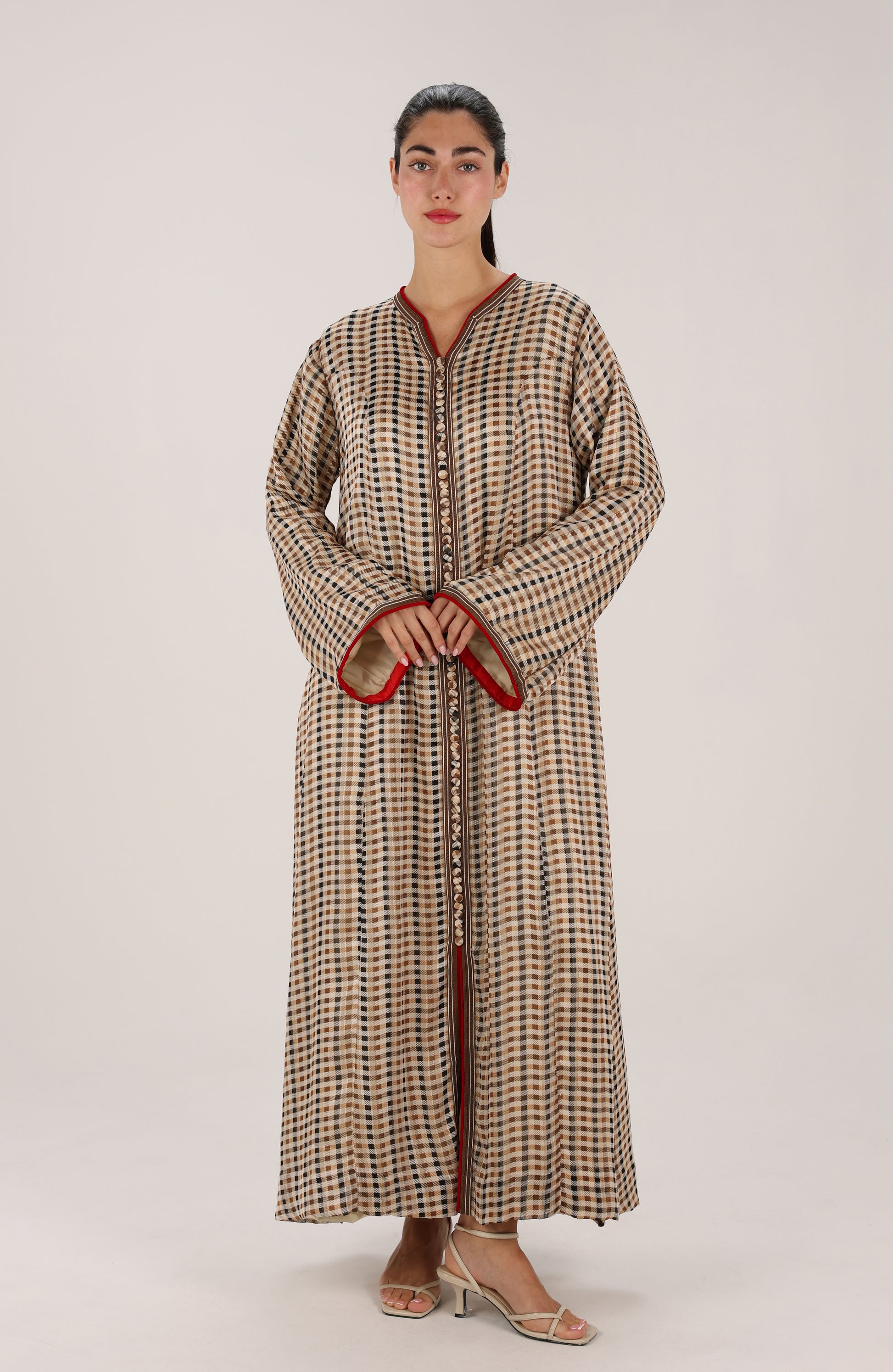 Handmade by Moroccan designer Bouchra Fe Laïli in Casablanca, this flowing dress blends warm brown tones with deep red accents in a timeless check pattern. The contrast piping and buttoned front add subtle structure, while the relaxed silhouette keeps it effortlessly elegant. A refined piece that celebrates craftsmanship, tradition, and everyday wearability.