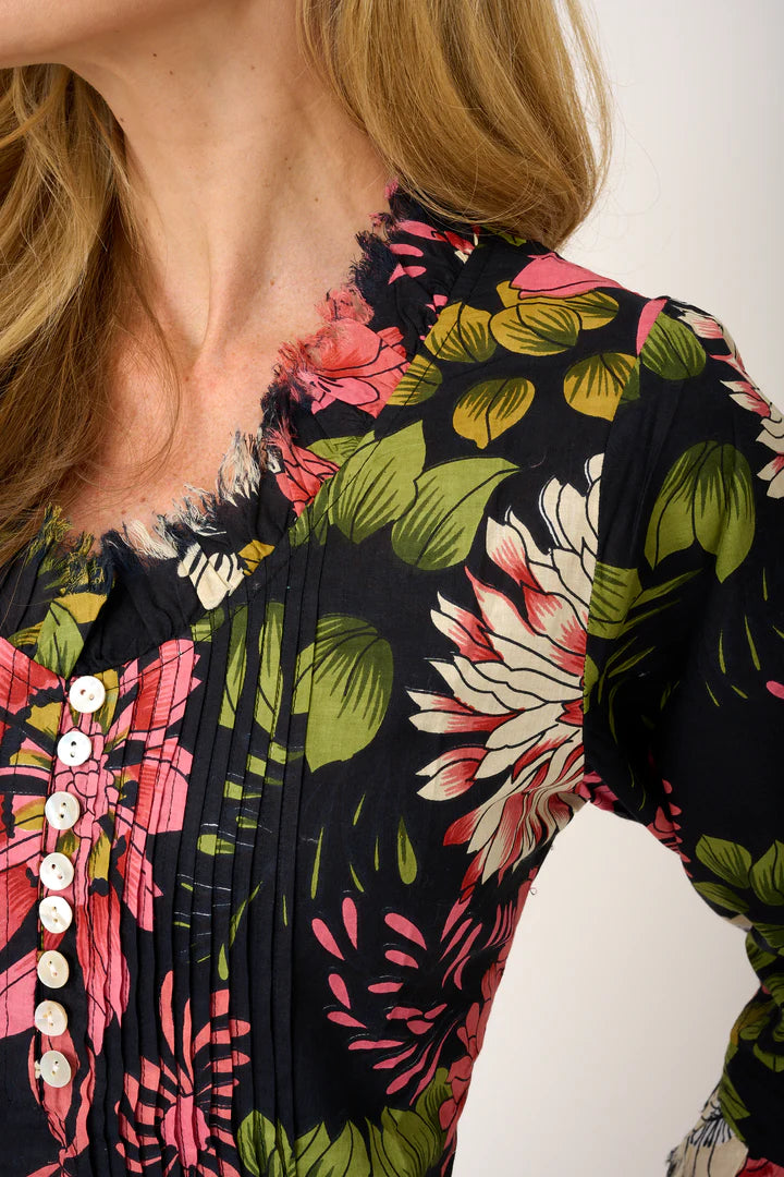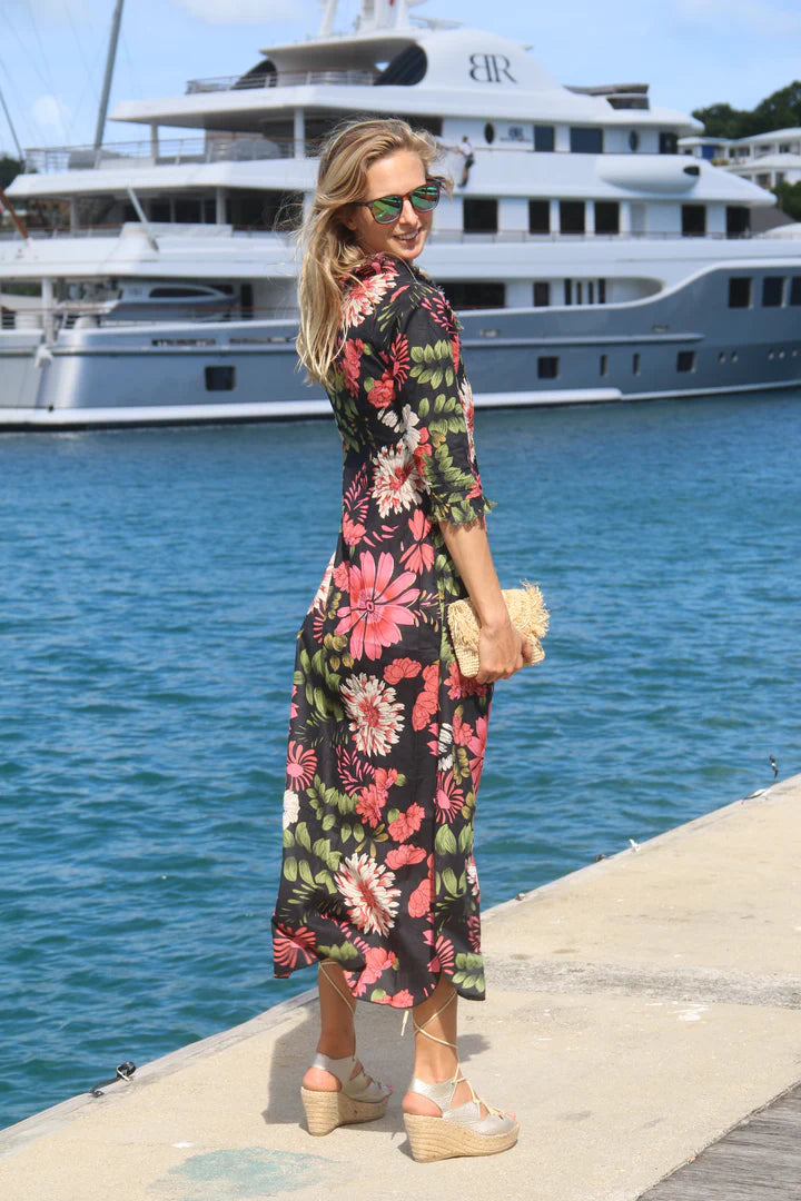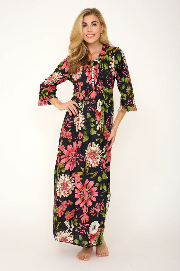 Our Annabel Maxi is a timeless best-selling dress! In beautiful new prints, patterns and colours each year! This dress is tailored to flatter all shapes, sizes and ages. The Annabel maxi is so easy to wear, looks very chic worn over a swimsuit or can be dressed up to wear out for dinner on a hot evening! Fun, light, comfy and flattering, this dress is the perfect summer staple! Featuring functioning buttons and super pretty frilled detailing on the neckline and cuffs.