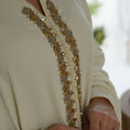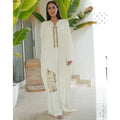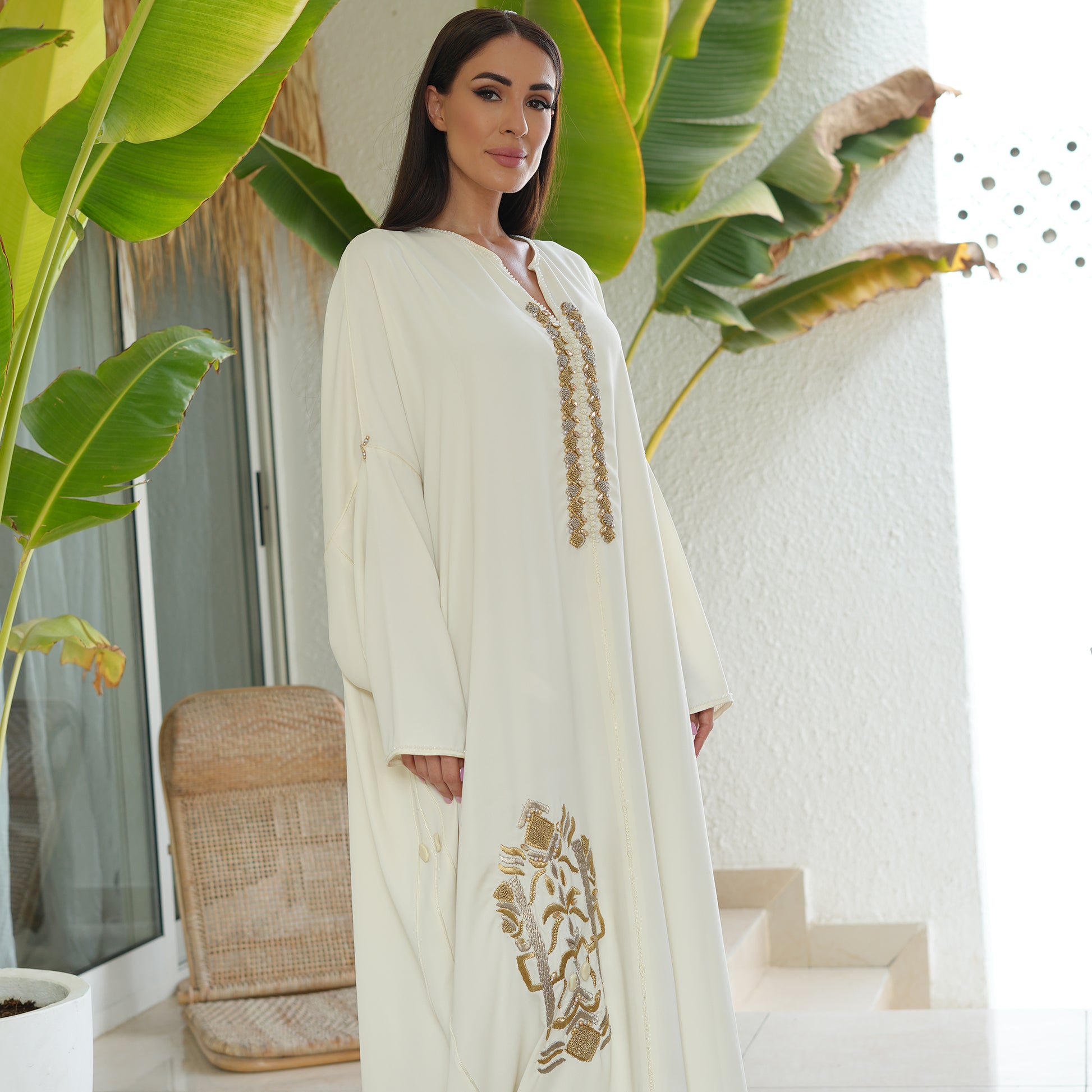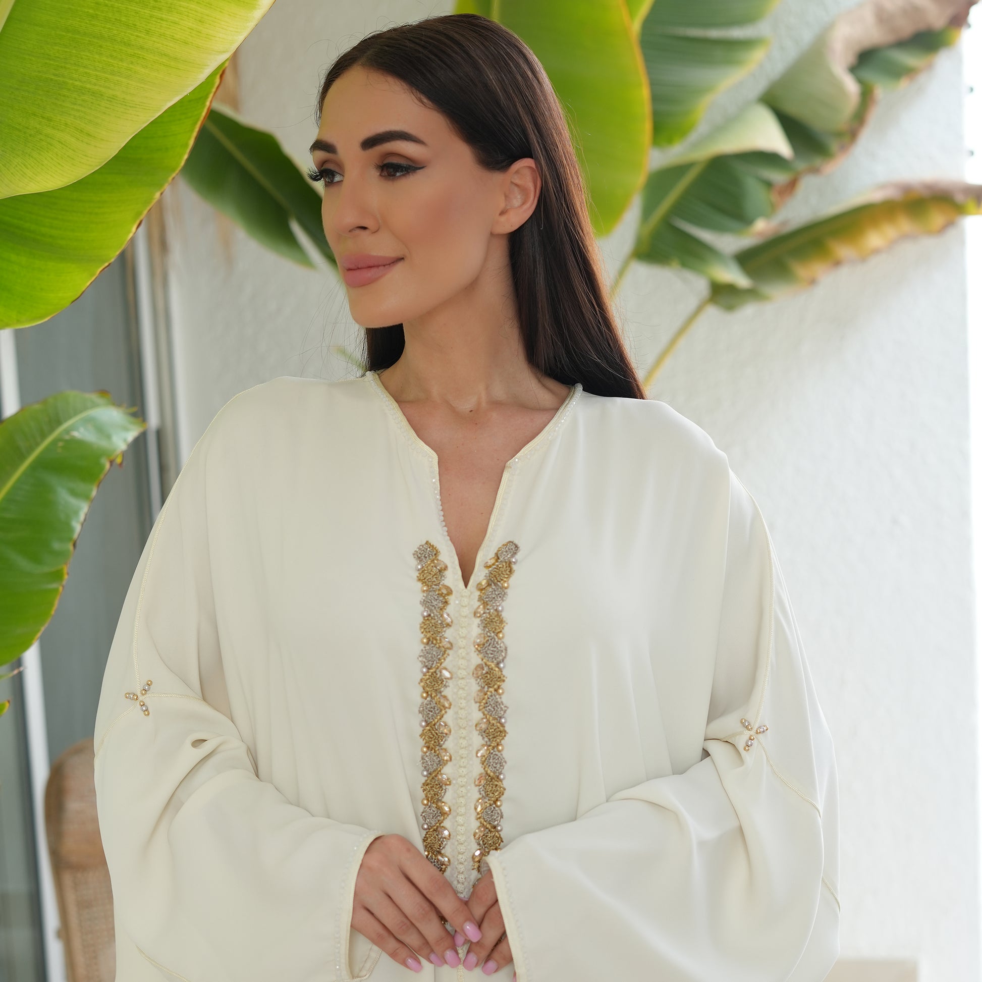 a handmade masterpiece by Moroccan designer Bouchra Filali Lahlou, meticulously crafted by Moroccan artisans. These exquisite pieces are more than garments; they are perfect for special events, gatherings, or as cherished gifts for your beloved bride. Djellaba Blanche embodies the timeless beauty of Moroccan tradition and artisanal craftsmanship. Whether worn for a special occasion or as an everyday statement piece, it exudes sophistication and cultural richness. Embrace the elegance of Djellaba Blanche and celebrate the allure of Moroccan artistry.