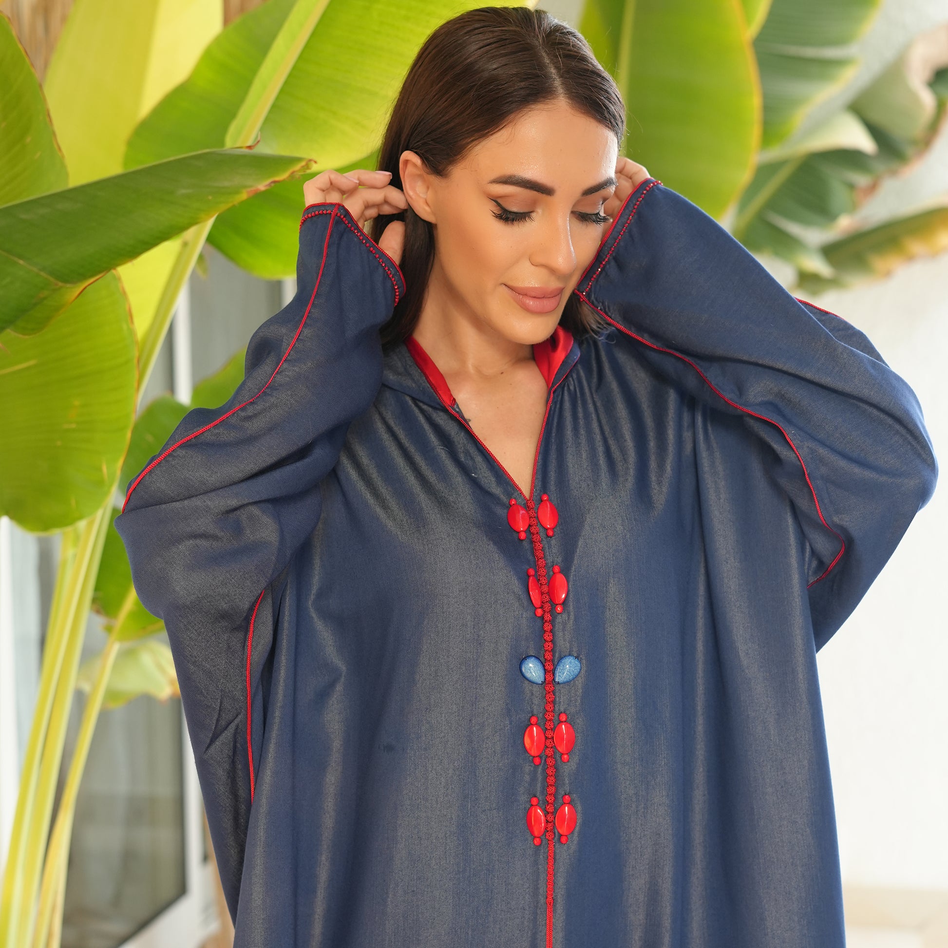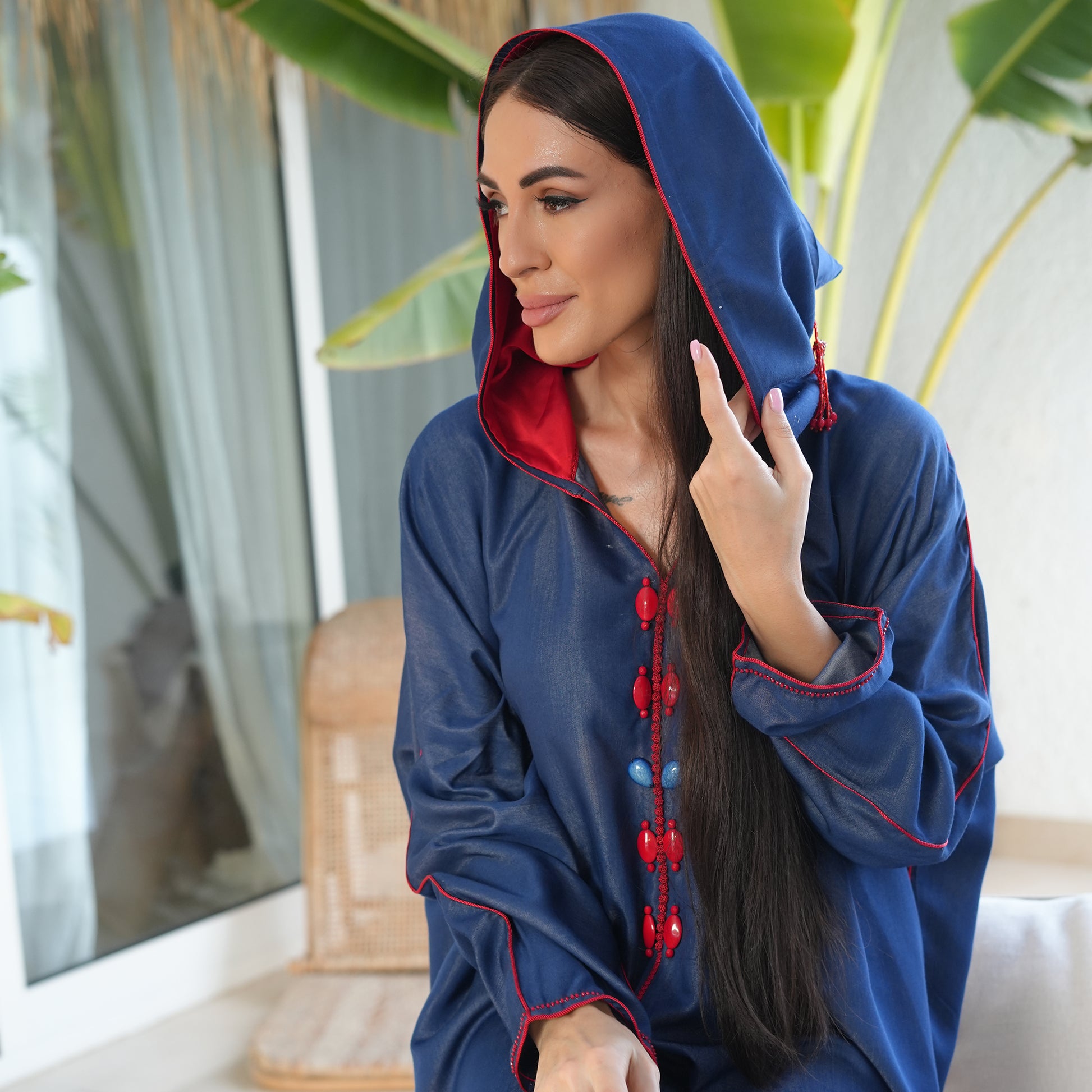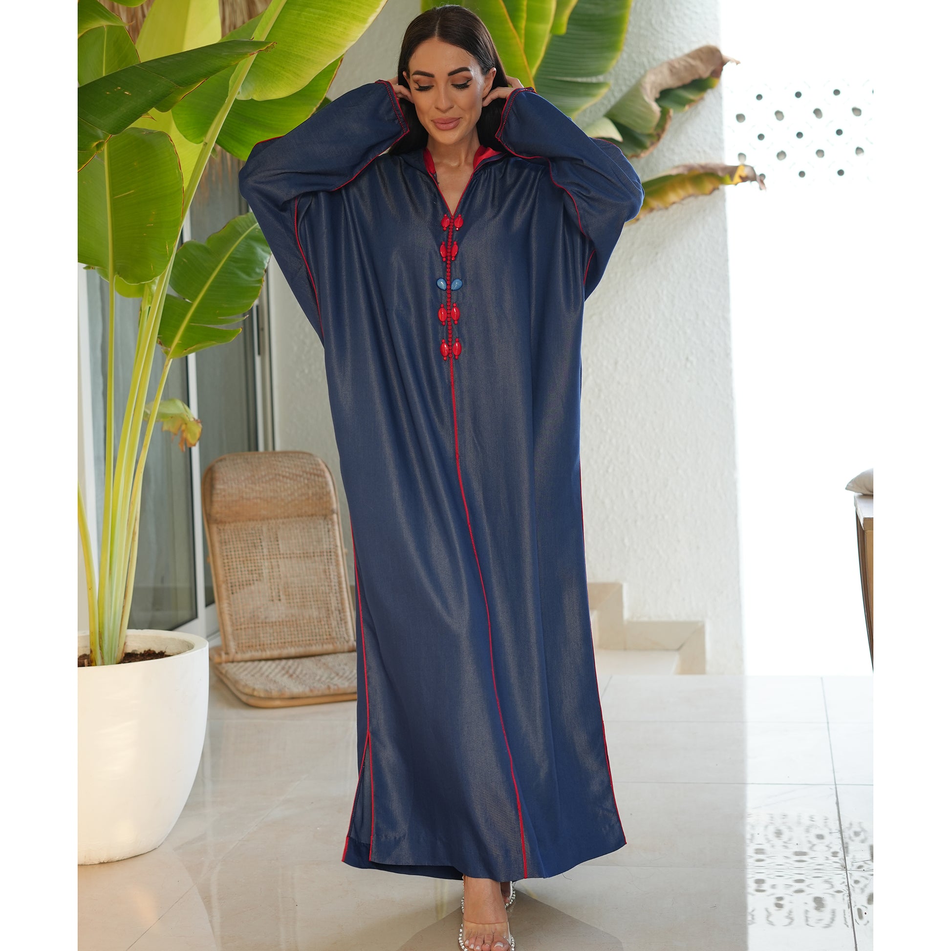 Introducing the Djellaba Jean's, a masterpiece by renowned designer BOUCHRA FILALI LAHLOU, handcrafted in Casablanca, Morocco. This exquisite garment seamlessly combines Moroccan tradition with modern elegance, offering a unique style that celebrates heritage and individuality. A lightweight, fashionable Djellaba that can be worn every day, for gatherings, or even gifted to your beloved one.